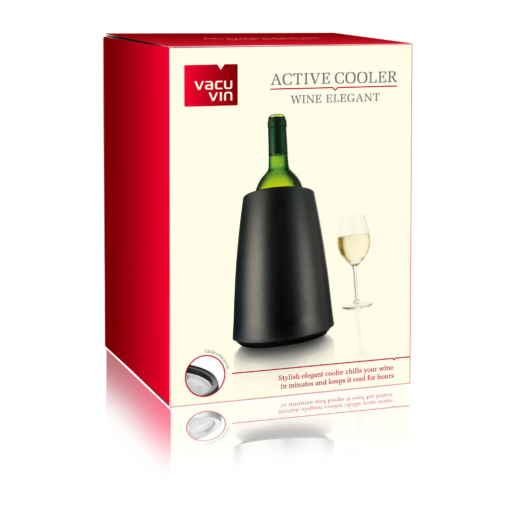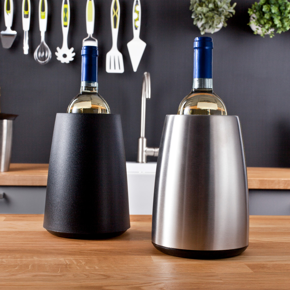 Pozwala na szybkie schłodzenie butelki wina. Wystarczy 5 minut i odpowiednio niska temperatura utrzymuje się wiele godzin-bez lodu!. Wykończenie czarne tworzywo. Elementy chłodzące należy przechowywać przed użyciem w zamrażarce.