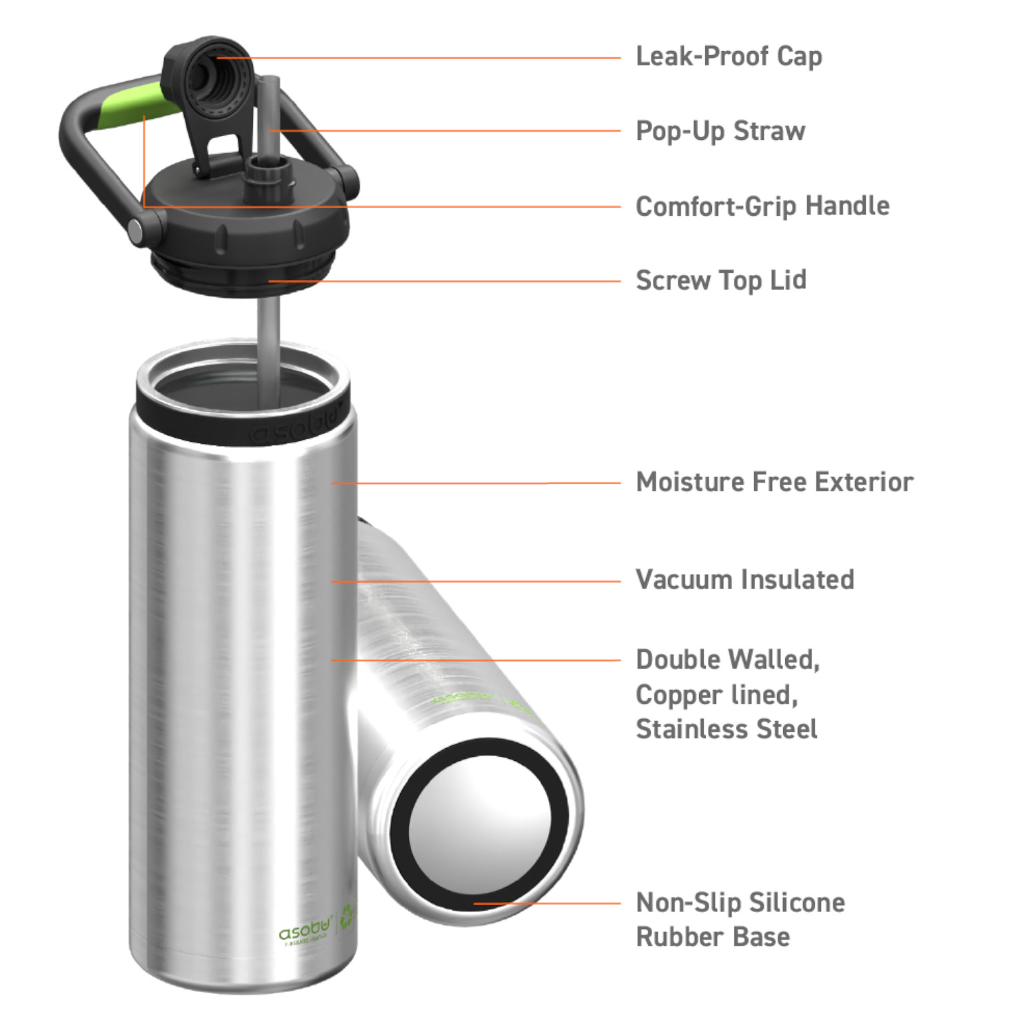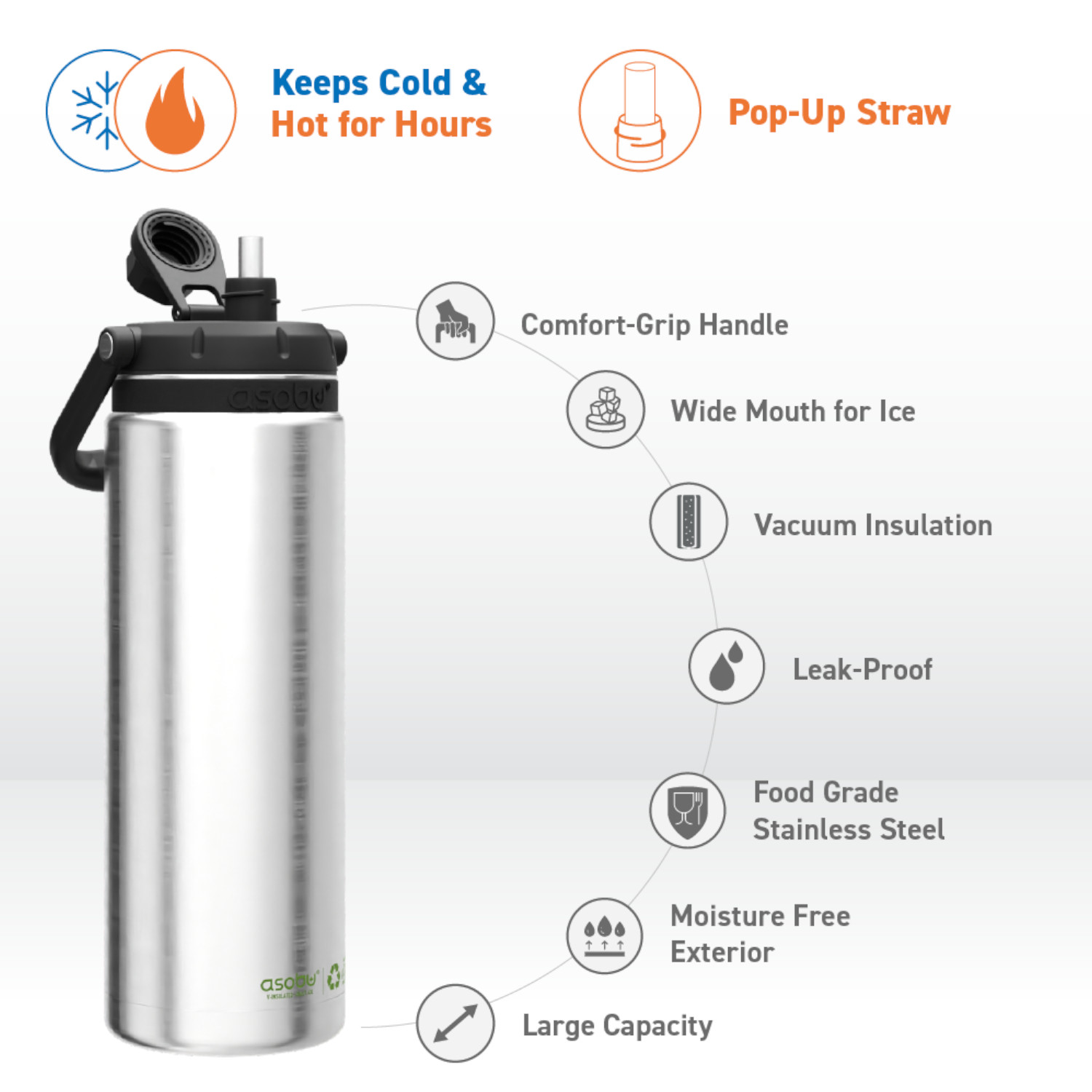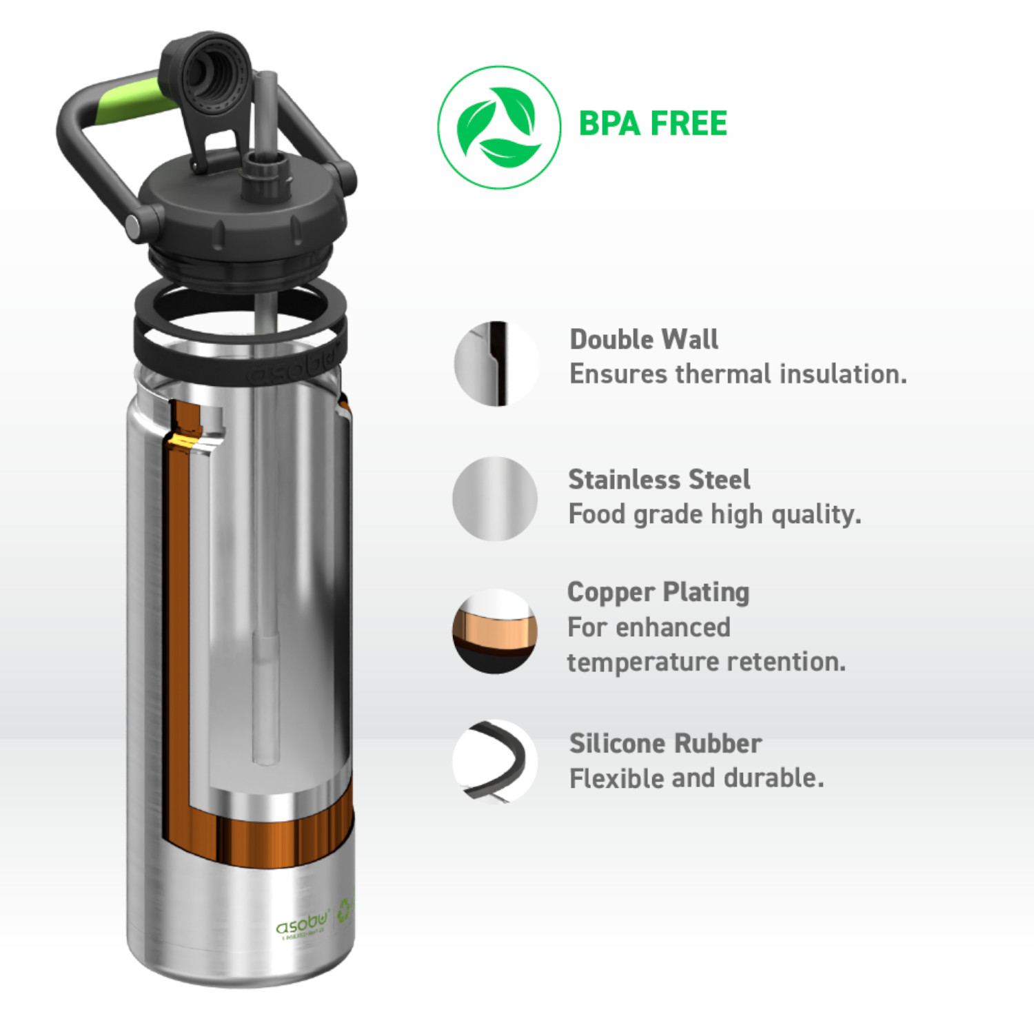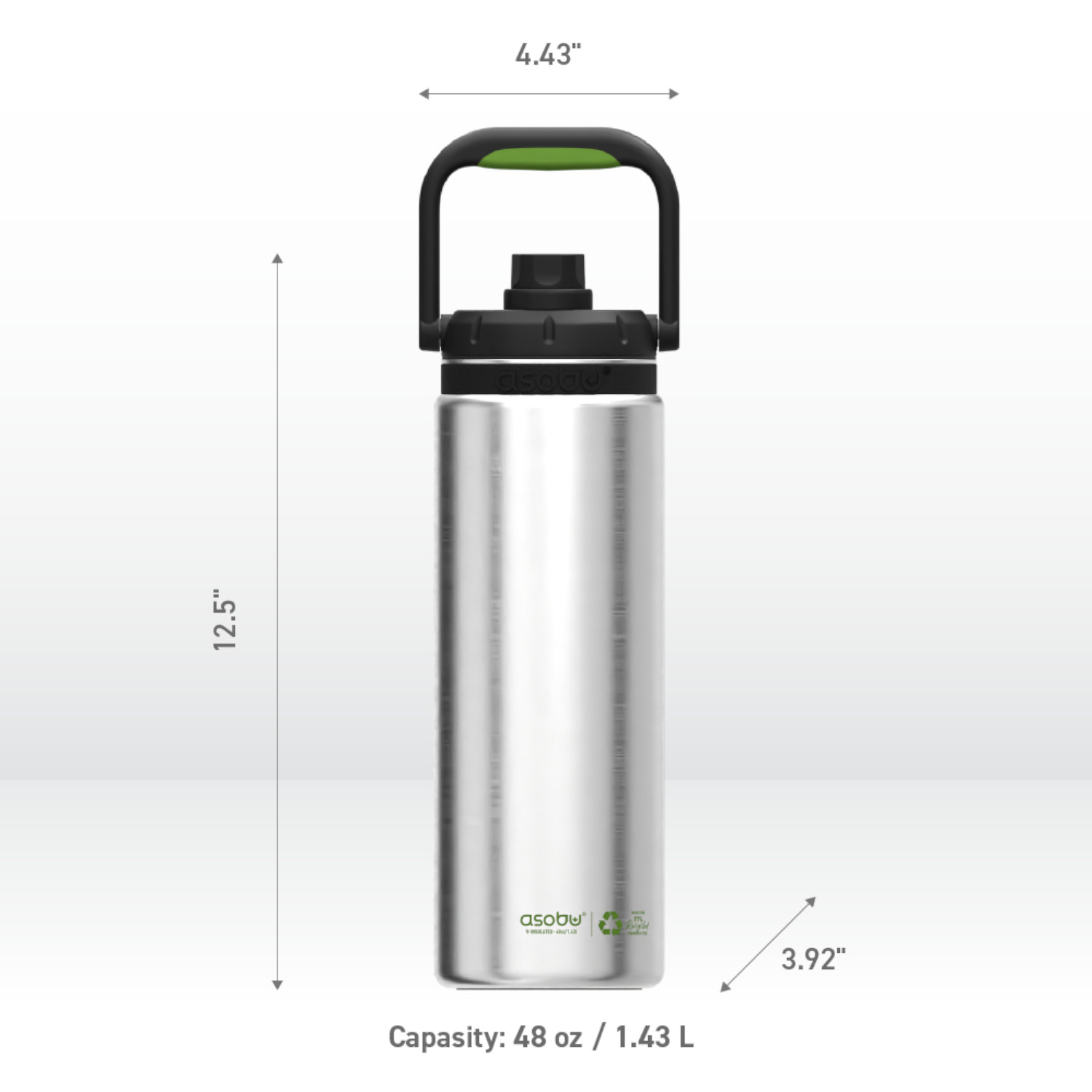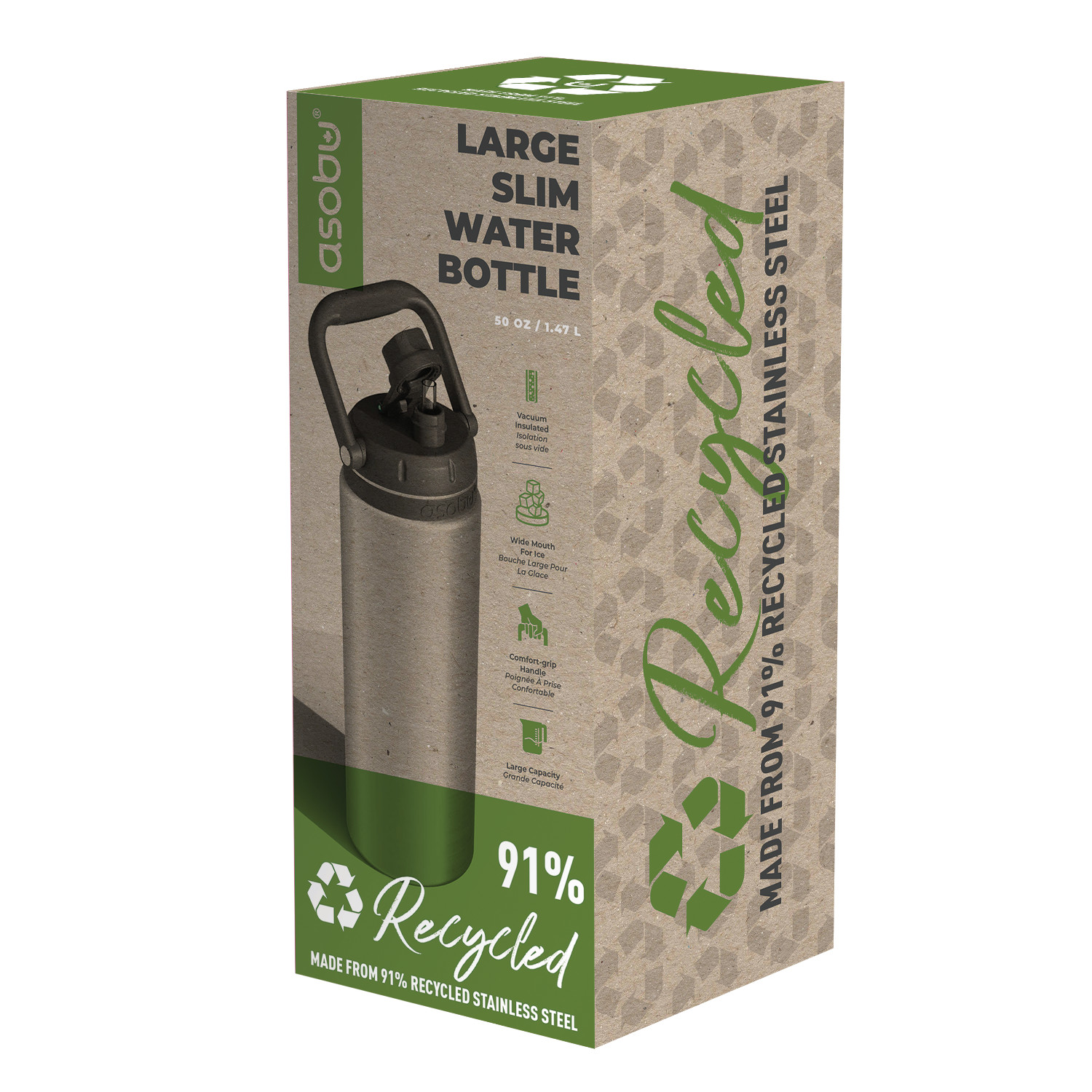 Z butelką ASOBU termiczną THE CANYON JUG RECYCLE, 1,48L zadbasz nie tylko o swoje nawodnienie, ale też o środowisko. Korpus butelki został wykonany w 91% ze stali z odzysku. Zadbaj o nawodnienie nawet podczas długiej wędrówki z butelką ASOBU THE CANYON JUG o pojemności aż 1,48L! Butelka Canyon jest łatwa do przenoszenia dzięki wygodnemu, odpowiednio dużemu uchwytowi z miękką w dotyku wkładką typu soft-touch na spodzie rączki. Nie musisz odwracać jej do góry dnem, aby się napić, ponieważ wewnątrz jest wysuwana słomka! Antypoślizgowa podstawa z gumy silikonowej zapobiega przypadkowemu ześliźnięciu się butelki (i hałasowaniu po jej odłożeniu). W trosce o środowisko i zdrowie produkty ASOBU wykonane są z trwałych i bezpiecznych materiałów jak stal nierdzewna 304 i 316, tritan i tworzywa BPA FREE. Tworzywo BPA Free oznacza, że jest bezpieczne i wolne od szkodliwych substancji. Dwuścienna konstrukcja butelek/termosów nie tylko dłużej utrzymuje temperaturę, ale też zapobiega kondensacji. Dwuścienne ścianki wewnątrz są pokryte dodatkowo miedzią dla jeszcze lepszej izolacji. Zalecenia: – Przed pierwszym użyciem umyj wszystkie elementy naczynia ręcznie. – Przed napełnieniem, zimnym lub gorącym płynem zaleca się butelkę przepłukać odpowiednio zimną lub gorącą wodą. – Pij ostrożnie z butelki szczególnie jeśli została napełniona gorącym płynem! Uwaga: 1. Produkt nie jest odpowiedni dla dzieci. 2. Nie należy zamrażać lub podgrzewać butelki/termosu na płytach kuchennych, w piekarniku lub kuchence mikrofalowej, butelka służy do napełniania płynem i nie jest odpowiednim naczyniem do podgrzewania lub zamrażania. 3. Nie należy wlewać napojów gazowanych, produktów mlecznych i żywności dla dzieci ze względu na ryzyko rozwoju bakterii. 4. Butelka nie służy do przechowywania wody, czy innych płynów dłużej niż 24 godziny. 5. Wszystkie elementy butelek/termosów należy myć ręcznie, gąbką i płynem do naczyń. Umyte naczynie należy dokładnie osuszyć i pozostawić do doschnięcia w suchym dobrze wentylowanym miejscu. 6. Nie należy stosować agresywnych środków czyszczących takich jak chlor, wybielacz czy też soda. Materiał: stal nierdzewna 304 i 316, tworzywo BPA FREE, silikon, miedź. Przybliżone wymiary: wysokość – 32 cm, średnica – 11cm, pojemność: 1,43l. Przybliżone wymiary brutto: wysokość – 32,5cm, długość – 13cm, szerokość – 13,3cm. Przybliżona waga brutto: 0,858kg. Opakowanie: kartonowe pudełko prezentowe.