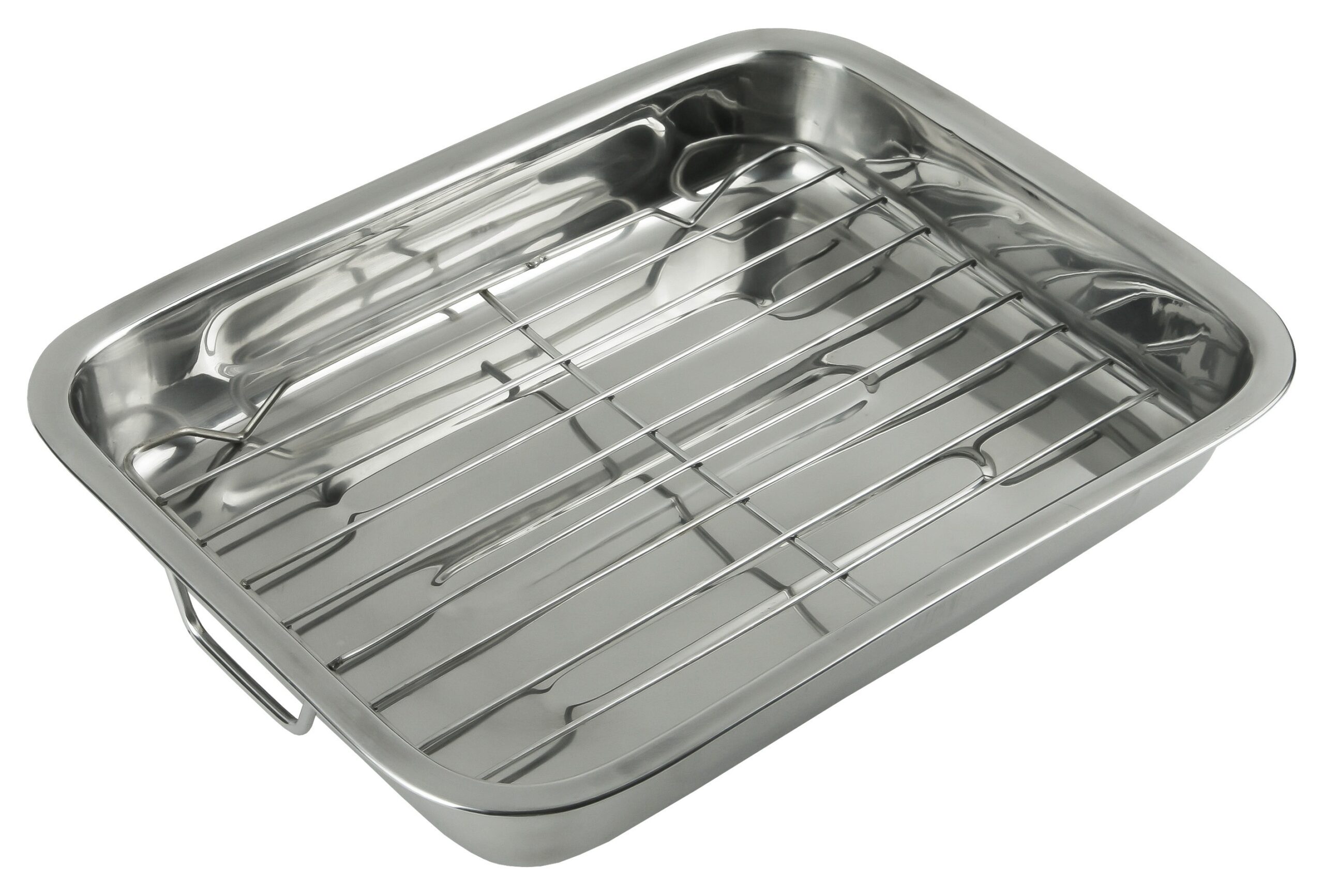 Trwała stalowa brytfanna do pieczenia, w komplecie z wyjmowanym rusztem. Do użytku na grillu lub w piekarniku.