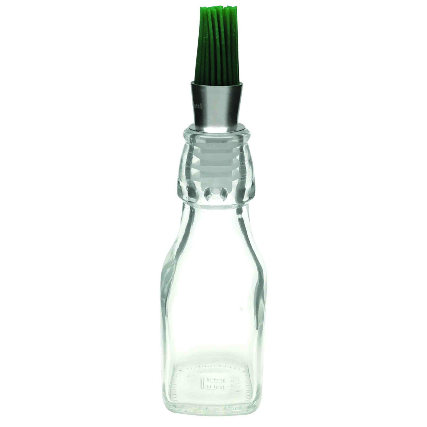 Szklana butelka o pojemności 125ml z nalewakiem wyposażonym w pędzelek do równego rozprowadzania oliwy. Można myć w zmywarce. Materiał: szkło, stal nierdzewna, silikon. Pojemność: 125ml. Wymiary brutto: 18,7x5x4,9cm. Wymiary netto: 18,7×4,9×4,9cm. Waga brutto: 0,228kg. Waga netto: 0,217kg.