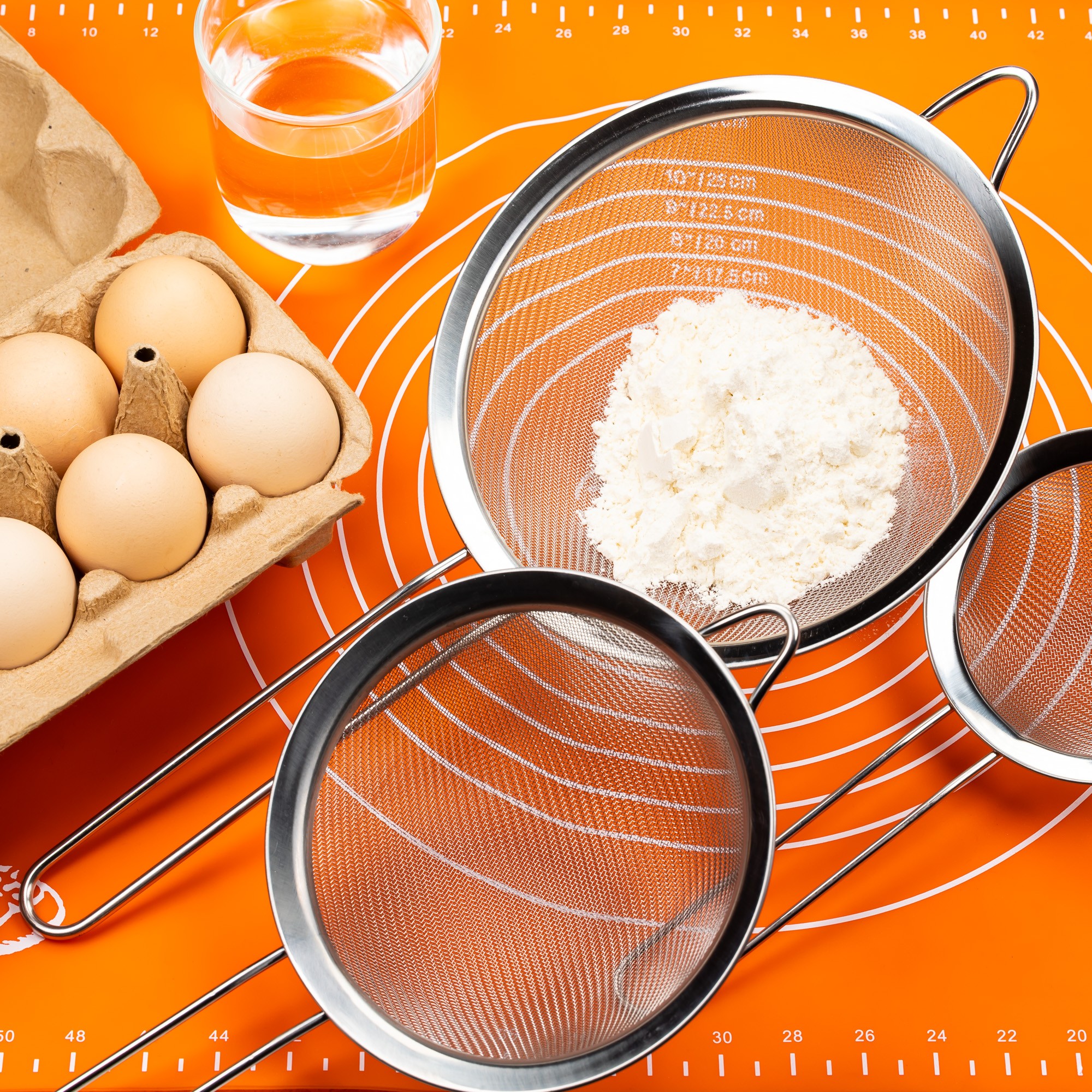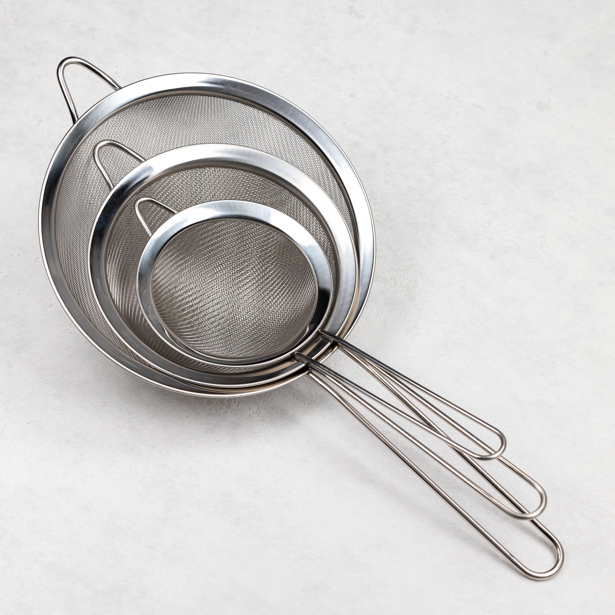 Zestaw sitek kuchennych wykonanych ze stali nierdzewnej. Przydatne do mąki, cukru pudru czy przecedzania wywarów.