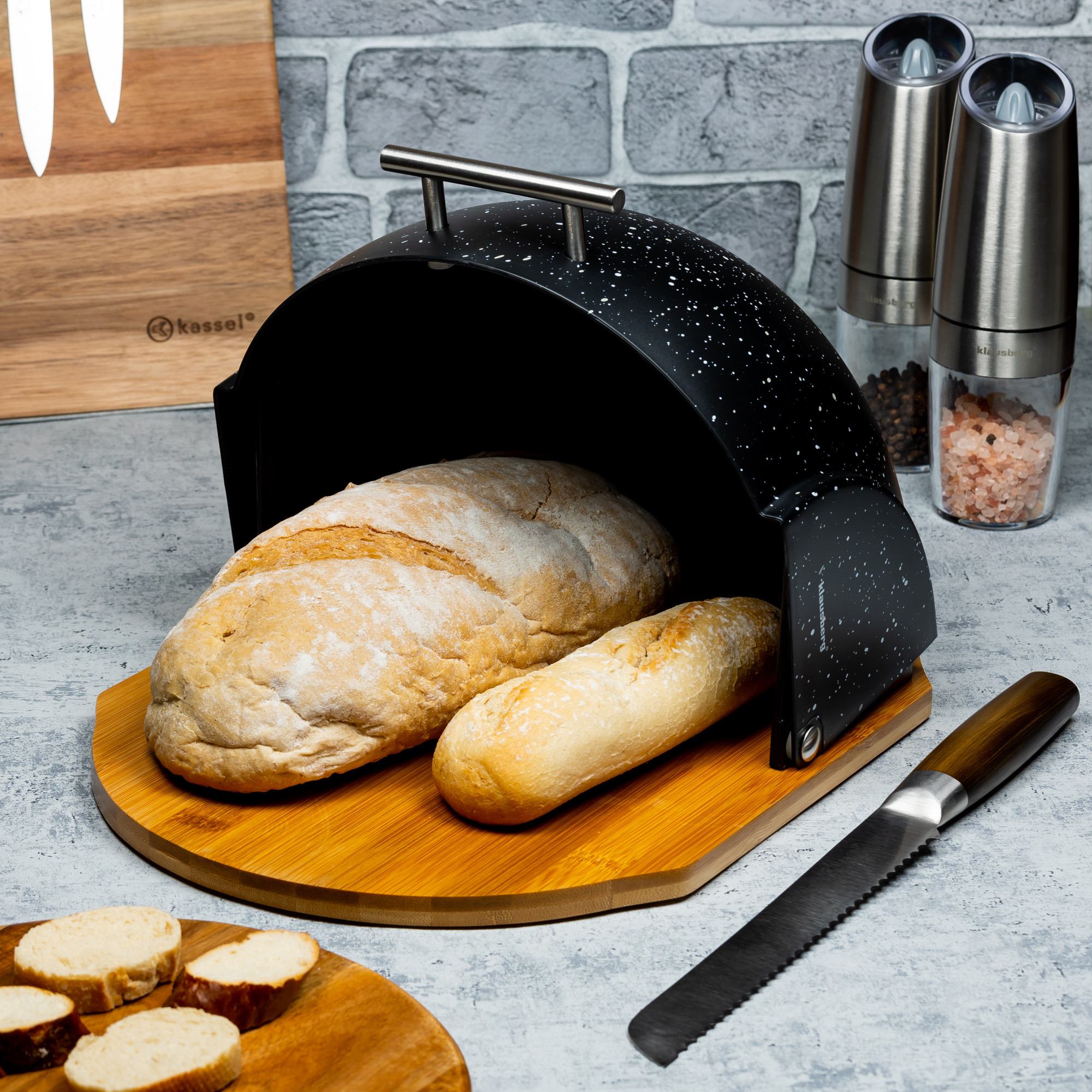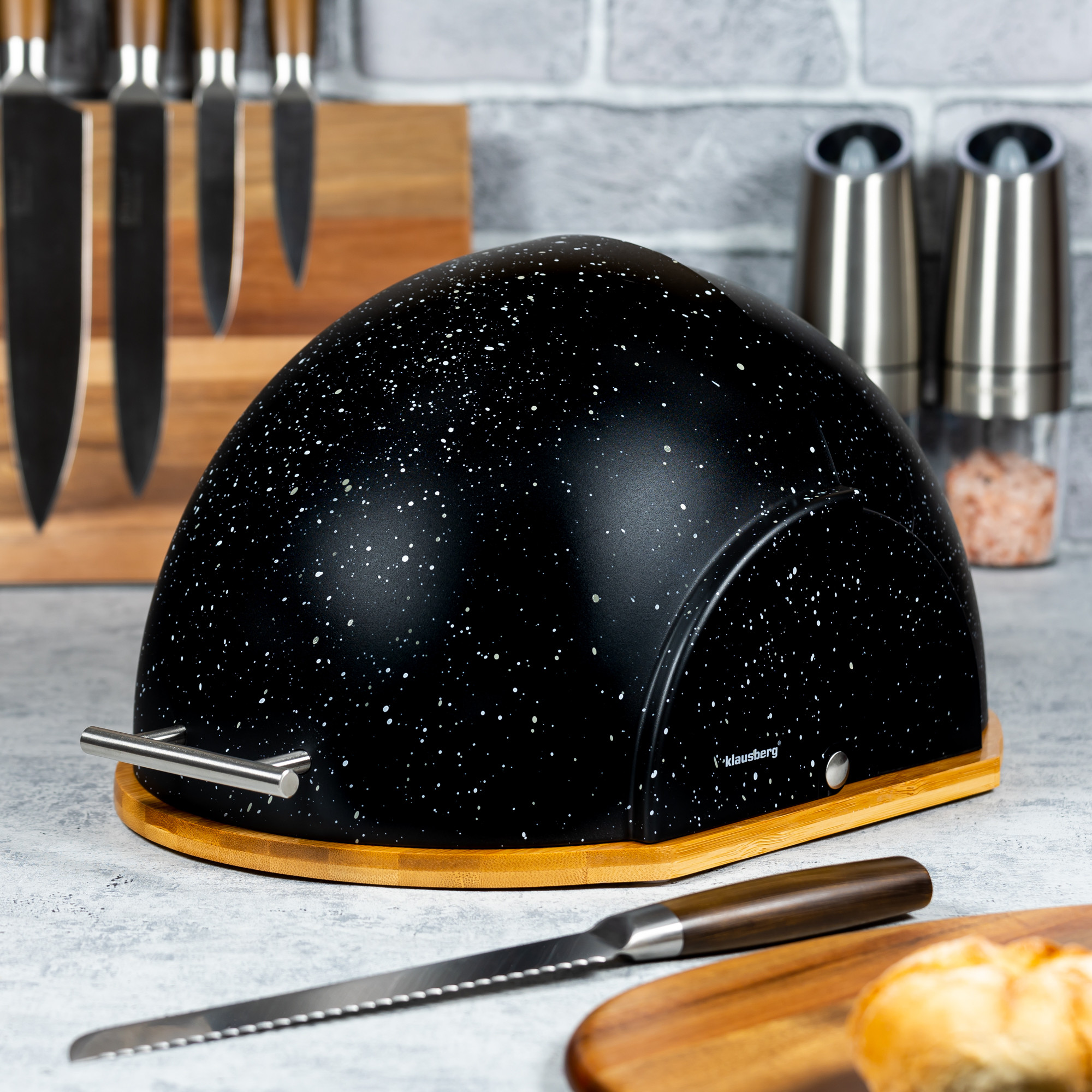 Chlebak Klausberg KB-7277 w czarnym marmurkowym wykończeniu to stylowy i praktyczny element wyposażenia, który zadba o świeżość pieczywa i doda charakteru Twojej kuchni.