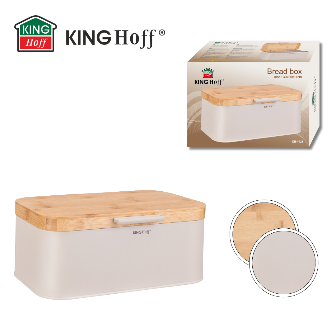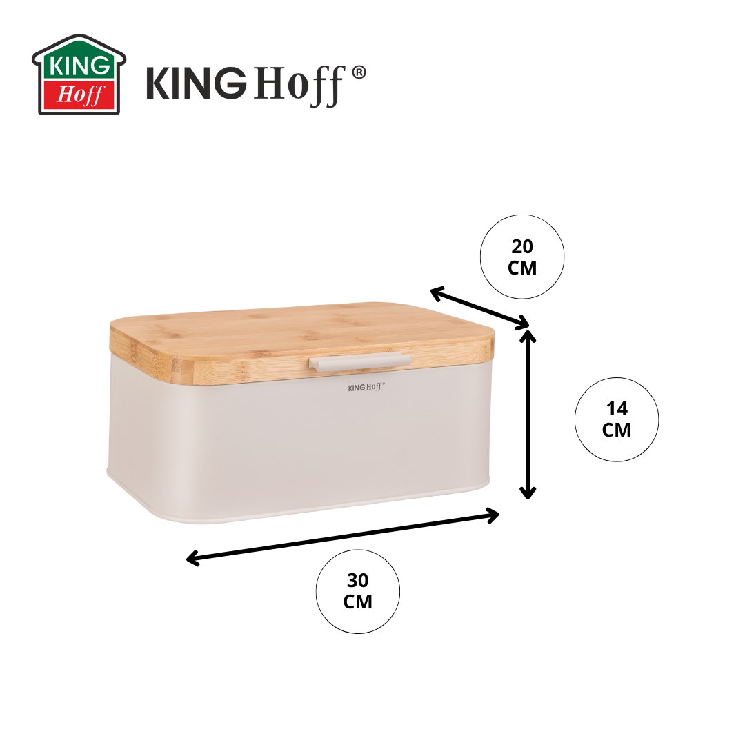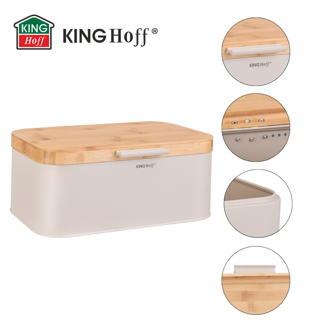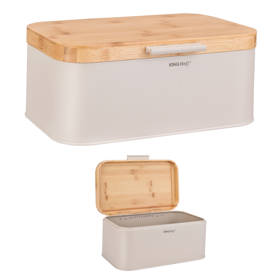 Chlebak KINGHoff w eleganckim beżowym kolorze z pokrywą z naturalnego bambusa to stylowe i praktyczne rozwiązanie do przechowywania pieczywa. Wykonany z metalu malowanego proszkowo, zapewnia trwałość i odporność na zarysowania, a bambusowa pokrywa dodaje mu naturalnego uroku. Dzięki kompaktowym wymiarom doskonale sprawdzi się w każdej kuchni, dbając o świeżość pieczywa przez dłuższy czas.