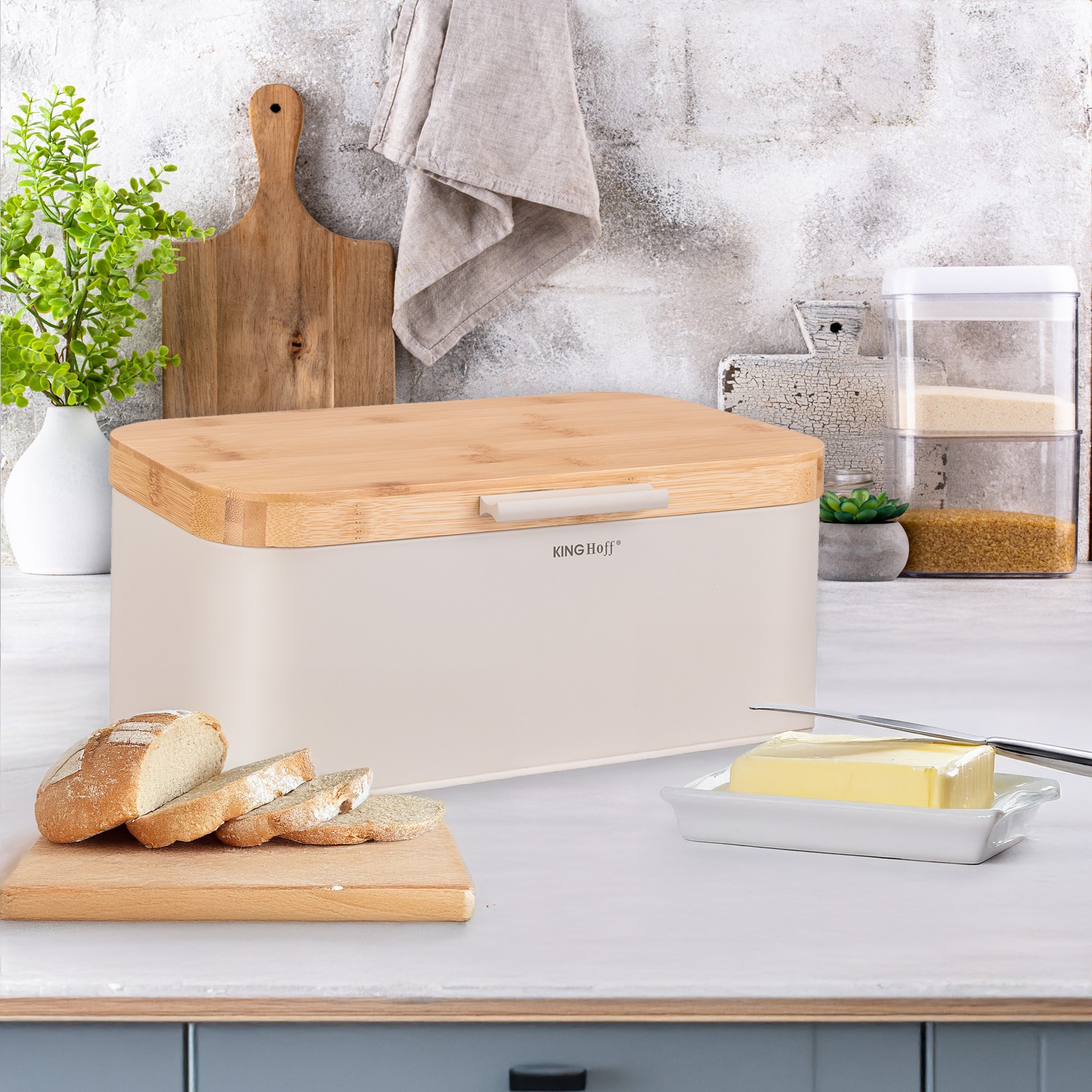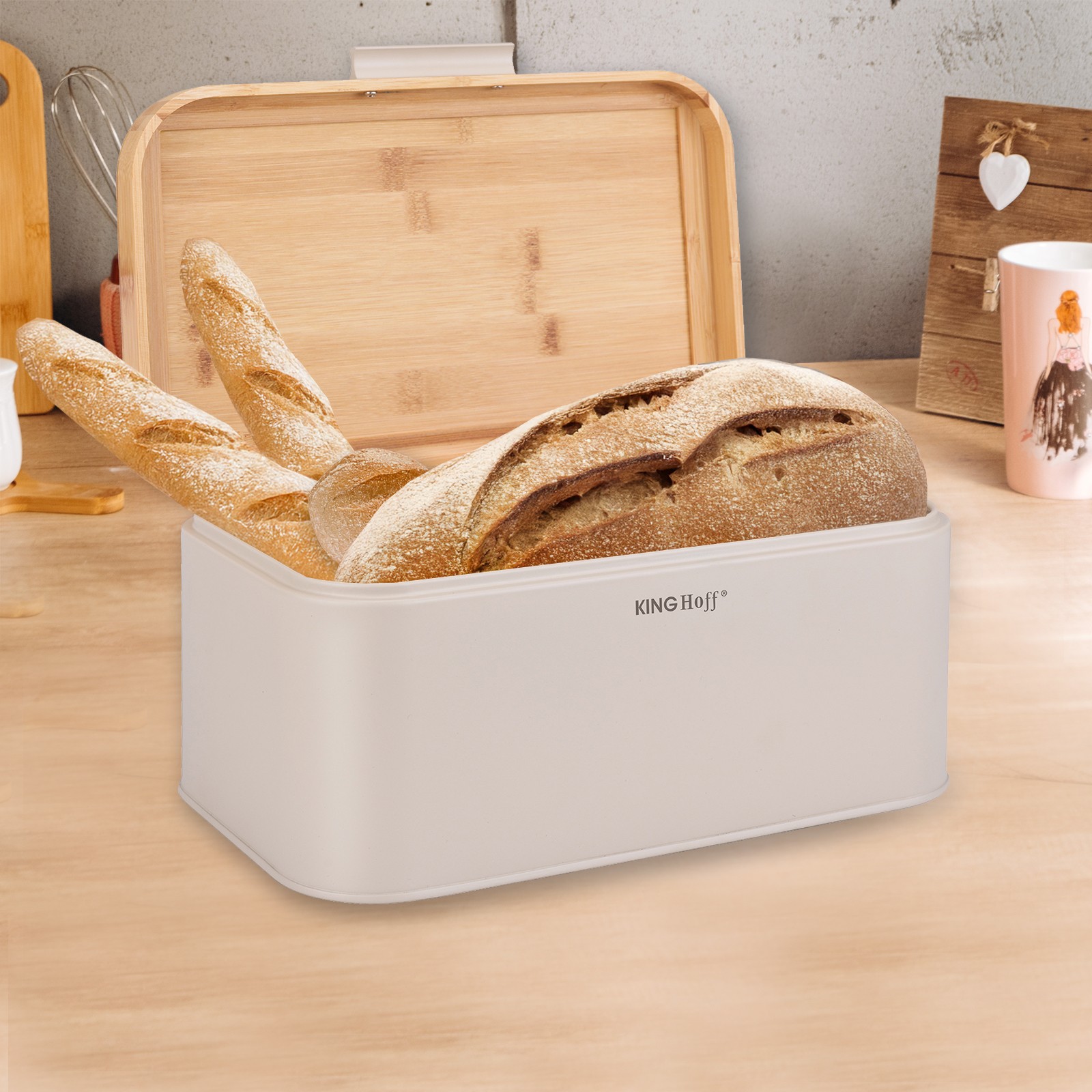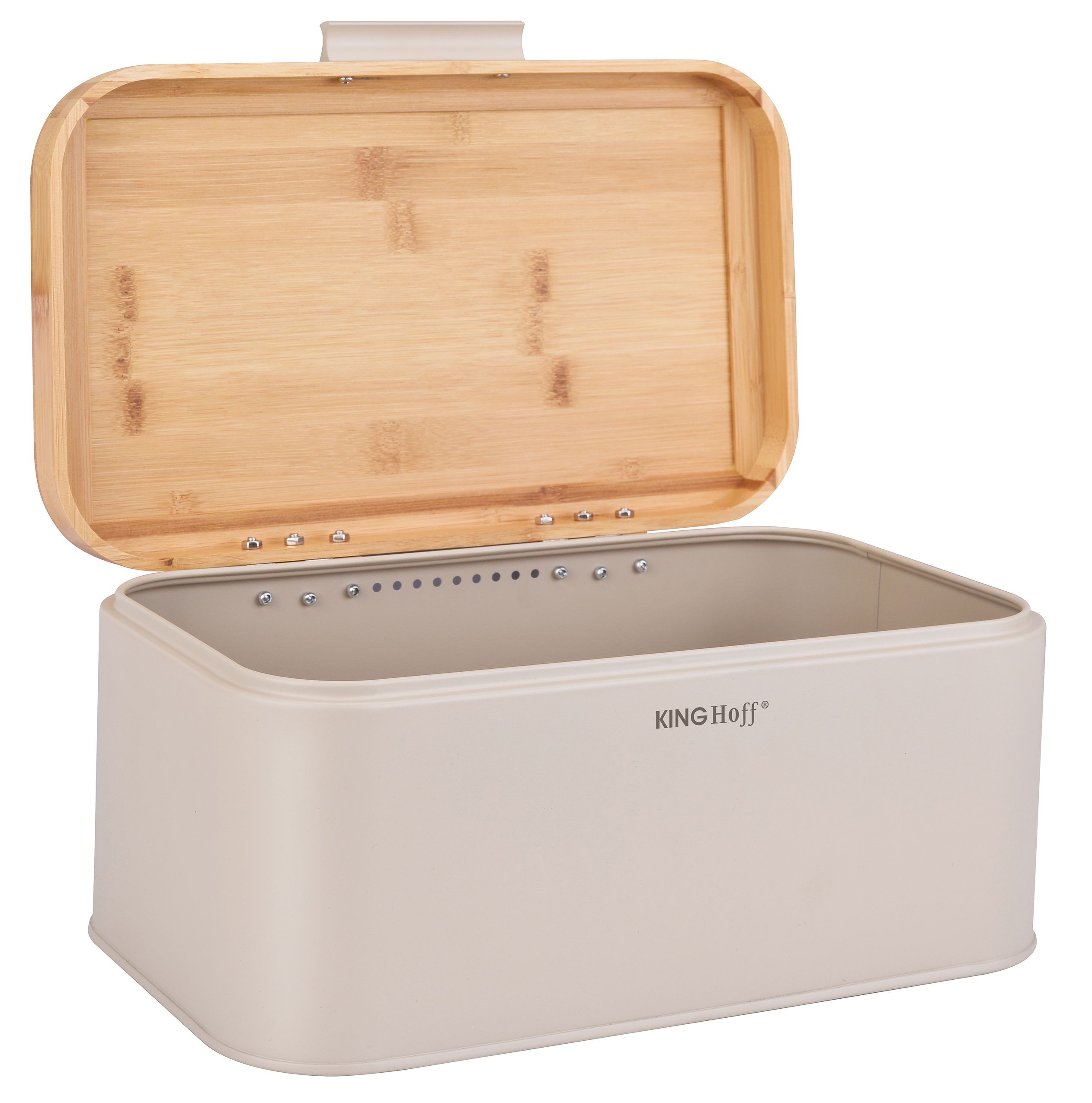 Chlebak KINGHoff w eleganckim beżowym kolorze z pokrywą z naturalnego bambusa to stylowe i praktyczne rozwiązanie do przechowywania pieczywa. Wykonany z metalu malowanego proszkowo, zapewnia trwałość i odporność na zarysowania, a bambusowa pokrywa dodaje mu naturalnego uroku. Dzięki kompaktowym wymiarom doskonale sprawdzi się w każdej kuchni, dbając o świeżość pieczywa przez dłuższy czas.