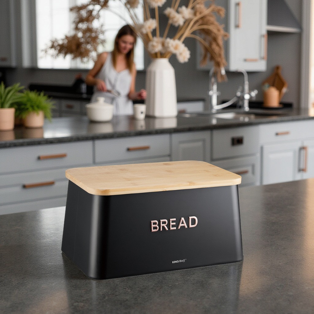Chlebak KINGHoff KH-1948 łączy elegancki design z praktycznym zastosowaniem. Wykonany z wysokiej jakości metalu malowanego proszkowo w głębokim czarnym kolorze oraz wyposażony w naturalną bambusową pokrywę, doskonale wpisuje się zarówno w nowoczesne, jak i klasyczne wnętrza kuchenne.