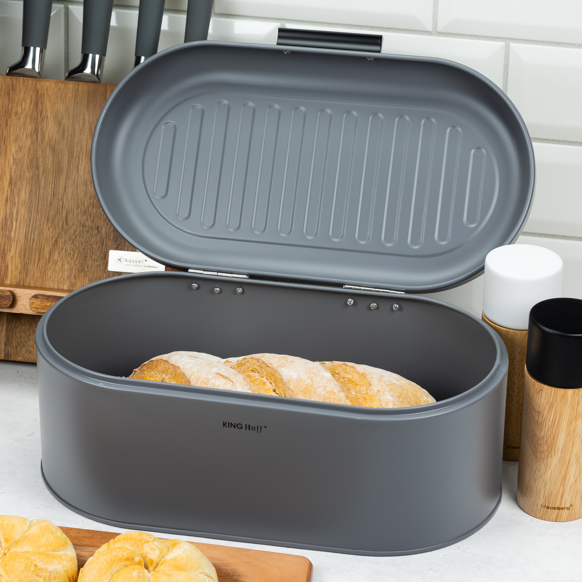 Szary stalowy chlebak KINGHoff – elegancki owalny pojemnik na pieczywo