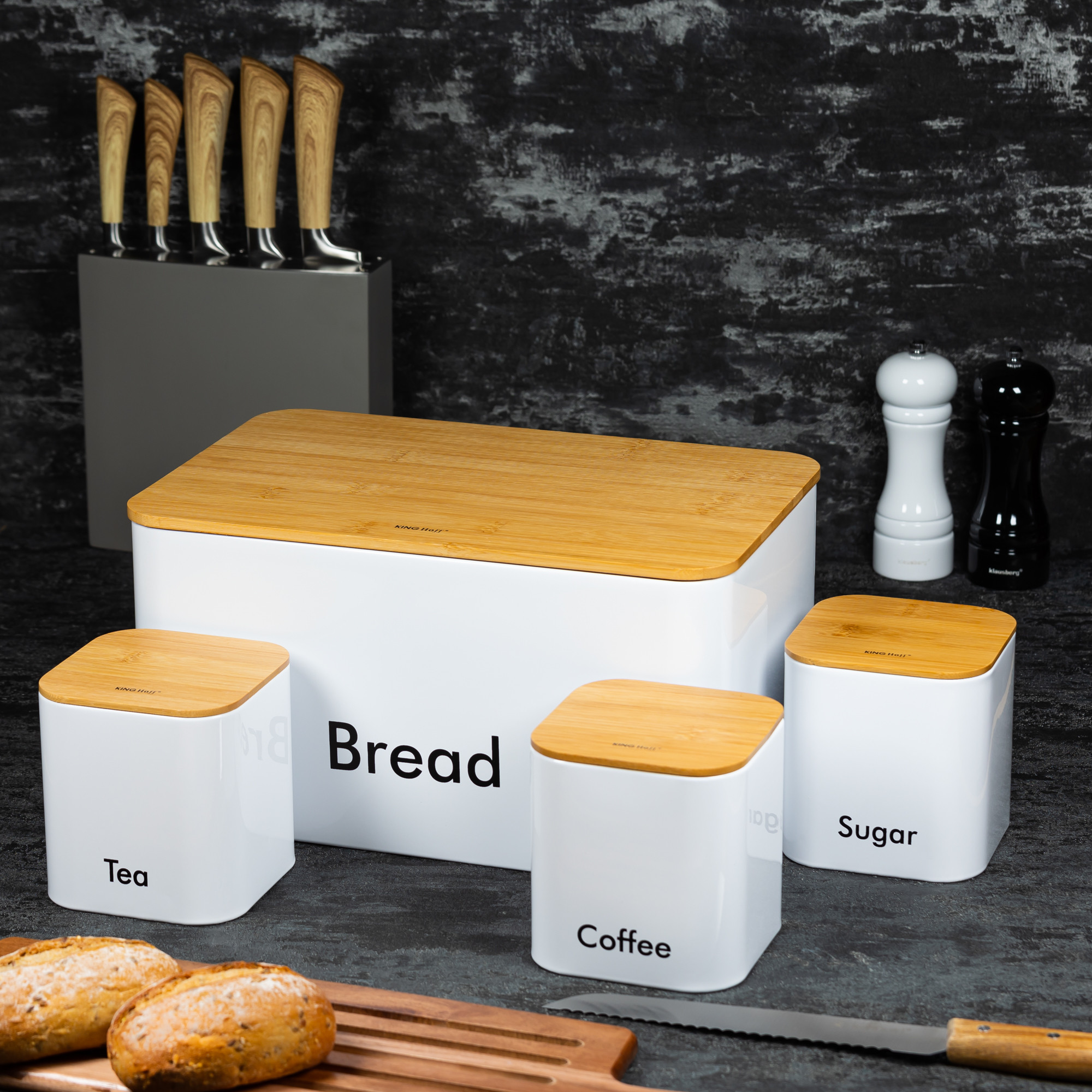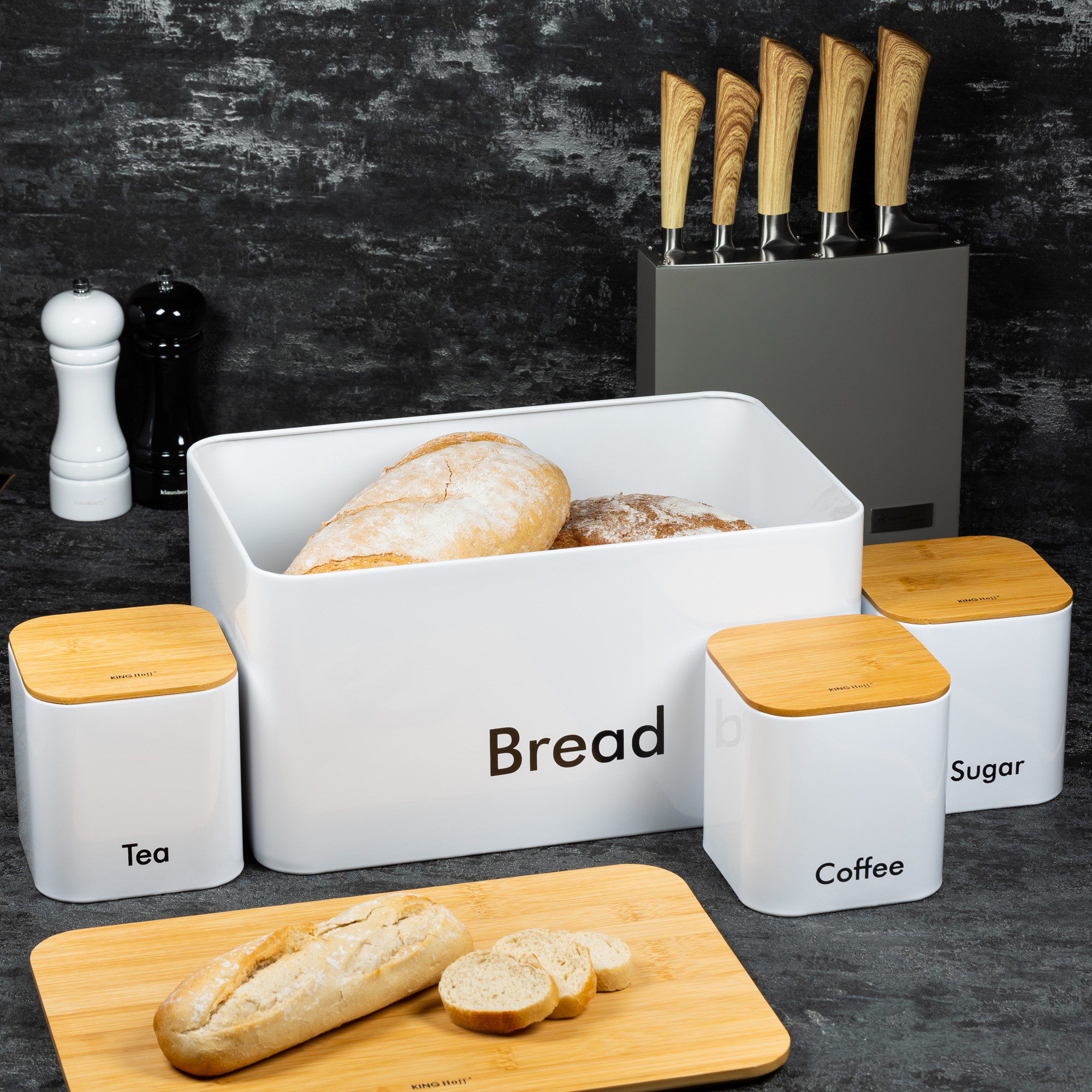 Funkcjonalność i design w idealnej harmonii – biały zestaw kuchenny Kinghoff to praktyczne rozwiązanie do przechowywania pieczywa i produktów sypkich, które jednocześnie podkreśli styl Twojej kuchni. W skład zestawu wchodzi przestronny chlebak z pokrywą pełniącą funkcję deski do krojenia oraz trzy pojemniki opisane jako Tea, Sugar i Coffee. Matowe, stalowe wykończenie w połączeniu z naturalnym bambusem tworzy estetyczną i nowoczesną całość.