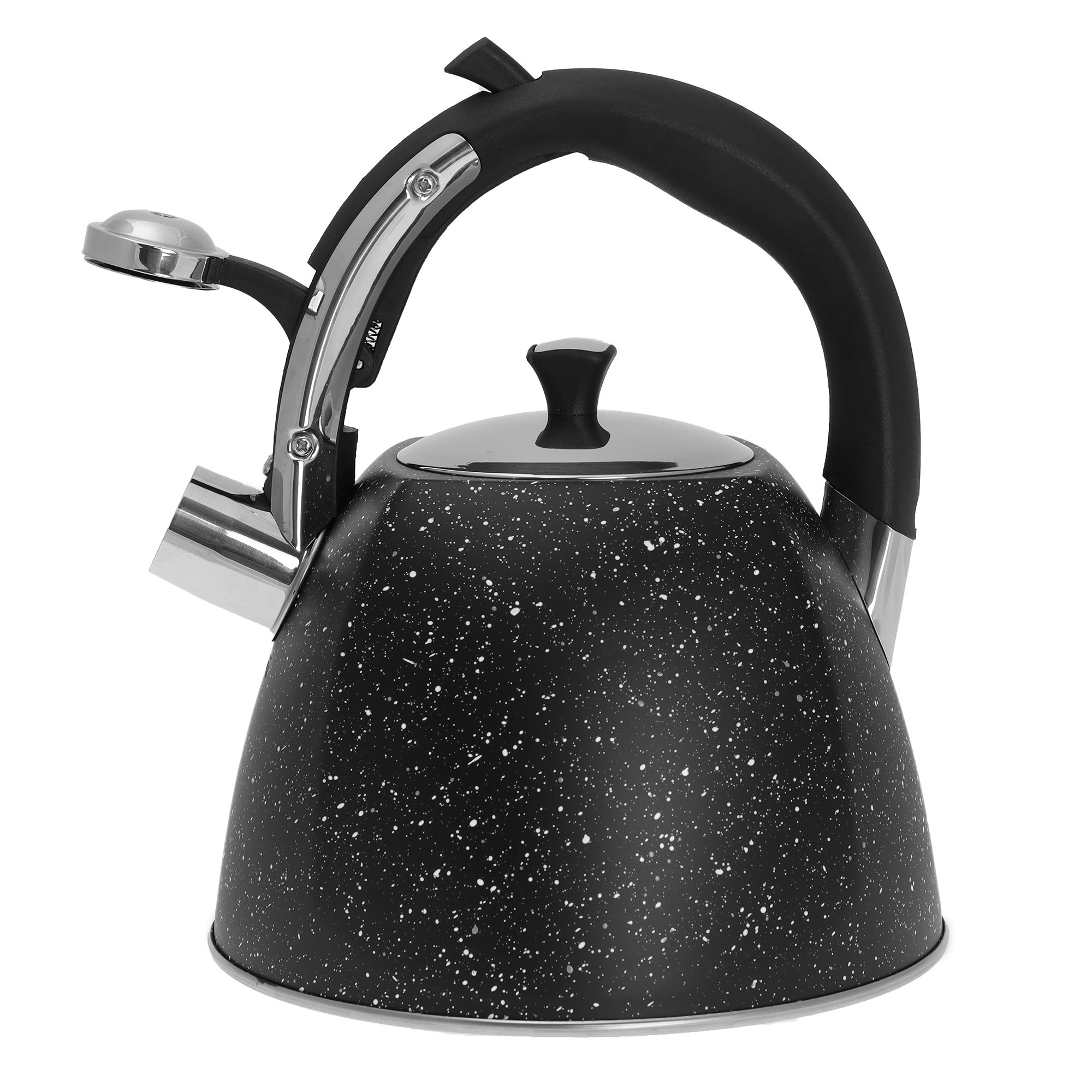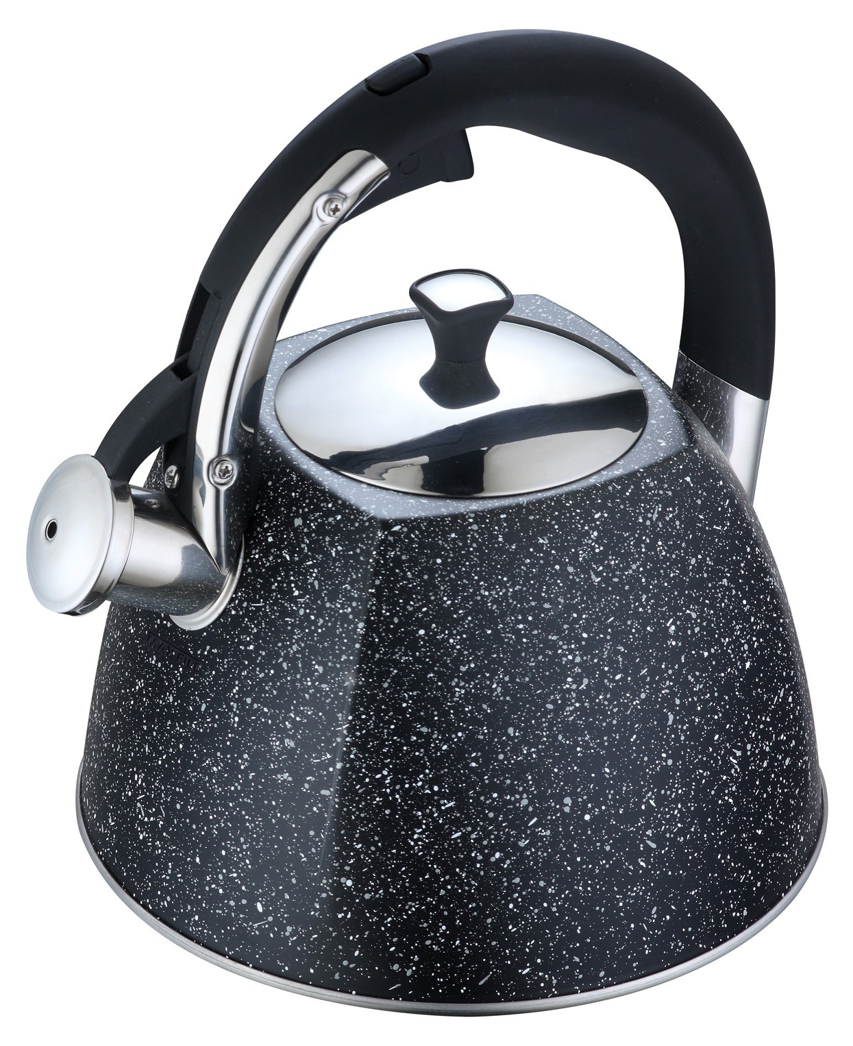 Czajnik stalowy 2,2L wykonany z wysokiej jakości stali nierdzewnej lakierowanej emalią marmurkową w kolorze czarnym. Odpowiedni do wszystkich rodzajów kuchenek i płyt: elektrycznych, ceramicznych, gazowych, halogenowych, indukcyjnych.