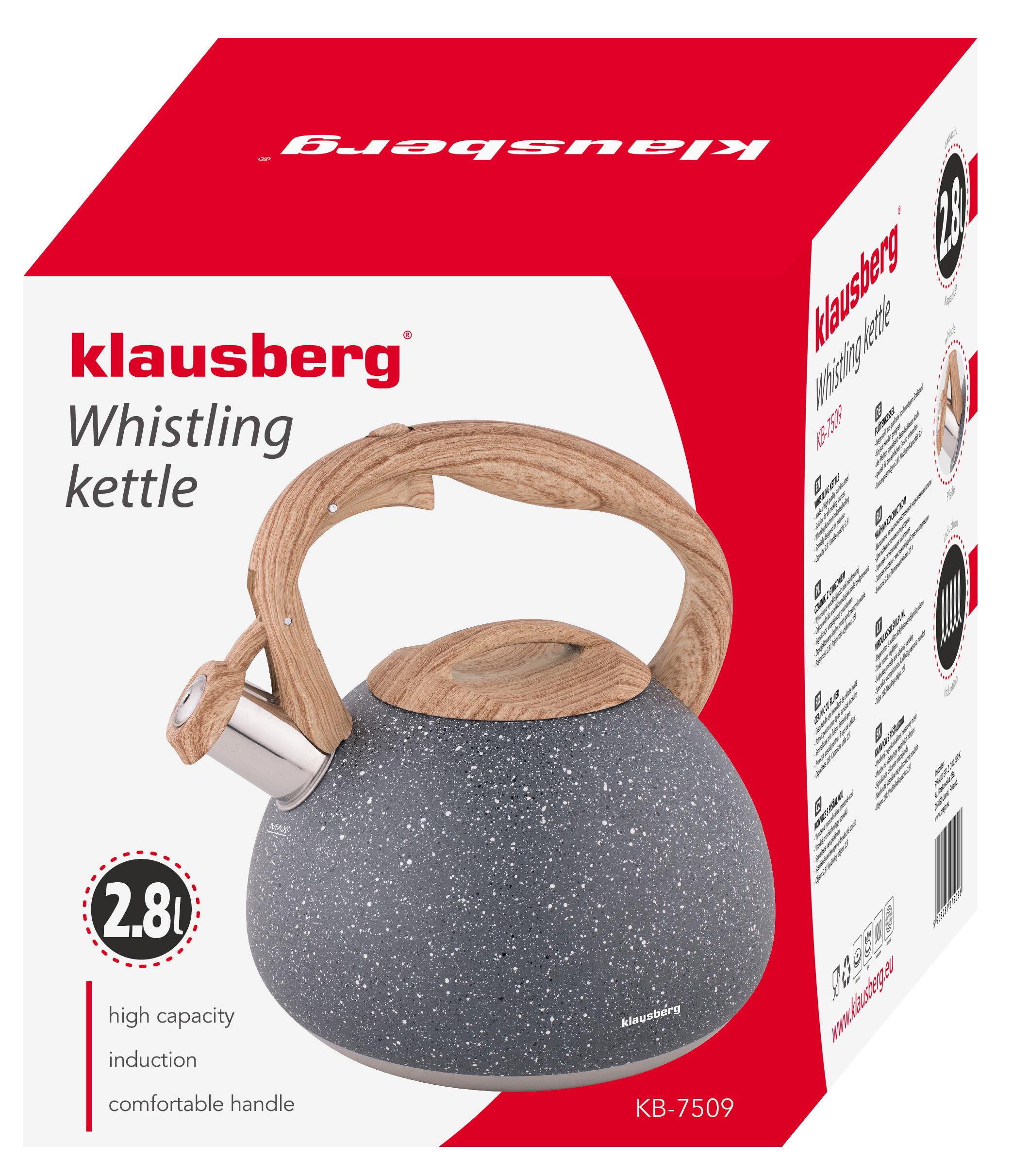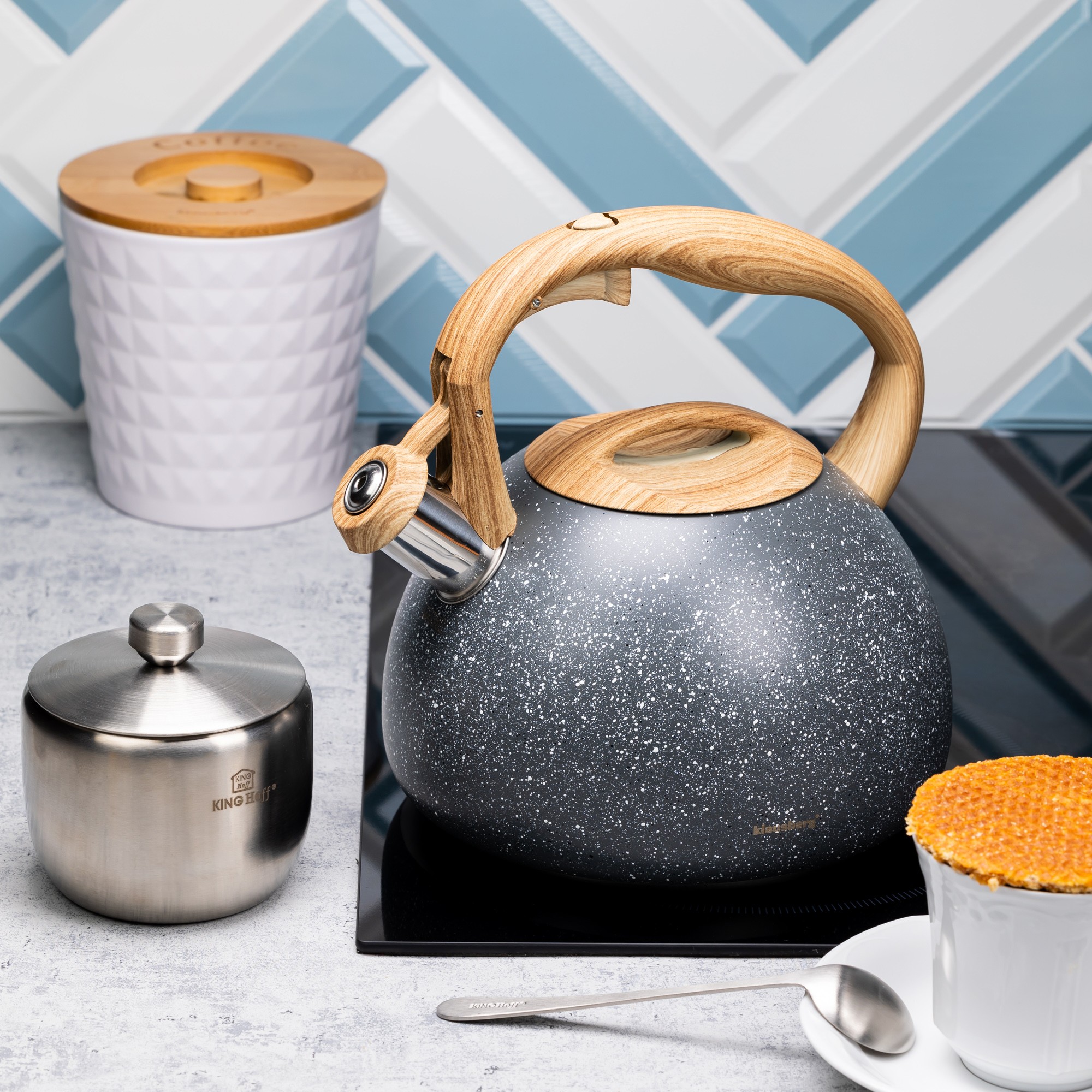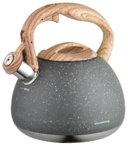 Ten czajnik stalowy o pojemności 2,8L to idealne połączenie wysokiej jakości materiałów i nowoczesnego designu. Wykonany z trwałej stali nierdzewnej, pokrytej elegancką powłoką marmurową, doskonale sprawdzi się w każdej kuchni. Jest kompatybilny z wszystkimi rodzajami kuchenek – elektrycznymi, ceramicznymi, gazowymi, halogenowymi oraz indukcyjnymi.