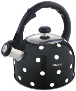Stylowy i pojemny czajnik stalowy to praktyczny wybór do każdej kuchni. Dzięki aluminiowej płycie akumulującej ciepło, woda gotuje się szybciej i dłużej utrzymuje temperaturę, co przekłada się na oszczędność energii i czasu. Jego klasyczny wygląd z białymi kropkami na czarnym tle przyciąga uwagę i dodaje uroku kuchennemu wnętrzu.