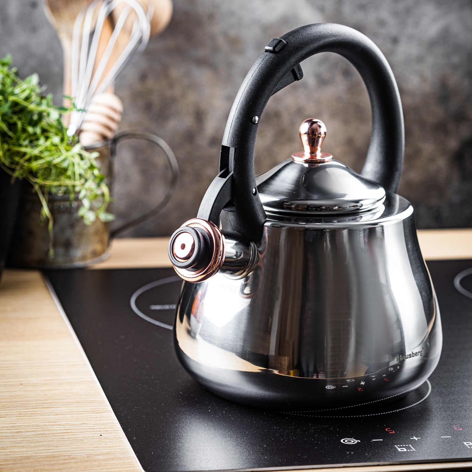 Czajnik Klausberg to wyjątkowe połączenie klasyki i nowoczesności. Wykonany z wysokiej jakości stali nierdzewnej, zachwyca srebrnym połyskiem wzbogaconym o stylowe detale w odcieniu różowego złota. Dzięki pojemności całkowitej 2,8 litra (2,4 litra użytkowej) świetnie sprawdzi się w codziennym użytkowaniu. Funkcjonalny gwizdek poinformuje o zagotowanej wodzie, a ergonomiczny uchwyt zapewni wygodę i bezpieczeństwo.