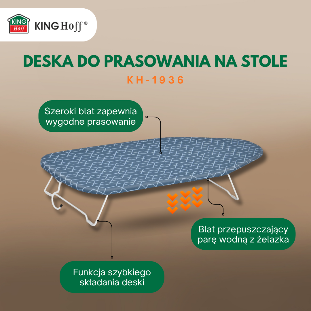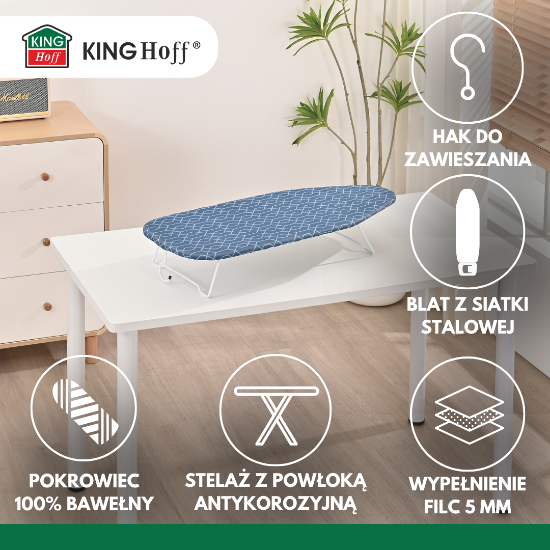 KINGHOFF KH-1936 to kompaktowa i praktyczna deska do prasowania na stół, zaprojektowana z myślą o wygodzie, oszczędności miejsca i szybkim użytkowaniu. Idealna do małych mieszkań, akademików i pralni — gotowa do pracy w kilka sekund.