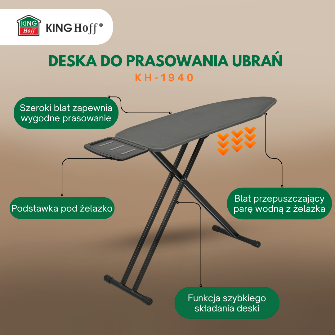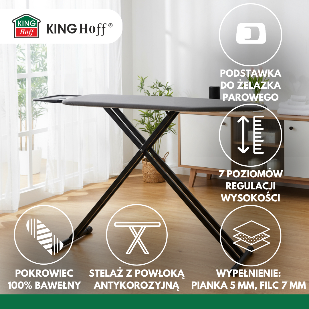 KINGHOFF KH-1940 to duża, premium deska do prasowania dla wymagających użytkowników, ceniących stabilność, komfort i elegancki wygląd. Szeroki blat 122×38 cm idealnie nadaje się do prasowania koszul, pościeli i większych tkanin, a 7-stopniowa regulacja wysokości (ok. 68–91 cm) umożliwia dopasowanie pozycji do wzrostu i preferencji.