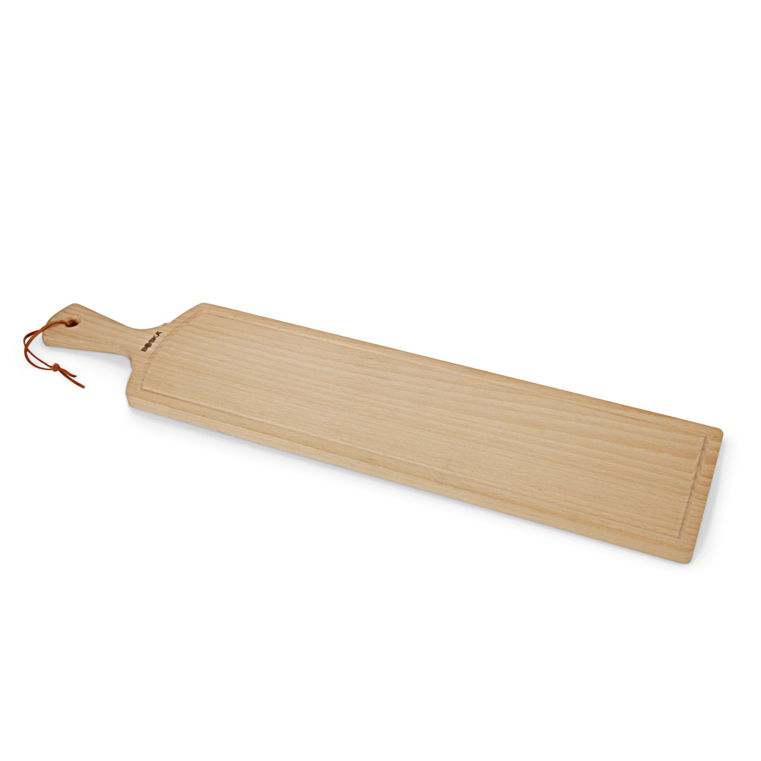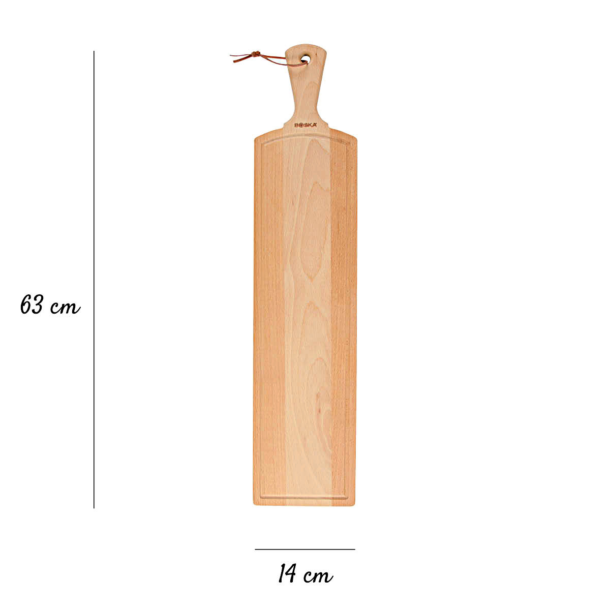 Bukowa deska do serwowania przekąsek o długości 63 cm! Deska ma wprost wymarzony kształt do serwowania przekąsek, które prezentują się na niej po królewsku. Grubość deski to 1,5cm, całkowita długość 63 cm a szerokość 14 cm a powierzchnia do serwowania to 48,5 cm na 11 cm! Przybliżona waga brutto: 0,916kg. Opakowanie: brak.