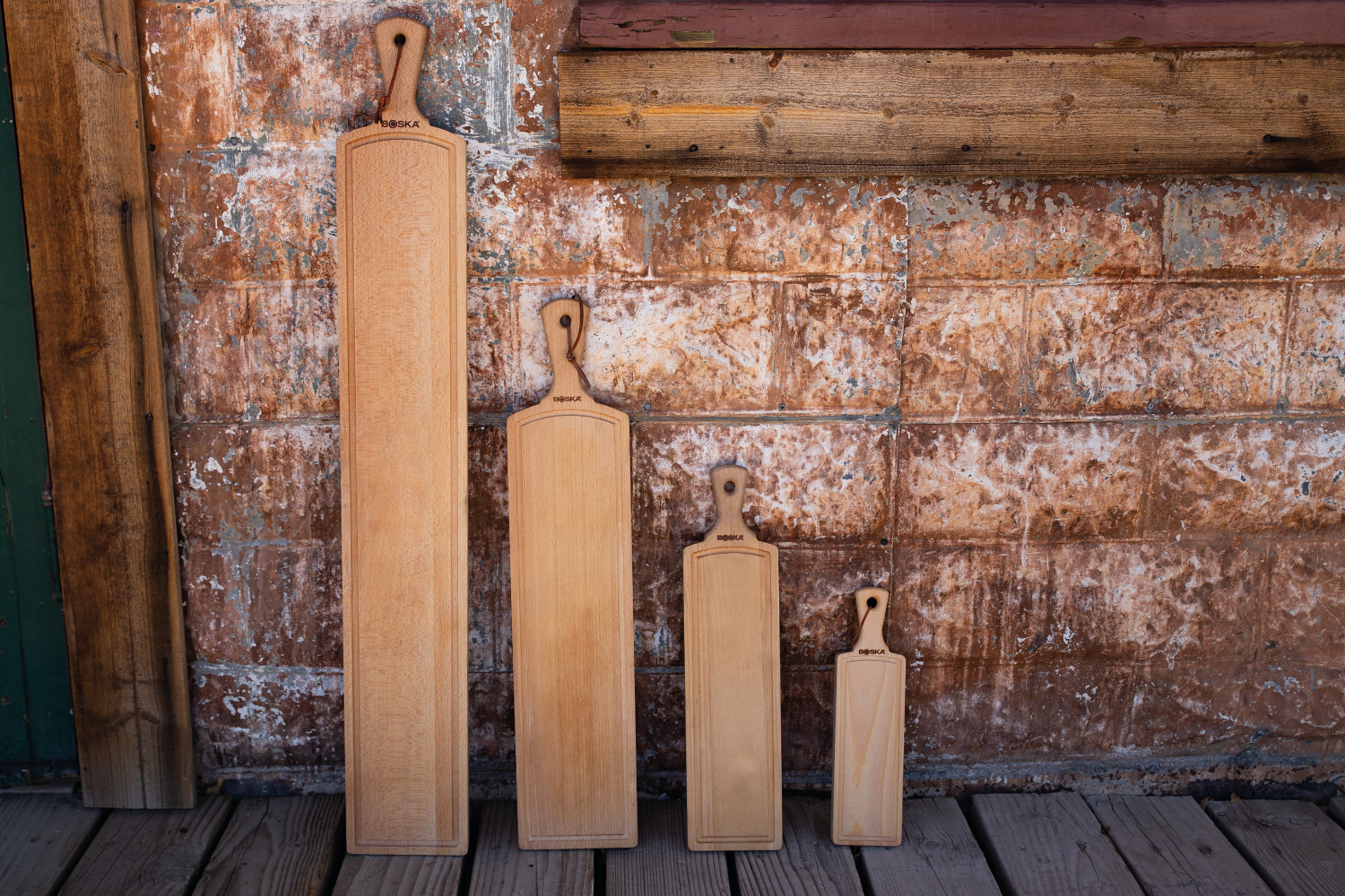 dokładnie wycieramy a następnie ustawiamy deskę pionowo z dostępem powietrza z obu stron, aby mogła doschnąć naturalnie. Deski dostępne są w różnych rozmiarach. Przybliżone wymiary deski: grubość 1,5cm, długość 63cm, szerokość 14,3cm, powierzchnia do serwowania to 48,5cm na 11cm.