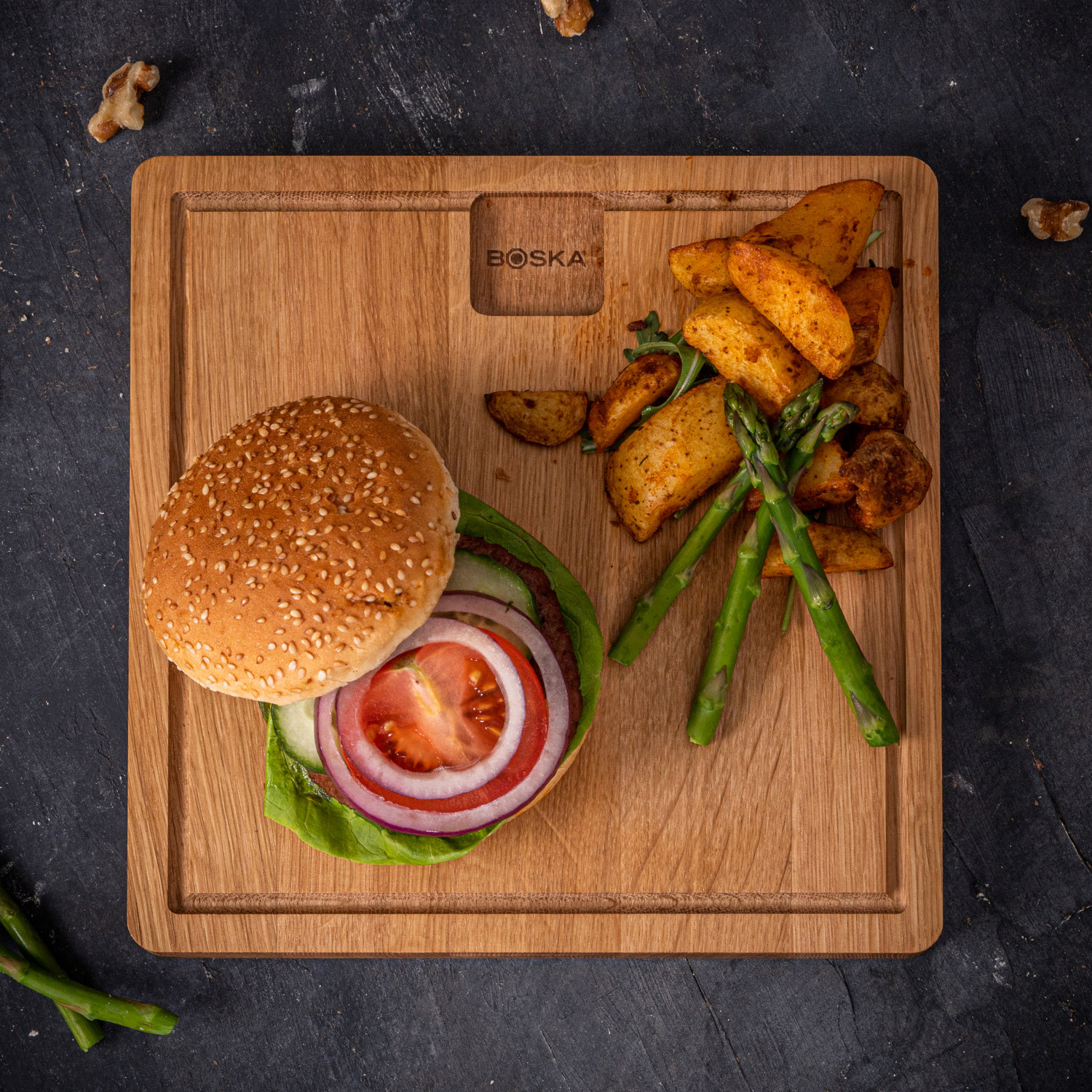 Deska do serwowania Friends S to deska dla smakoszy-estetów! Deska sprawdzi się zarówno do podawania przekąsek, jak i do serwowania steków, burgerów i innych dań. To deska dla smakoszy-estetów, dla których smak jest tak samo ważny jak podanie. A nic tak nie wyeksponuje serwowanej potrawy jak naturalne, dębowe drewno. Grubość deski to aż 2 cm, na bokach deski znajdują się wgłębienia, które ułatwiają jej przenoszenie. Na obwodzie deski jest żłobienie – poręczny rowek, który zbiera okruchy i soki. To z pewnością pozwoli Ci zaoszczędzić trochę czasu na sprzątaniu! Na tej desce jedzenie będzie wyglądać jeszcze bardziej smacznie. Idealnie nadaje się na spotkania przy grillu. Deski można użyć do podania steków, grillowanych warzyw zamiast talerza. Deska dostępna jest w 3 rozmiarach: S, M, i L. Przed pierwszym użyciem deskę należy solidnie naoliwić, pozwolić by drewno chłonęło olej przez kilka dni. Potem czynność należy powtarzać co jakiś czas. Deskę myć ręcznie z dodatkiem łagodnych detergentów. Opakowanie: brak, etykieta w postaci papierowej opaski.