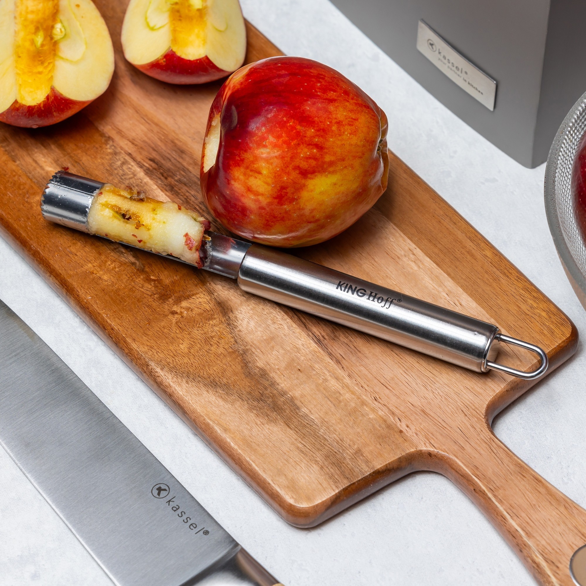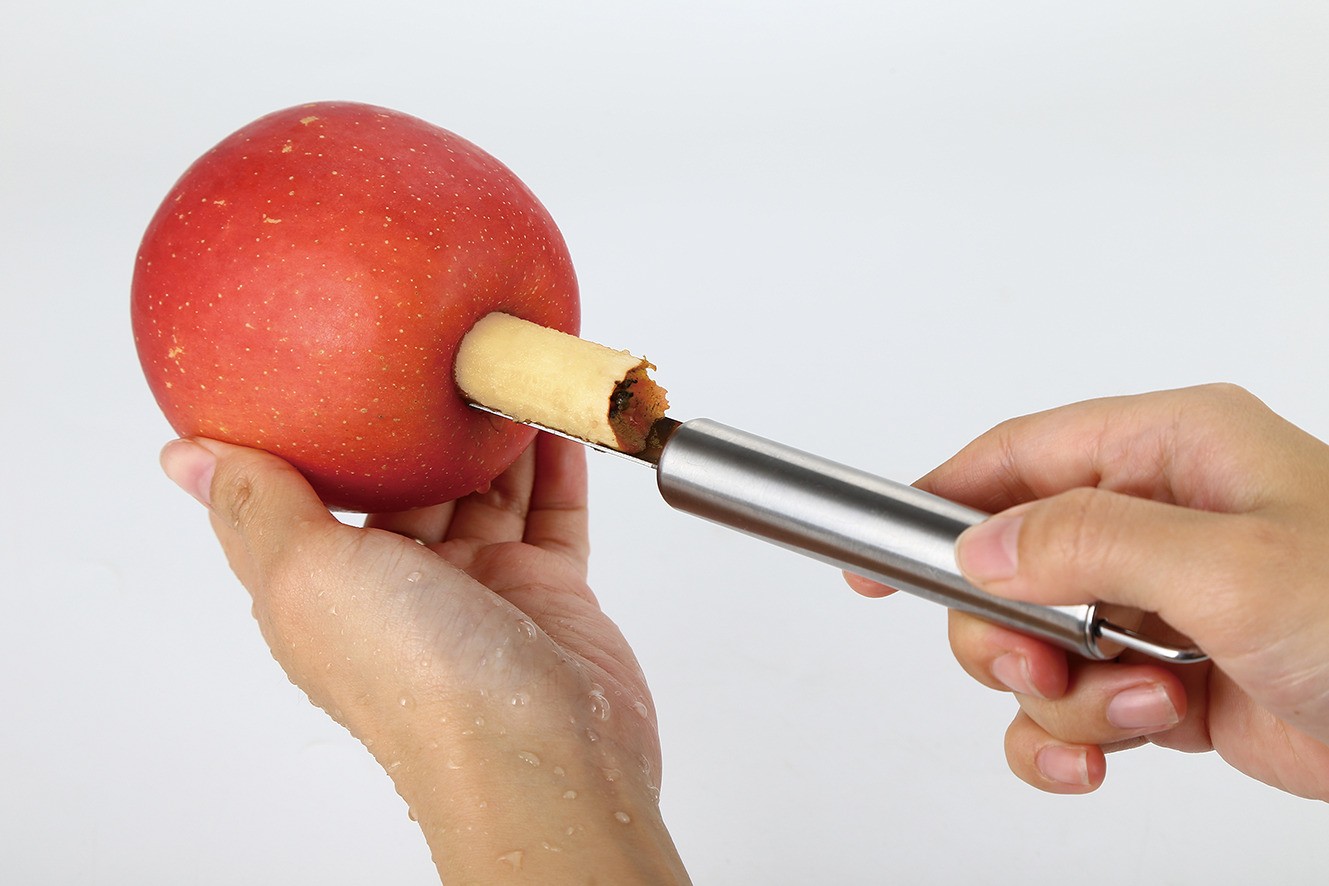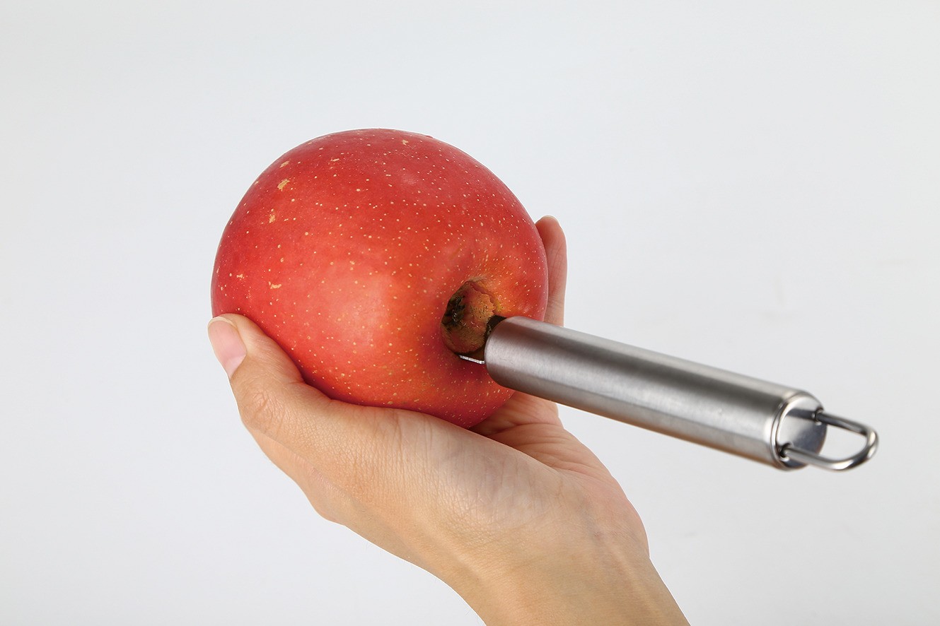 Wystarczy delikatnie wsunąć wykrawacz w owoc i obrócić, aby łatwo i szybko usunąć rdzeń oraz nasiona z jabłek, gruszek, pomidorów i innych. Narzędzie jest lekkie i poręczne, a dzięki otworowi do zawieszania można je wygodnie przechowywać w kuchni.