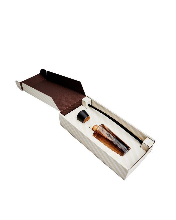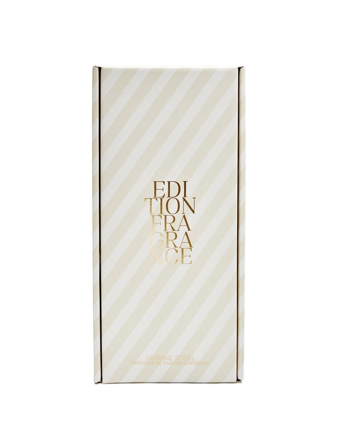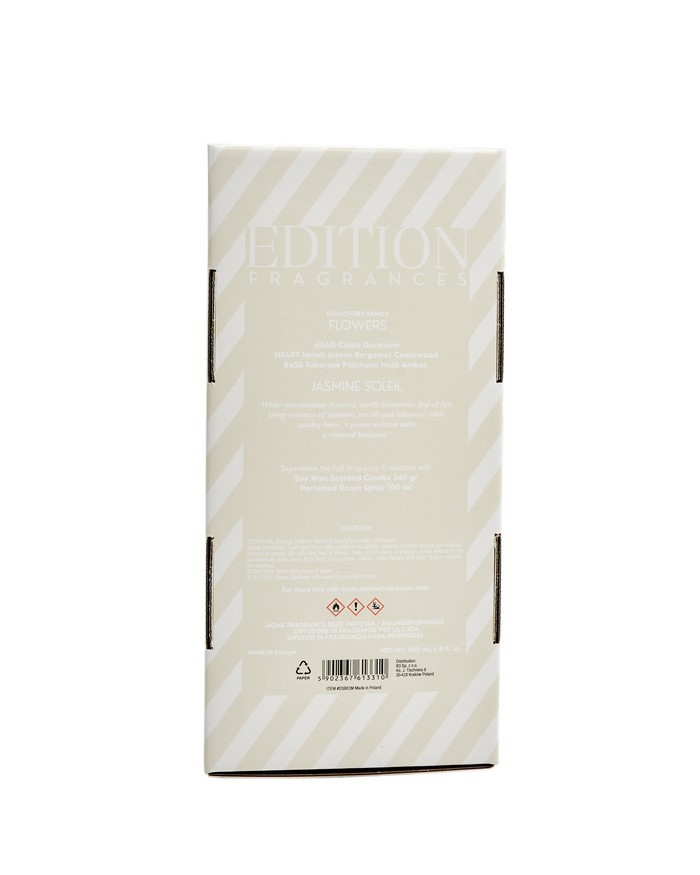 Dyfuzor zapachowy z rattanowymi patyczkami o pojemności 200 ml. Francuska kompozycja zapachowa złożona z wielu nut na bazie naturalnych olejków o wysokim stężeniu. Wysokiej jakości szkło oraz nasadka z bukowego drewna malowanego na satynowy czarny kolor. Pakowane w duże ozdobne pudełku typu display w zestawie z 8 patyczkami o długości 32 cm. Edycja Jasmine Soleil to ciepłe intensywne nuty kwiatów lazurowego wybrzeża na piżmowo ambrowej bazie.