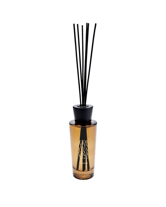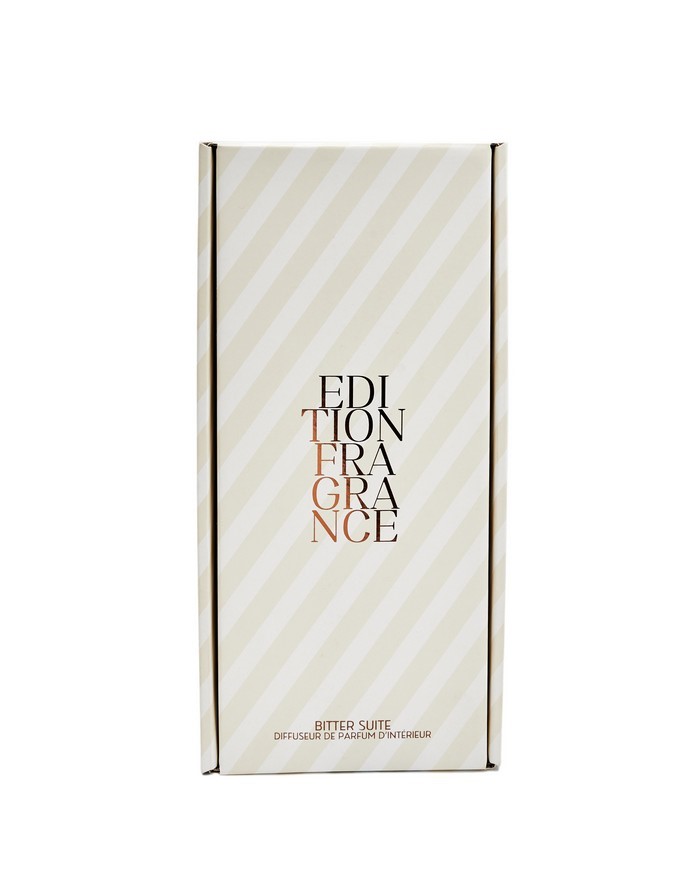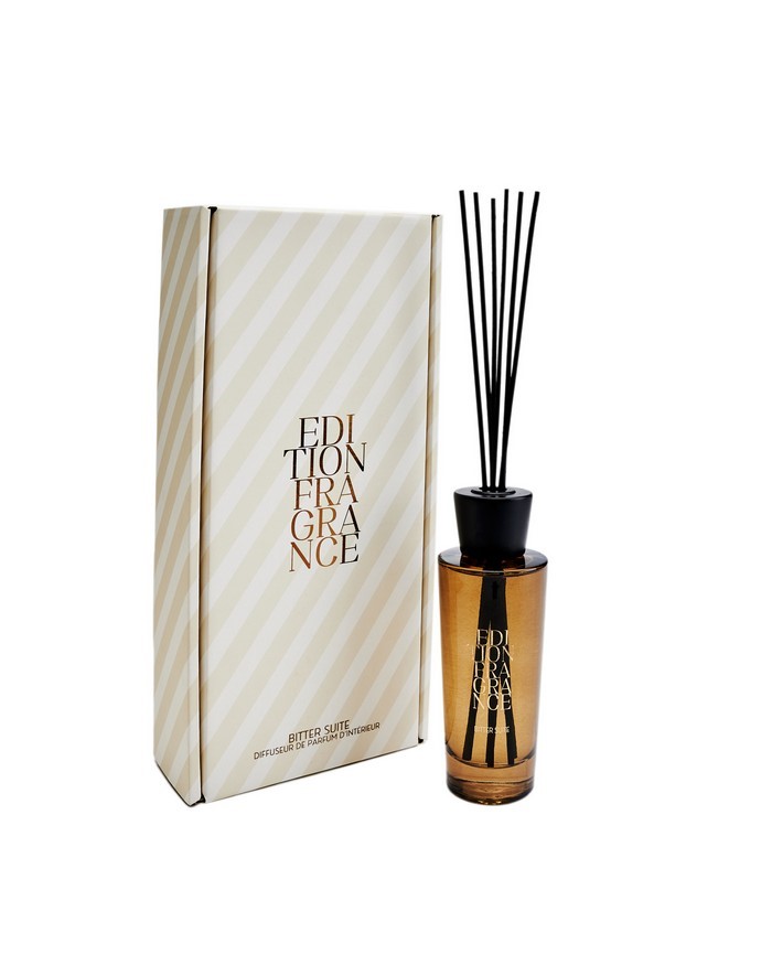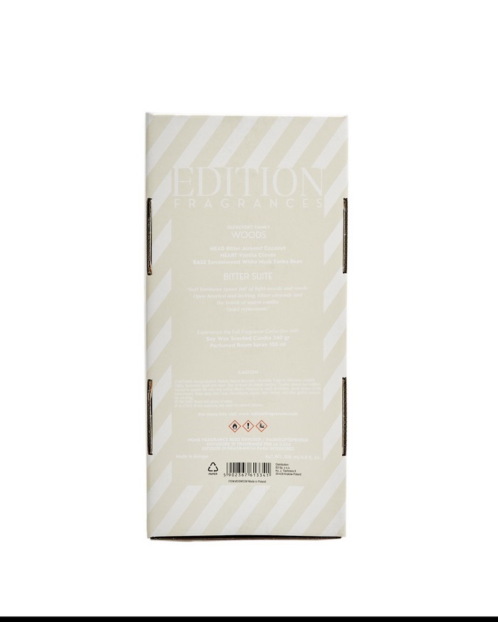 Dyfuzor zapachowy z rattanowymi patyczkami o pojemności 200 ml. Francuska kompozycja zapachowa złożona z wielu nut na bazie naturalnych olejków o wysokim stężeniu. Wysokiej jakości szkło oraz nasadka z bukowego drewna malowanego na satynowy czarny kolor. Edycja Bitter Suite to wysublimowane połączenie gorzkich migdałów, miękkiego zamszu i otulającej wanilii z fasolą tonka. Dyfuzor uwalnia zapach od 3 do 4 miesięcy, w zależności od warunków zewnętrznych.