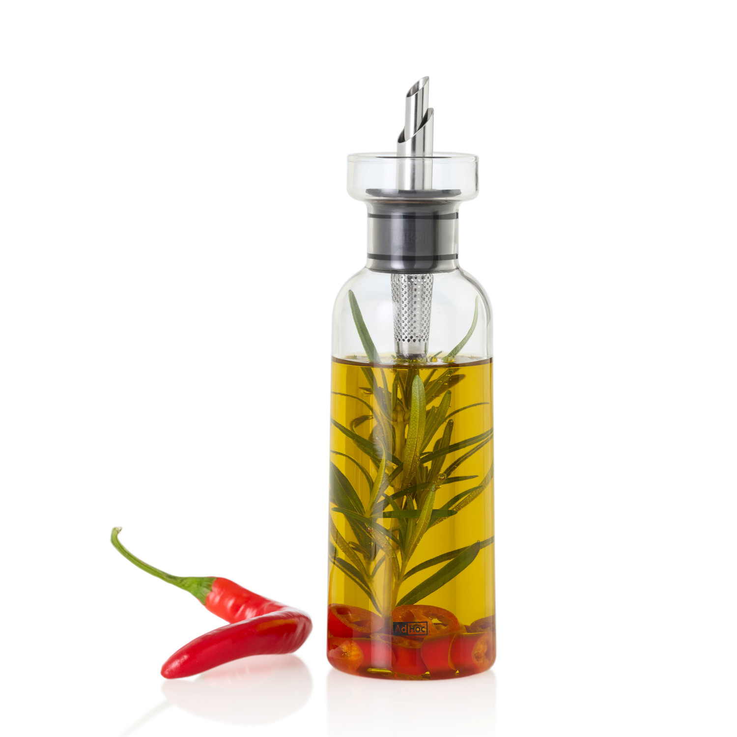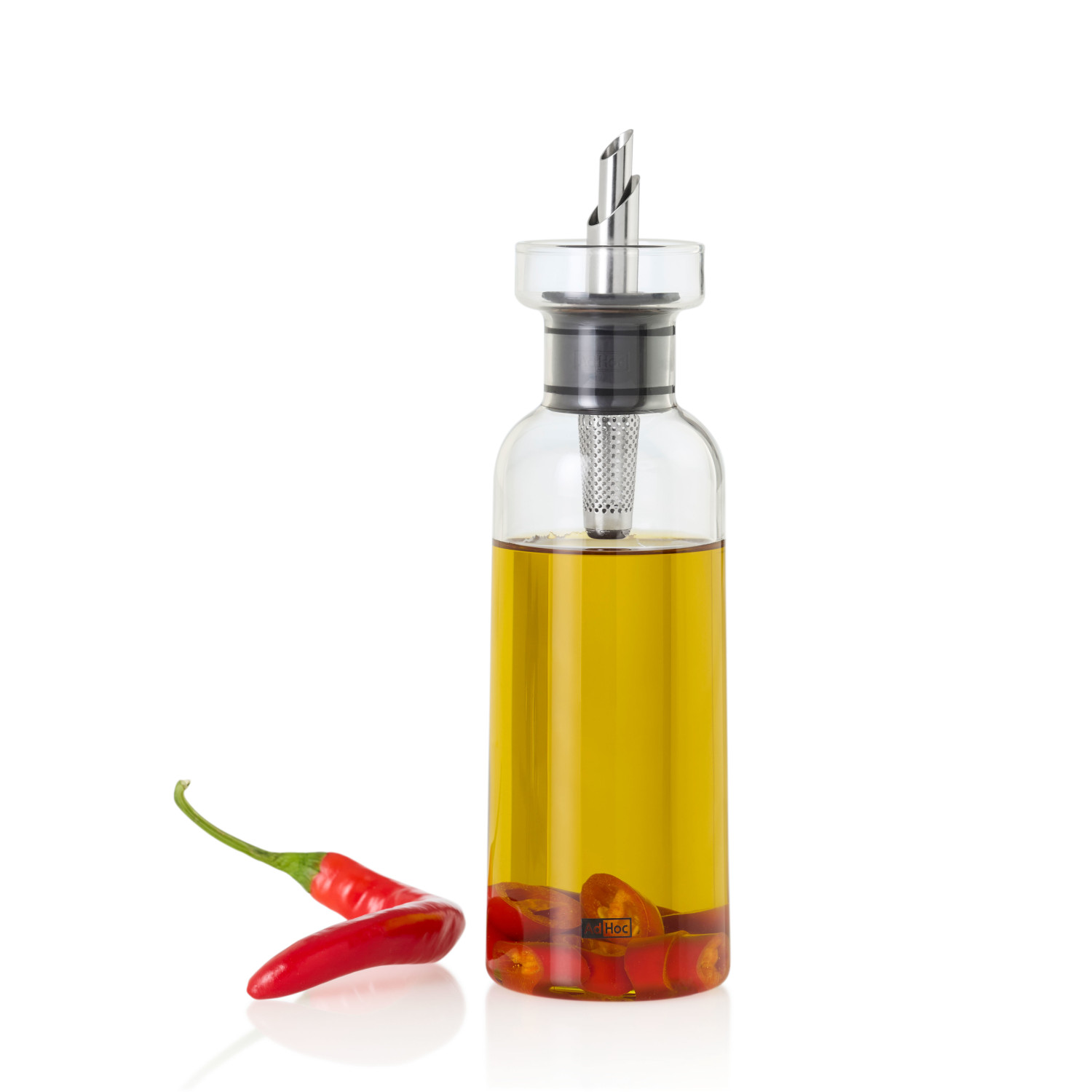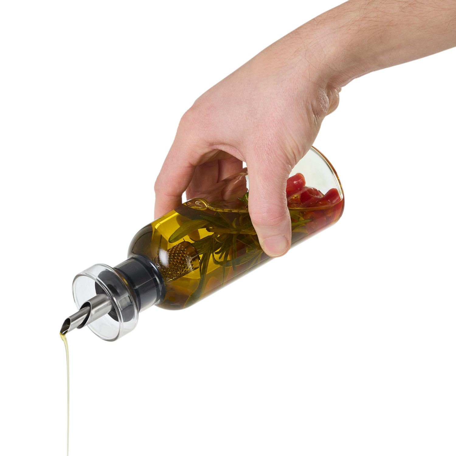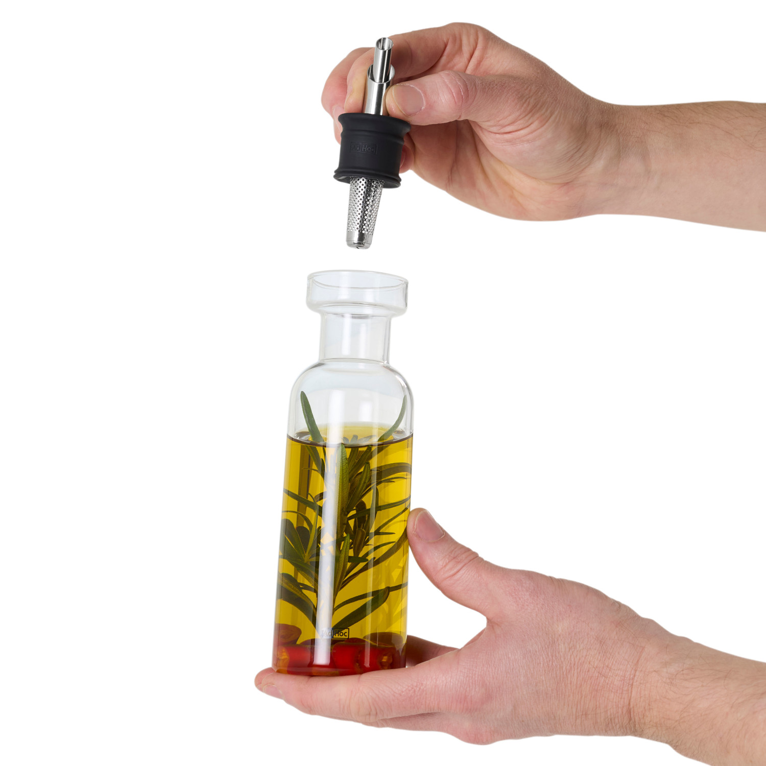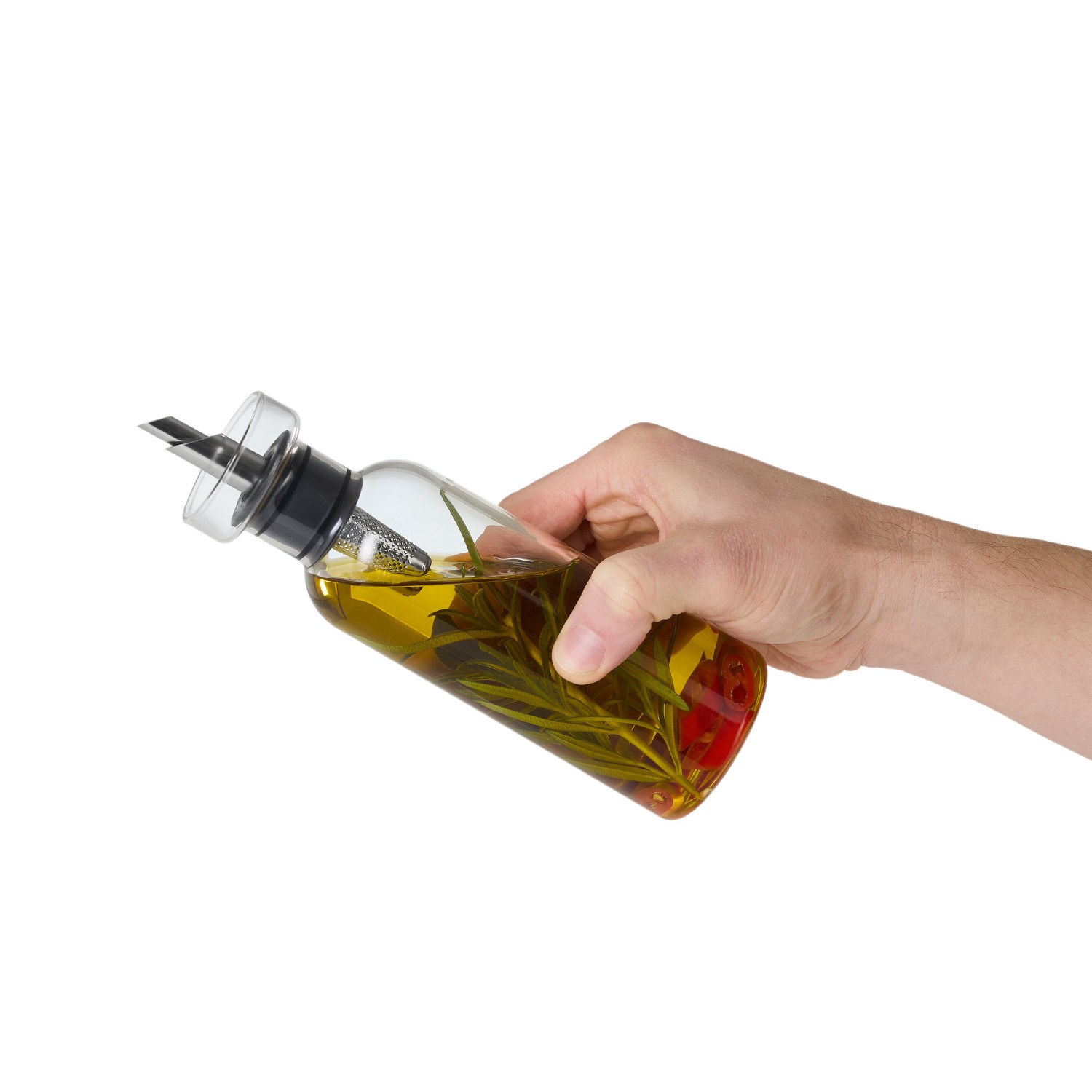 Dyspenser AromaPour to funkcjonalne narzędzie do dozowania Twoich najlepszych oliw, olejów czy octu. W jednym urządzeniu zawarto aż 4 dodatkowe udogodnienia – nalewaka, rynienki odprowadzająca krople, automatyczne zamknięcie GravitySeal oraz filtr ze stali nierdzewnej. Dokładnie zaprojektowany nalewak z systemem powietrznym PreciseFlow pozwala na pełną kontrolę nalewania, zapewniając odpowiednie dozowanie i zapobiegając niepotrzebnym stratom. Dzięki rynience krople, które powstaną na krawędzi nalewaka podczas nalewania, spłyną z powrotem do dyspensera. GravitySeal to stalowa kulka, która pod wpływem grawitacji szczelnie zamknie dopływ powietrza z zewnątrz jak tylko odstawisz dyspenser. A jeśli lubisz oliwę z różnymi dodatkami jak zioła czy papryczki chilli, to stalowy filtr zatrzyma je wewnątrz dyspensera. Co najważniejsze, do sprawnego posługiwania się dyspenserem wystarczy jedna dłoń. Zbiornik dyspenser został wykonany z neutralnego szkła borokrzemowego, a jego pojemność to około 300ml. Można go bardzo łatwo napełnić, dodać zioła czy papryczkę przez szeroki otwór po wyjęciu nalewaka. Produkt został zaprojektowany przez Rolanda Kreitera. Nie należy myć w zmywarce. Materiał: szkła borokrzemowe, stal nierdzewna, silikon. Przybliżone wymiary: wysokość – 21cm, średnica – 5,8cm. Przybliżone wymiary brutto: wysokość – 23,7cm, długość – 8,7cm, szerokość – 8,7cm. Przybliżona waga brutto: 0,286kg. Opakowanie: kartonowe pudełko prezentowe.