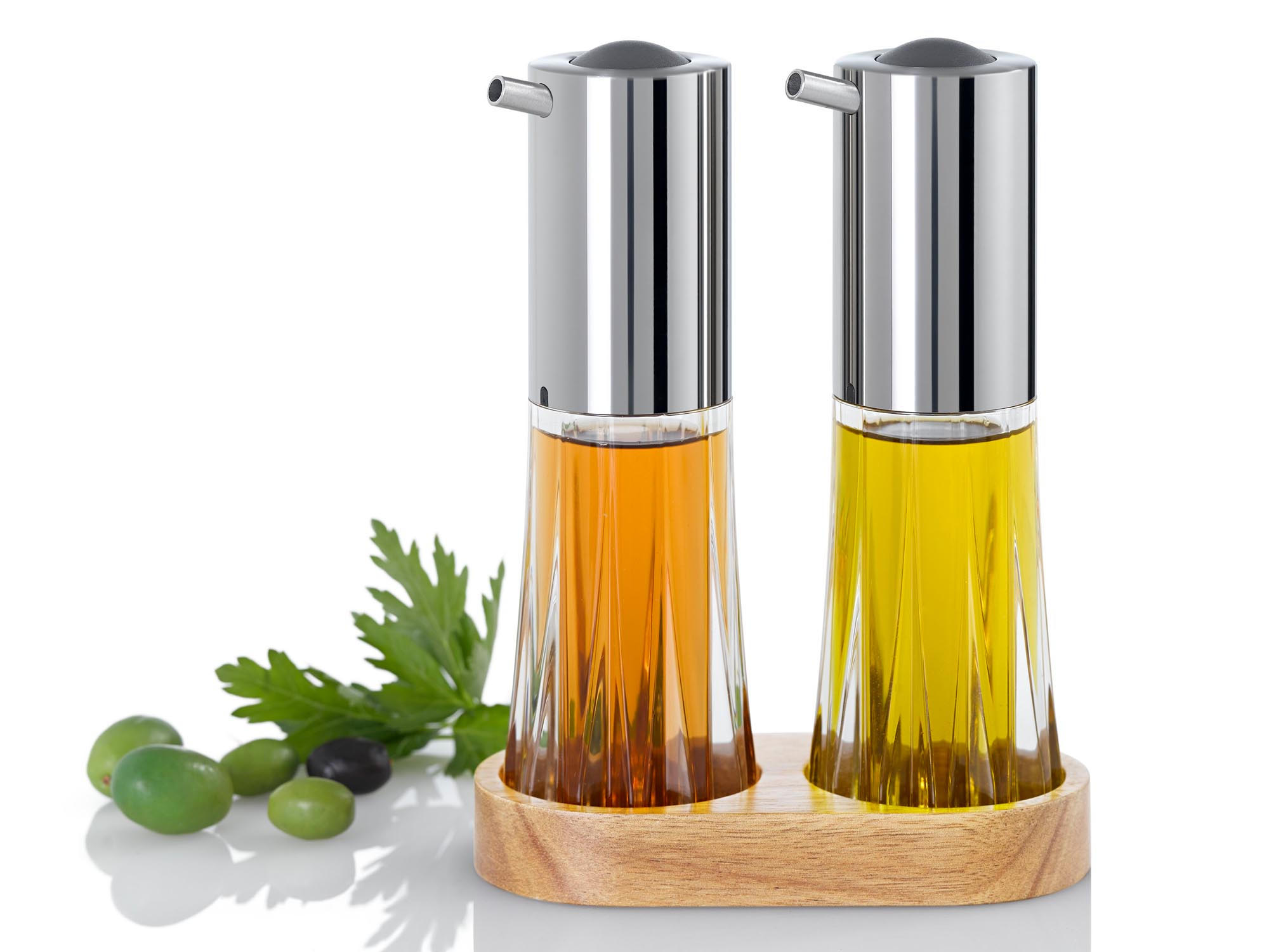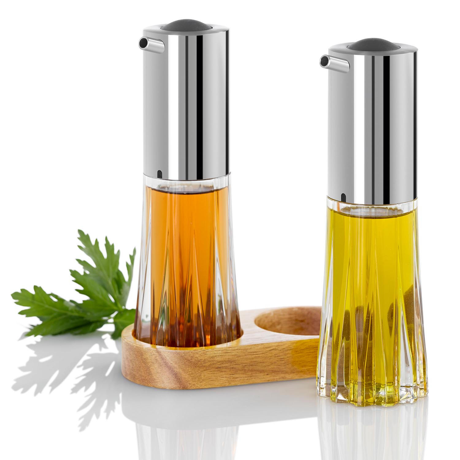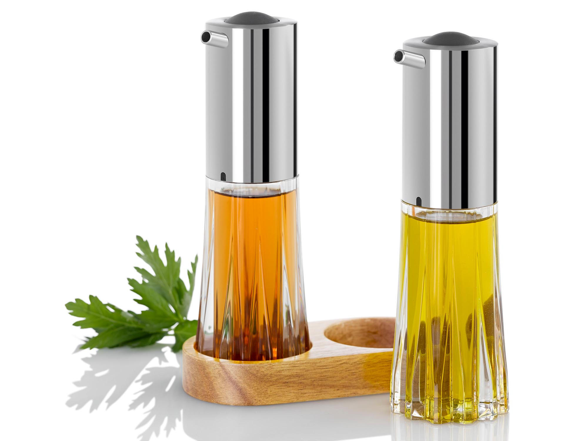 Specjalna pompka ułatwia dokładne dozowanie zawartości, a specjalnie zaprojektowany nalewak przechwytuje wszystkie kropelki. Dyspenser można napełnić w bardzo łatwy sposób dzięki dużemu otworowi, który otrzymujemy po odkręceniu górnej części dyspensera. W zestawie z dyspenserami znajduje się elegancka drewniana podstawka. Nie należy myć w zmywarce. Produkt zaprojektowany przez AdHoc Design Team. Materiał: stal nierdzewna, akryl, drewno akacjowe. Wymiary zestawu: długość – 13,5cm, szerokość – 6,7cm, wysokość – 18,5cm. Wymiary dyspensera: średnica – 5,6cm, wysokość – 18cm, pojemność – 75ml.