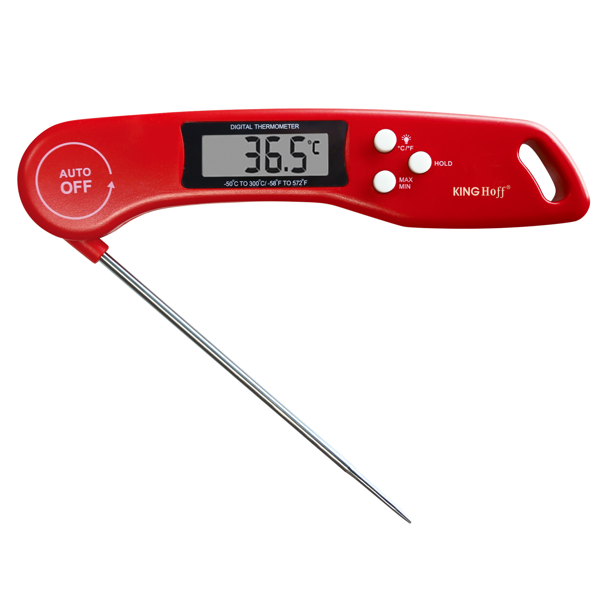Elektroniczny termometr kuchenny KingHoff w intensywnie czerwonym kolorze to nie tylko praktyczne, ale i stylowe narzędzie, które doskonale sprawdzi się w każdej kuchni. Umożliwia szybki i dokładny pomiar temperatury potraw – mięs, sosów, wypieków czy dań z grilla. Wyposażony w podświetlany, obrotowy wyświetlacz LCD oraz funkcje HOLD, MAX/MIN i zmianę jednostek °C/°F, gwarantuje wygodę użytkowania nawet w trudnych warunkach oświetleniowych. Składana sonda, magnes i otwór do zawieszania ułatwiają przechowywanie i dostępność termometru zawsze wtedy, gdy go potrzebujesz.