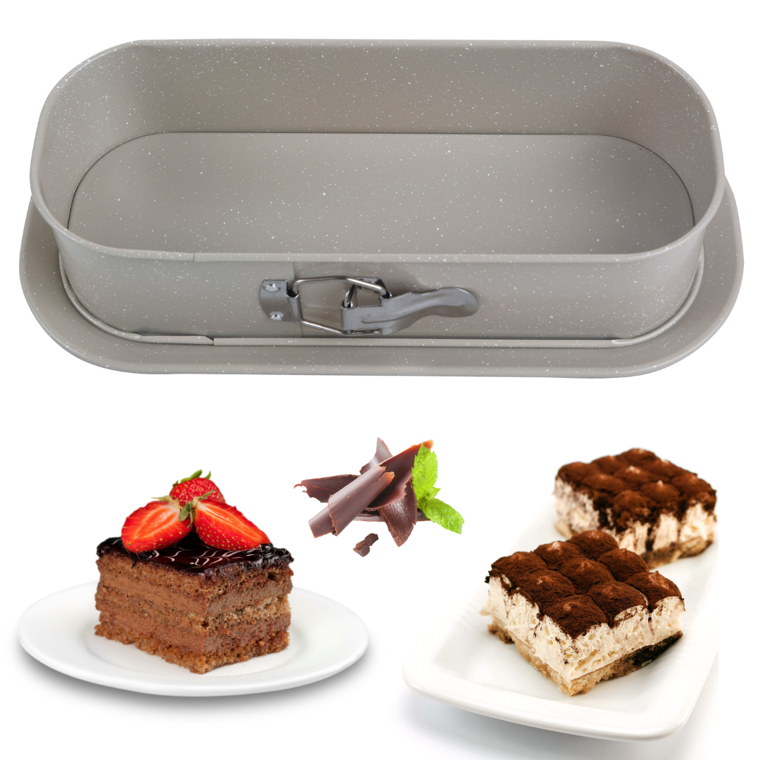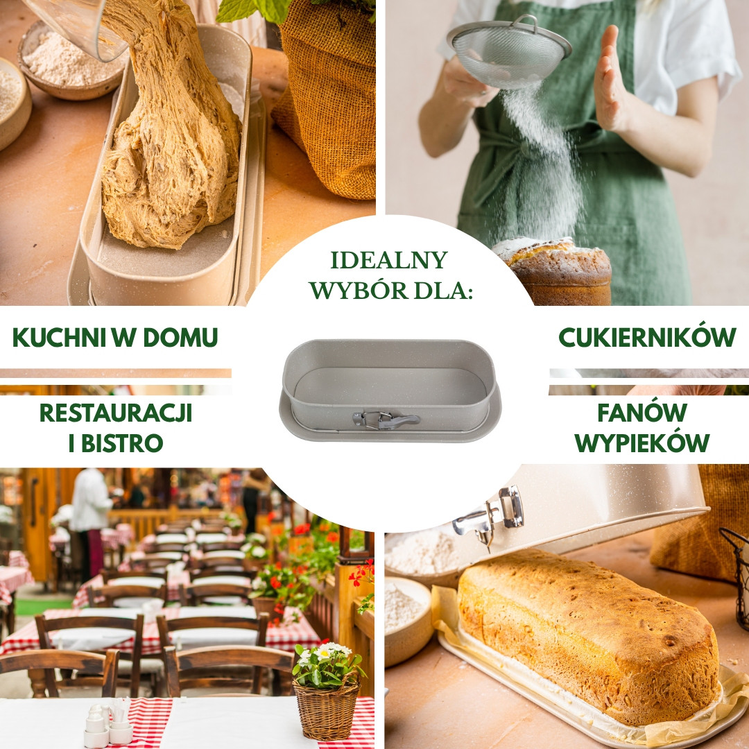 Dzięki stabilnej tacy dolnej unikniesz zabrudzeń piekarnika i łatwo przeniesiesz formę na blat lub stół. Jej uniwersalny rozmiar 34,5 × 15,5 × 8 cm sprawdza się zarówno przy pieczeniu chleba i keksów, jak i przy deserach na zimno – sernikach, tiramisu czy warstwowych ciastach.