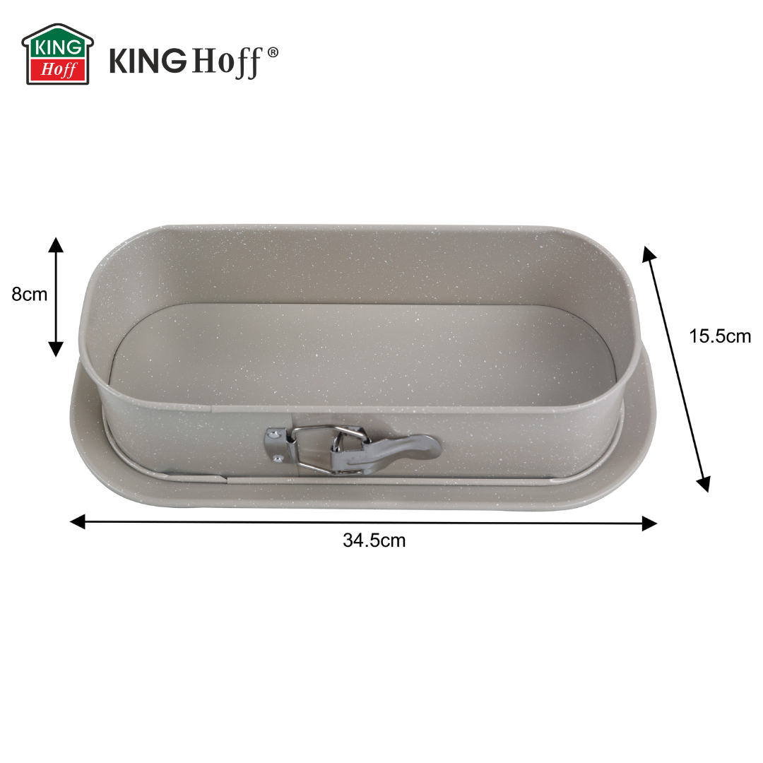 Forma KINGHoff KH-1976 to podłużna forma z odpinanym bokiem i klamrą, zaprojektowana z myślą o wygodnym pieczeniu i estetycznym serwowaniu. Wykonana z grubej stali węglowej, doskonale przewodzi ciepło, zapewniając równomierne pieczenie nawet gęstych mas. Nieprzywierająca powłoka sprawia, że wypiek łatwo odchodzi od formy bez ryzyka uszkodzenia ciasta, a sprężynowy zamek umożliwia szybkie otwieranie i podanie bez konieczności przenoszenia zawartości.