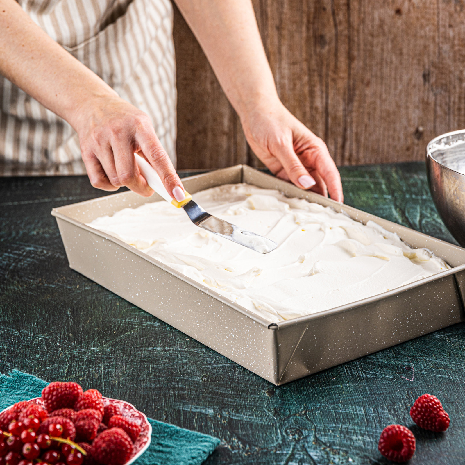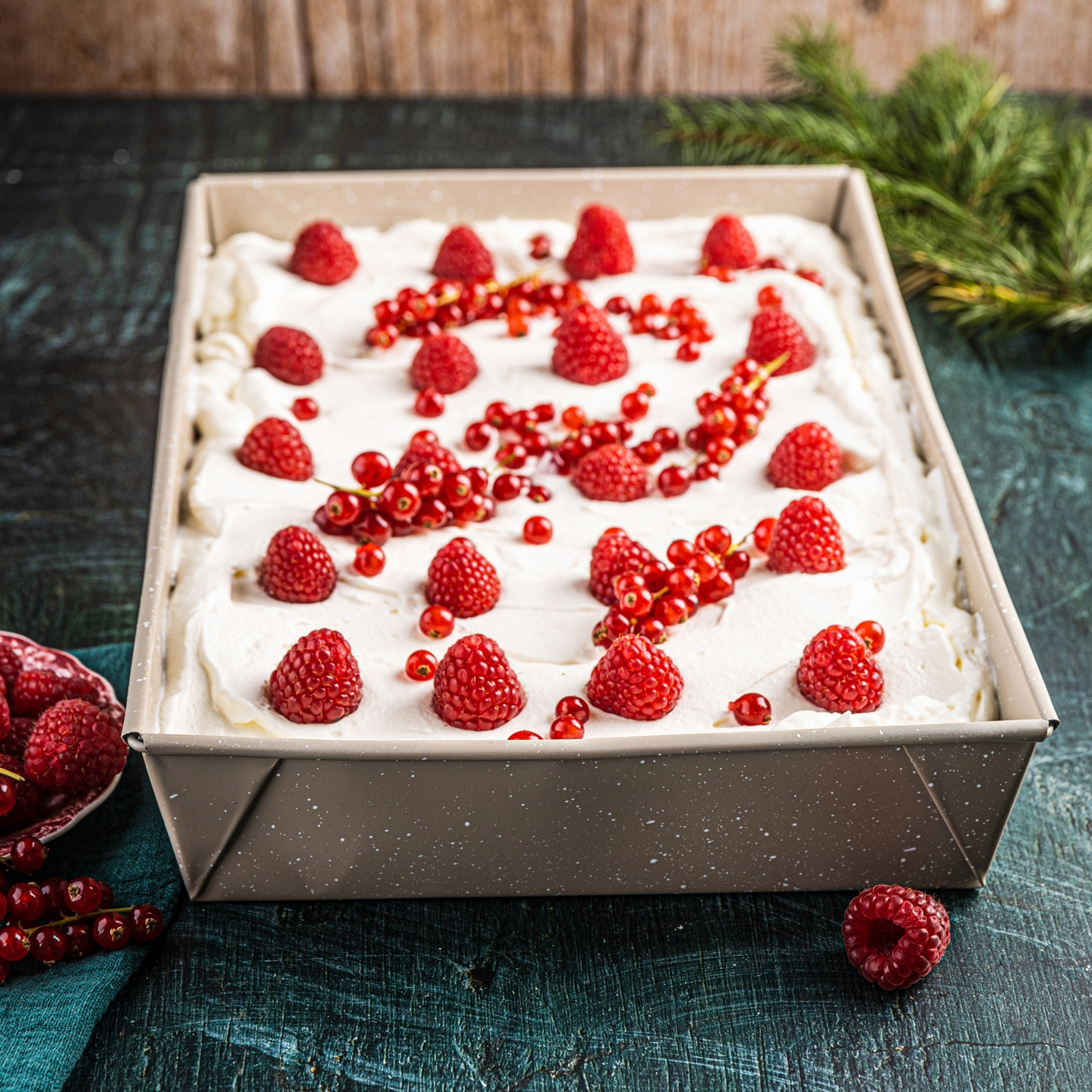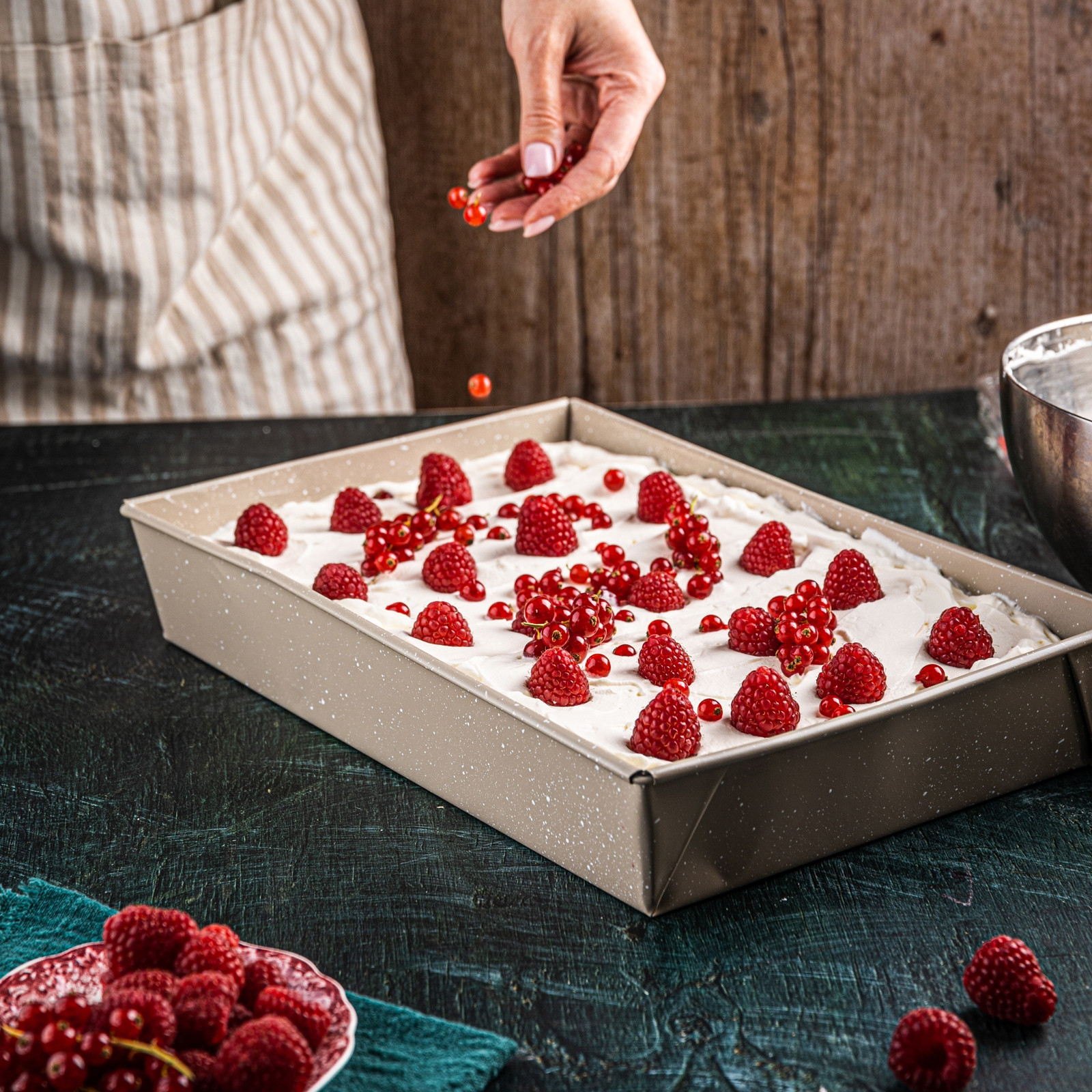 Dzięki wysokim ściankom (6 cm) i stabilnym krawędziom forma zachowuje kształt nawet przy cięższych masach, takich jak serniki, miodowniki czy karpatki. Tłoczone dno wspomaga cyrkulację powietrza, co zapobiega zakalcowi i pozwala uzyskać chrupiący, równy spód.