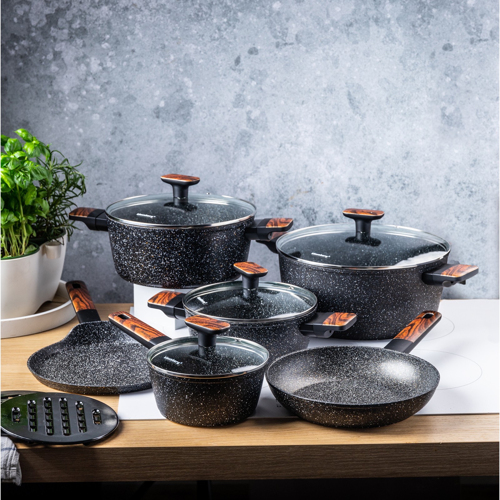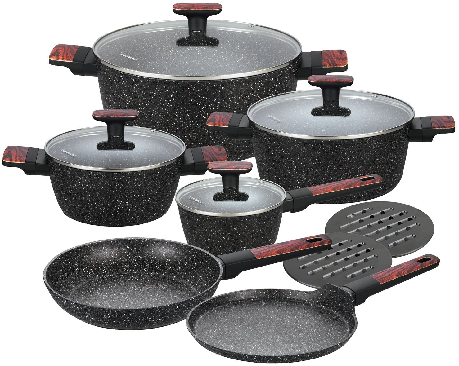 Garnki w zestawie, 12 elementów, z powłoką nieprzywieralną, czarne z brązowymi drewnianymi uchwytami, Klausberg