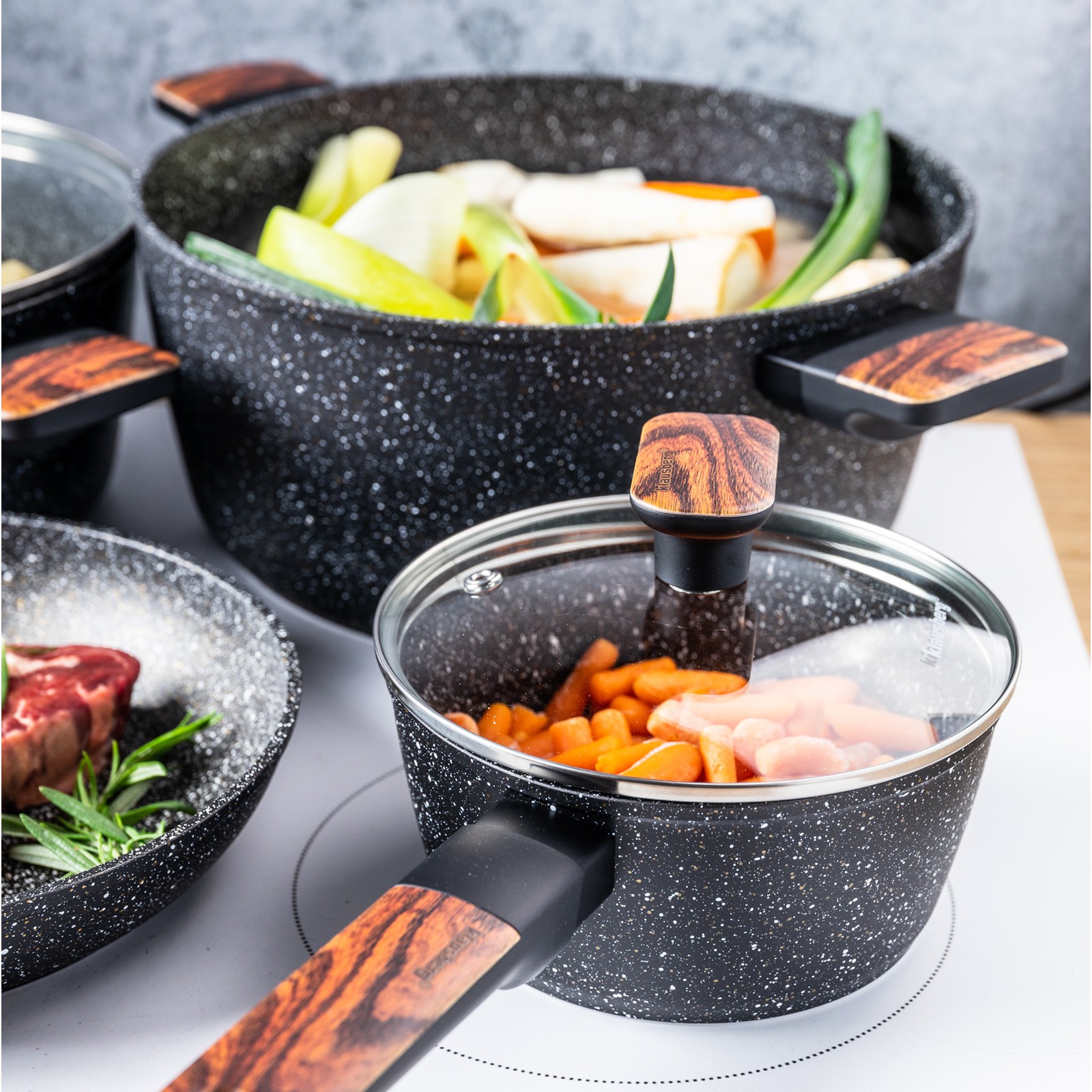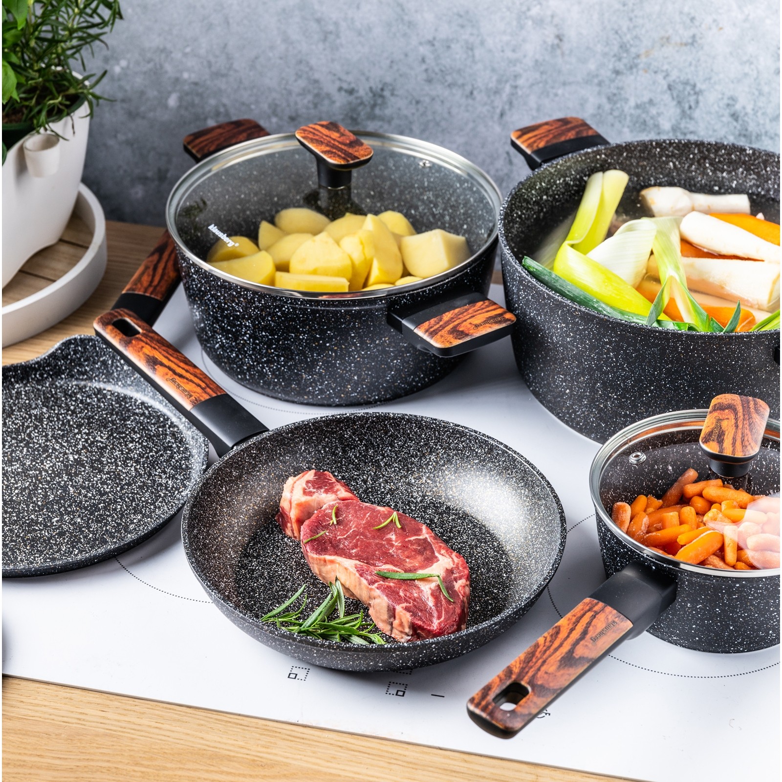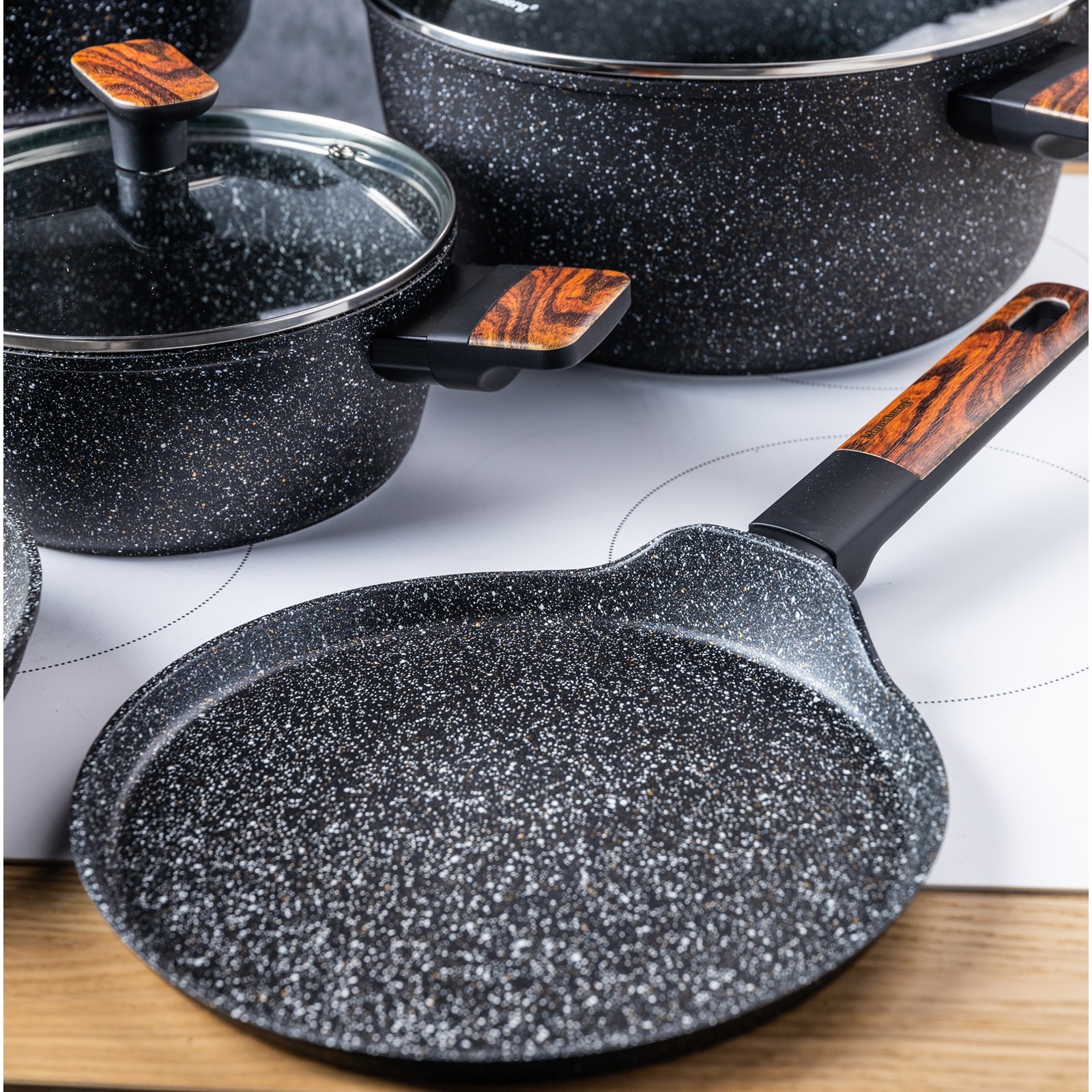 Marmurkowa powłoka zastosowana w tym zestawie to innowacyjne rozwiązanie, które łączy zalety naczyń żeliwnych i teflonowych. Jest twardsza i bardziej odporna niż tradycyjny teflon, a jednocześnie pozwala na łatwe smażenie i równomierne rozprowadzanie ciepła. Dzięki temu każdy posiłek jest przygotowywany szybciej i z minimalnym ryzykiem przypalenia.