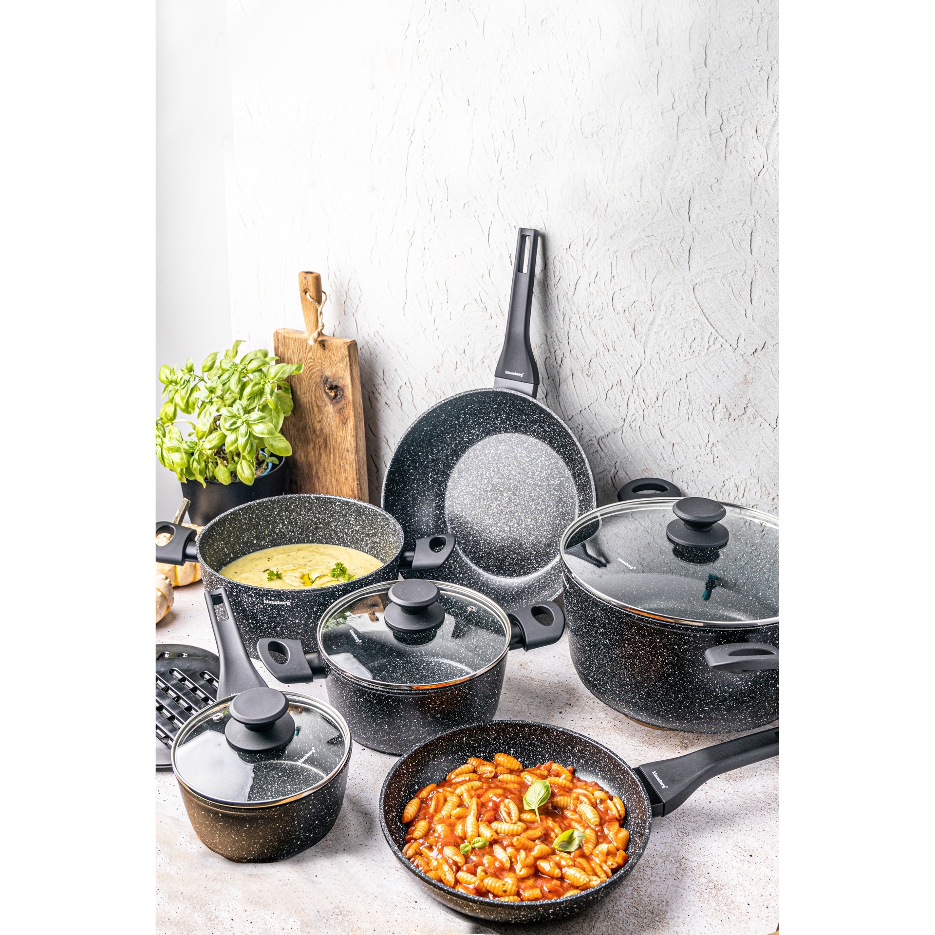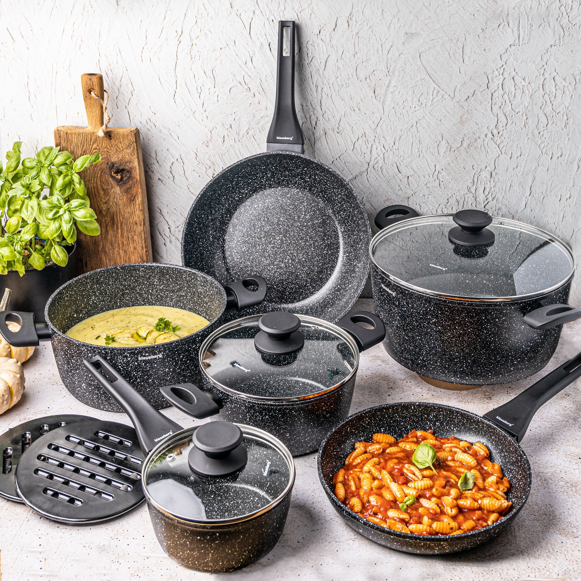 Zaprezentuj swojej kuchni prawdziwą rewolucję w dziedzinie gotowania dzięki zestawowi składającemu się z 12 elementów z marmurkową powłoką nieprzywieralną. Ekskluzywny design spotyka się z niezrównaną funkcjonalnością, czyniąc ten zestaw idealnym rozwiązaniem dla każdego nowoczesnego kucharza.