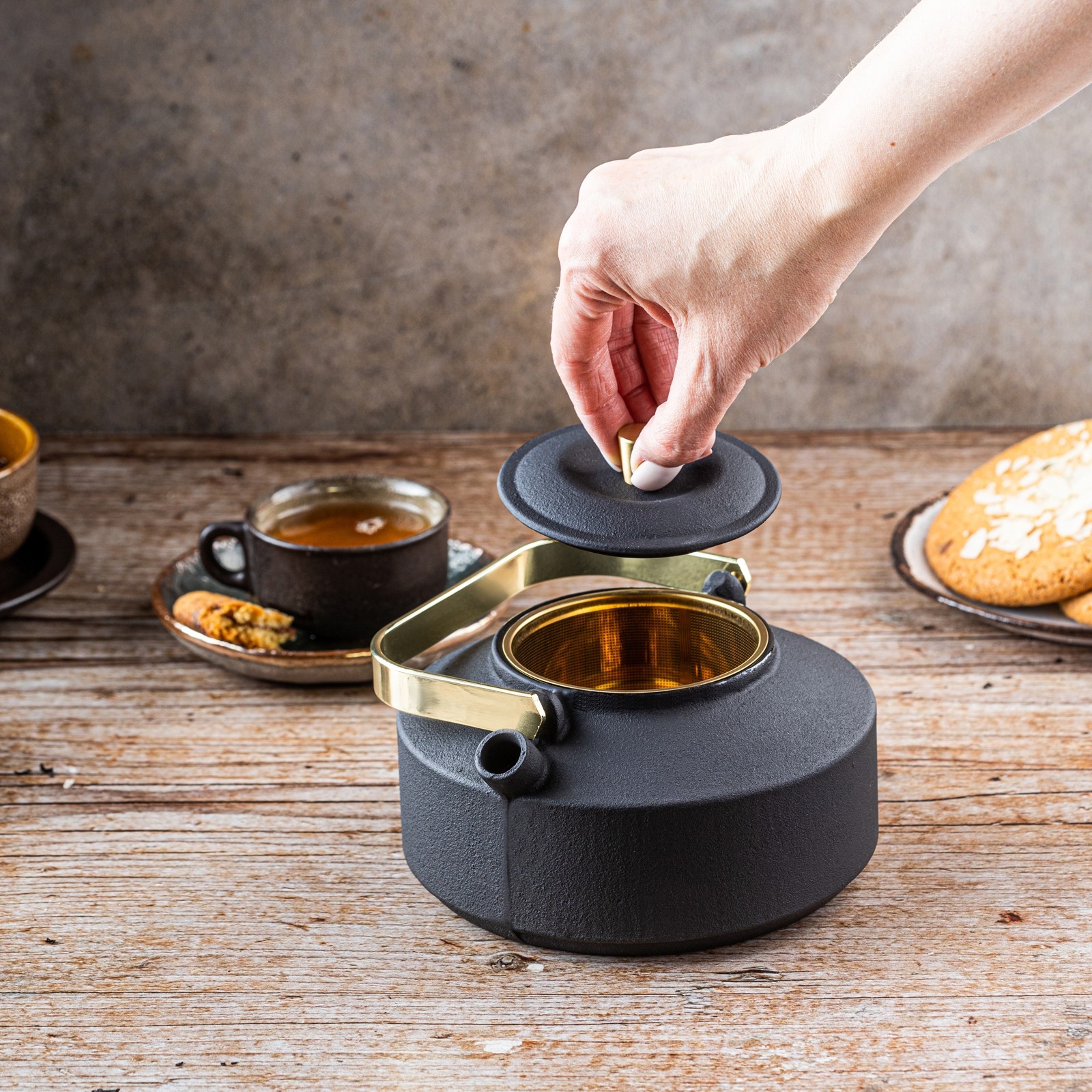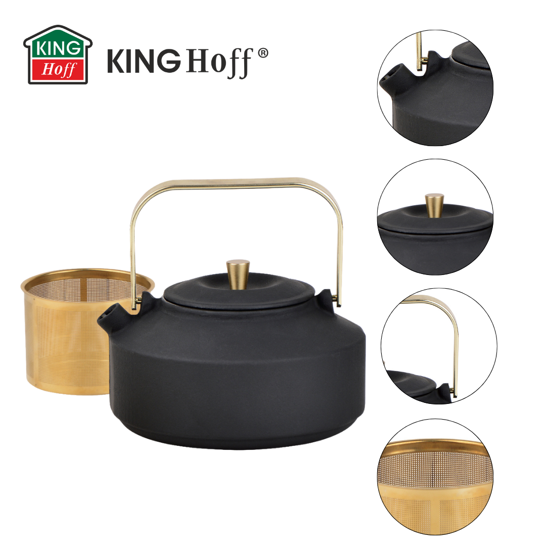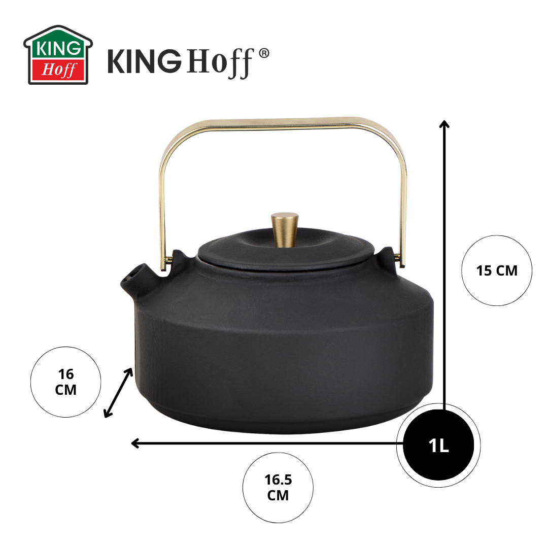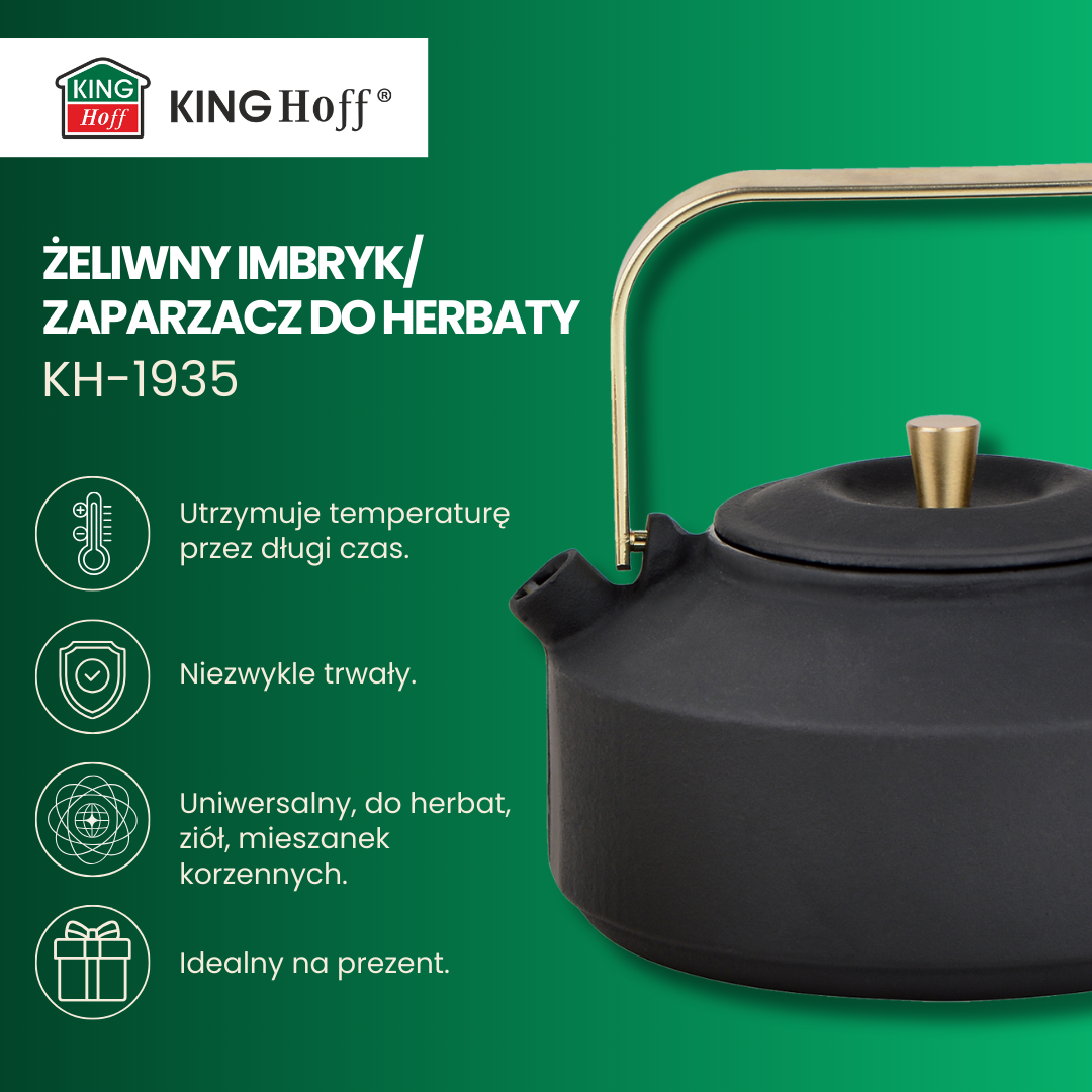 Żeliwny zaparzacz KINGHoff KH‑1935 łączy surową, matową czerń z wyrazistymi, złotymi akcentami, nadając codziennemu parzeniu herbaty elegancką oprawę. Masę żeliwa docenisz za długie utrzymywanie temperatury, a emaliowane wnętrze – za łatwe czyszczenie i neutralny smak naparu.