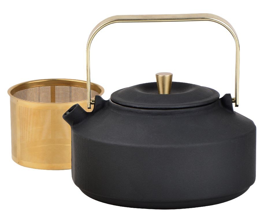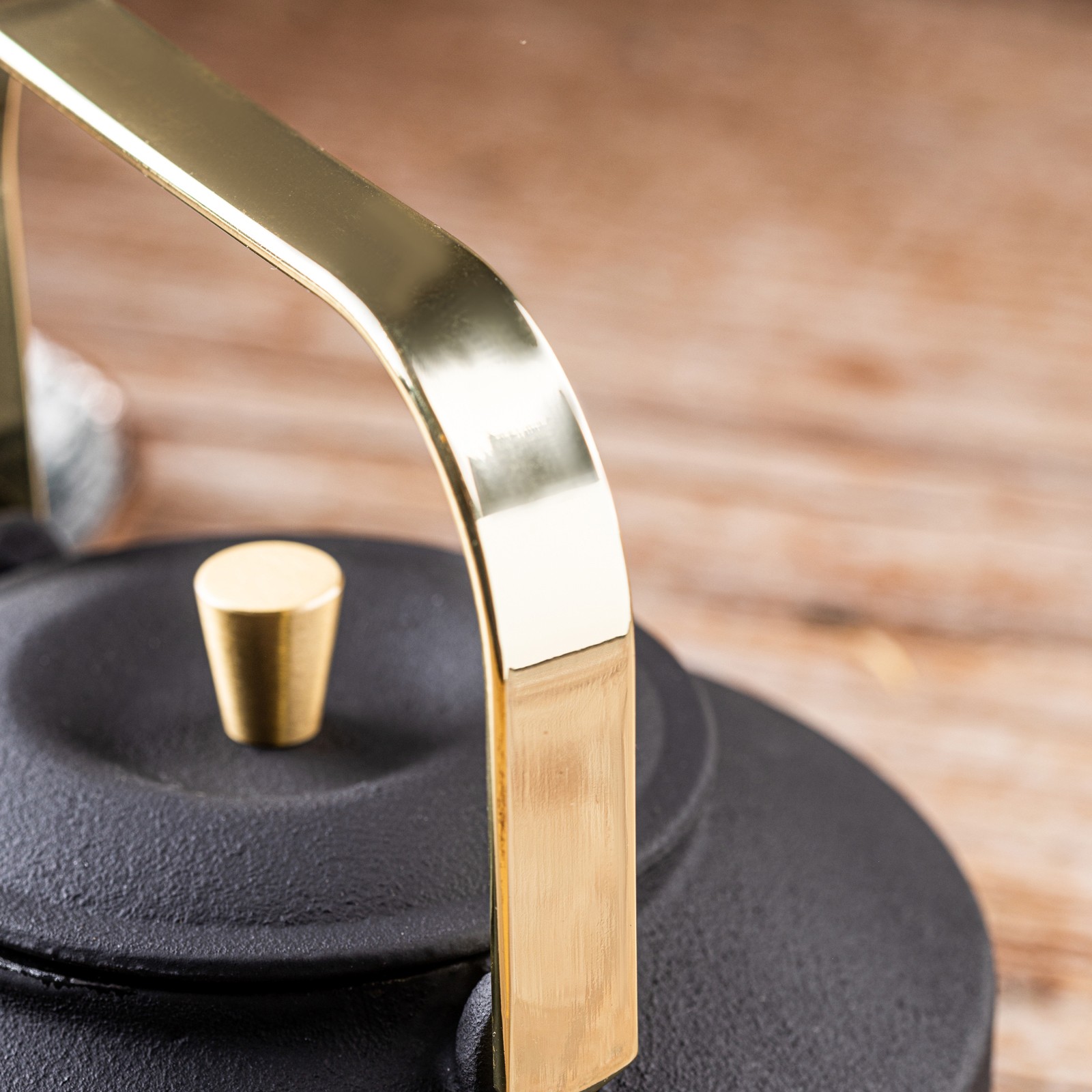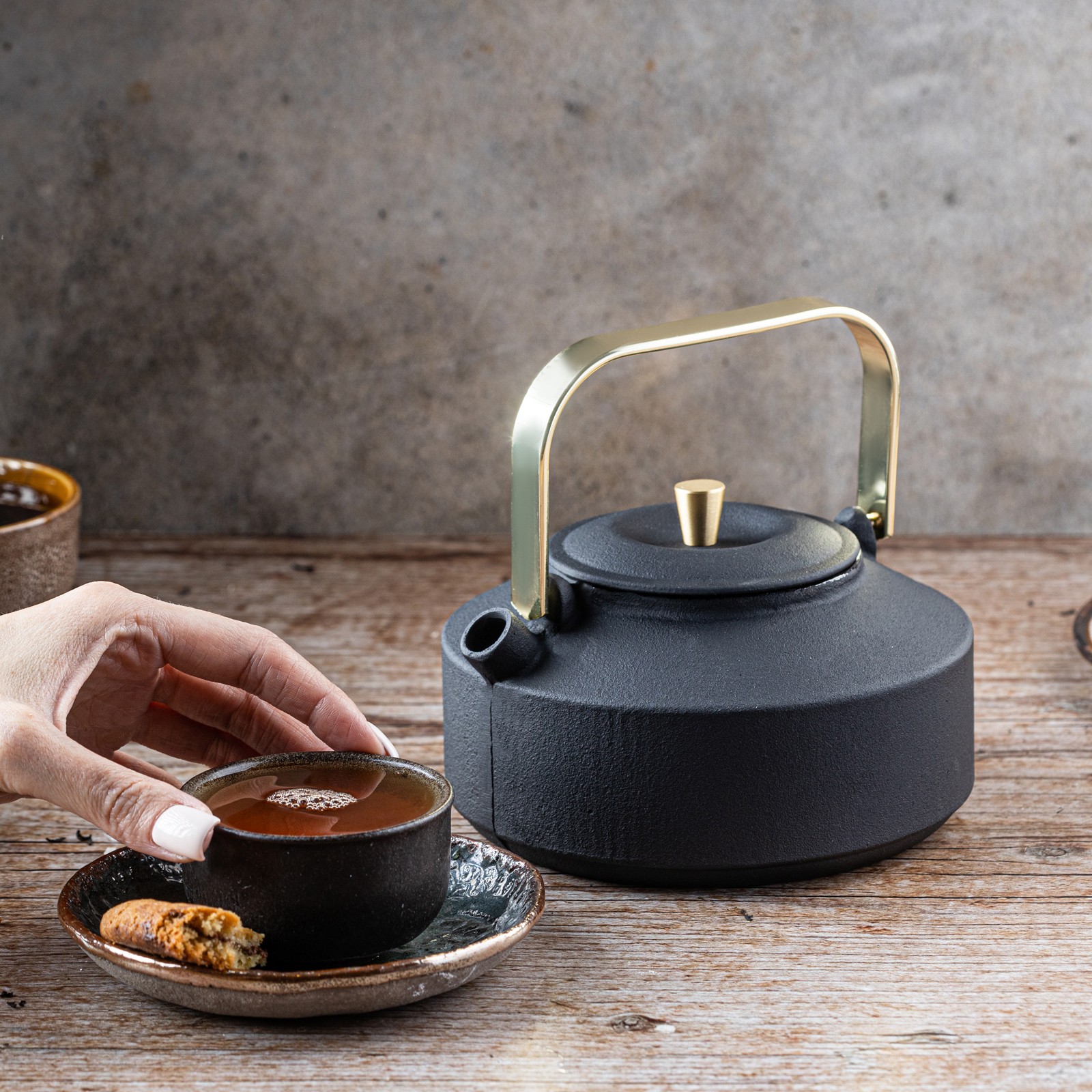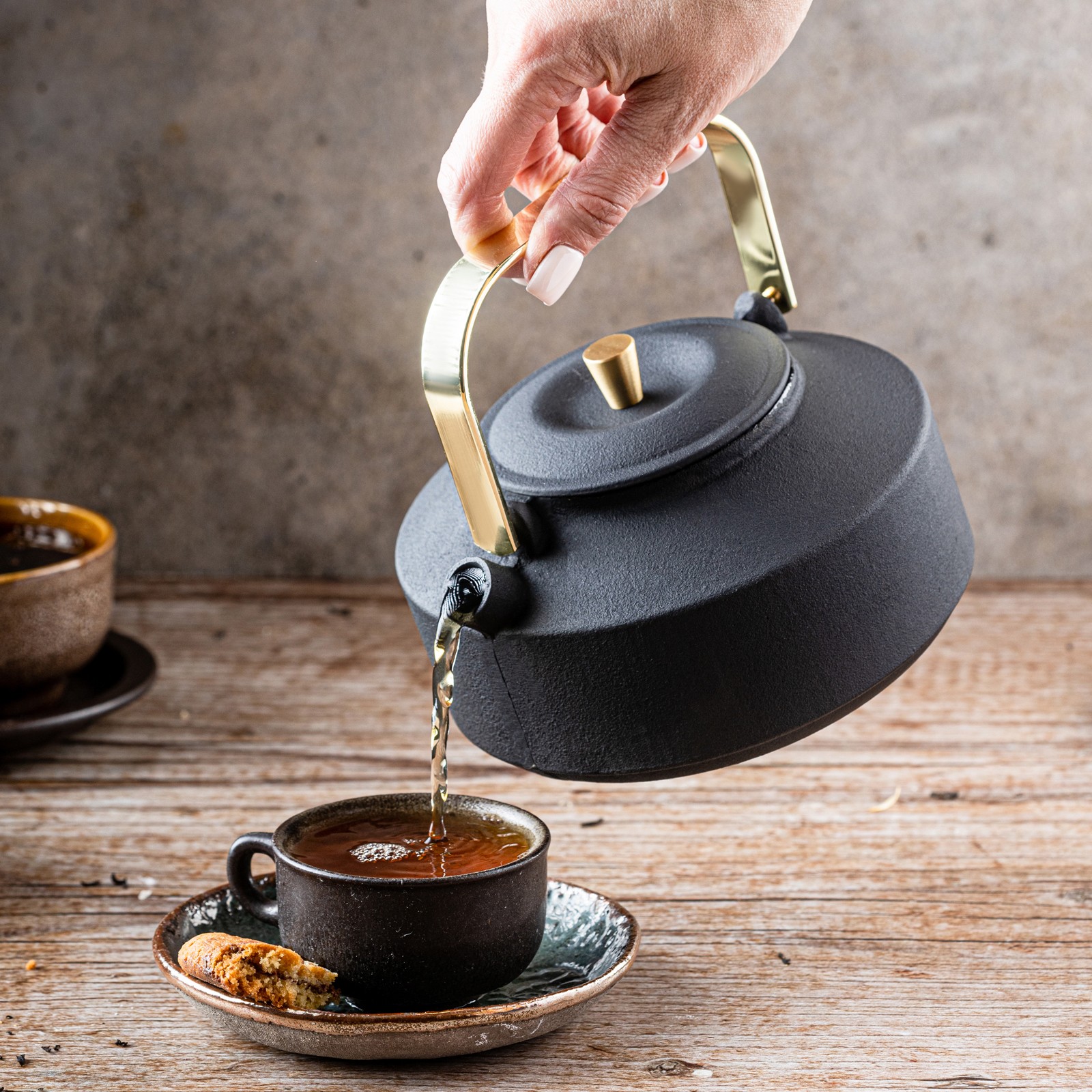 Żeliwny zaparzacz KINGHoff KH‑1935 łączy surową, matową czerń z wyrazistymi, złotymi akcentami, nadając codziennemu parzeniu herbaty elegancką oprawę. Masę żeliwa docenisz za długie utrzymywanie temperatury, a emaliowane wnętrze – za łatwe czyszczenie i neutralny smak naparu.