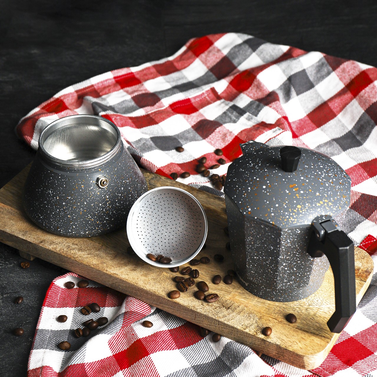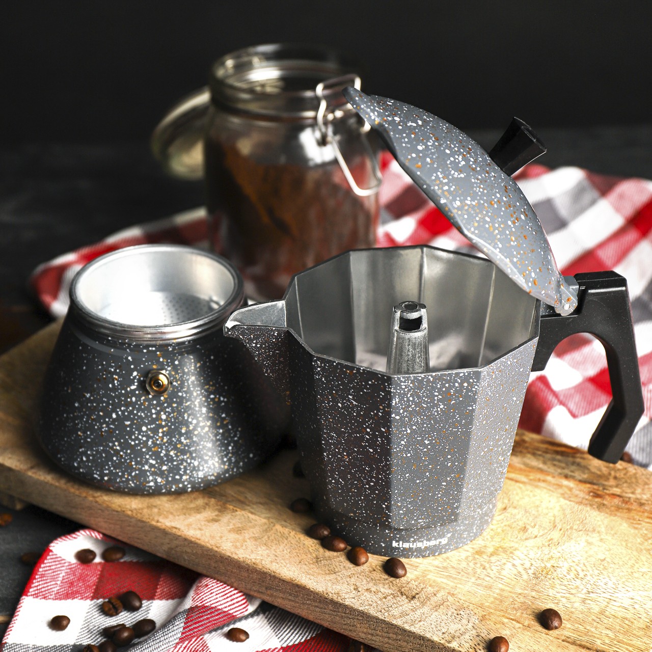 Stylowa i funkcjonalna kawiarka Klausberg KB-7298 to idealny wybór dla wielbicieli włoskiego espresso w większym gronie. Jej szare marmurkowe wykończenie w połączeniu z klasycznym designem tworzy nowoczesny akcent w każdej kuchni. Dzięki pojemności na 12 filiżanek możesz szybko i wygodnie przygotować pyszną kawę dla całej rodziny lub gości.