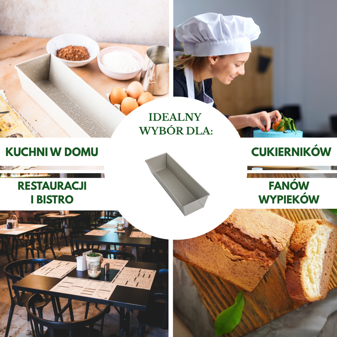 Dno formy ma delikatną strukturę teksturowaną, co sprzyja lepszemu odprowadzaniu pary i zmniejsza ryzyko zakalca. Dzięki dużemu rozmiarowi 35×11,5×7,5 cm keksówka sprawdzi się nie tylko do klasycznych keksów, ale też do domowego chleba, pasztetów, ciast drożdżowych i chlebków bananowych.