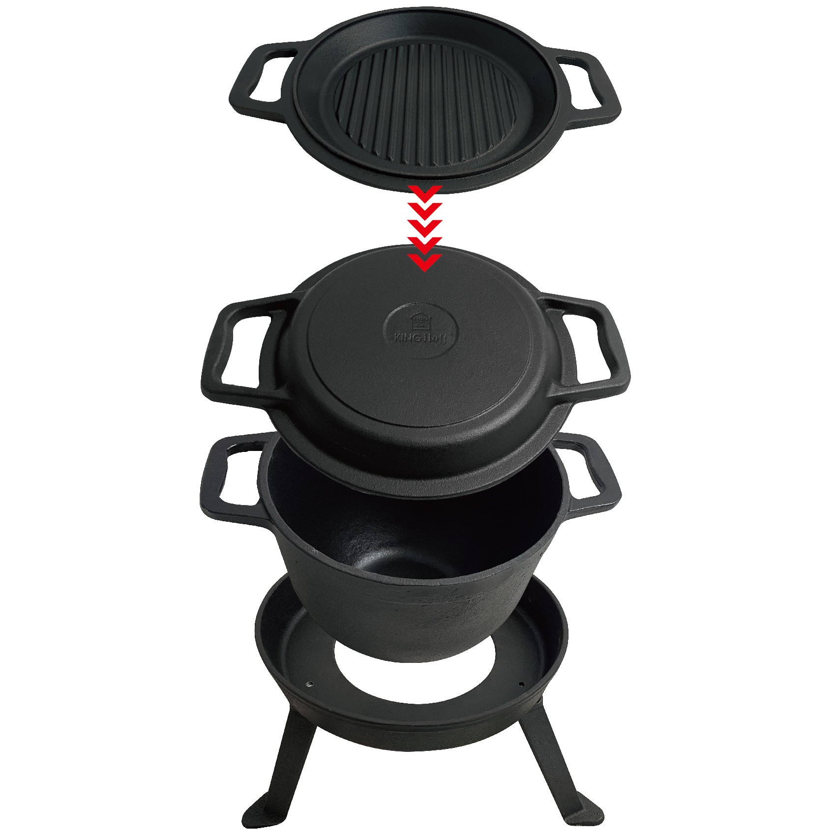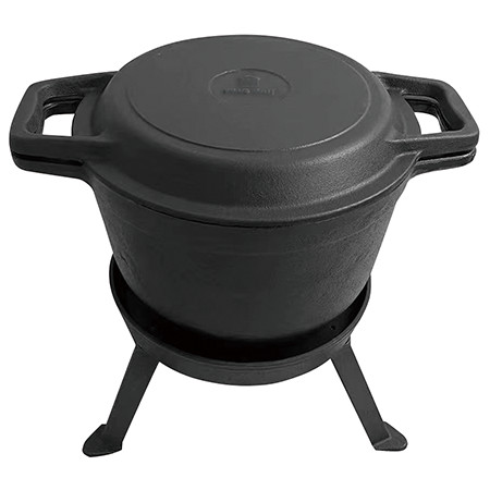 Wielofunkcyjny kociołek wykonany z odlewu żeliwa. Materiał garnka kempingowego zapewnia długotrwałe zachowanie formy, a dno nie ulega wybrzuszeniu. Garnek idealny do potraw jednogarnkowych, do użytku przez cały rok nie tylko w plenerze ale również w kuchni na kuchenkach i piekarniku.