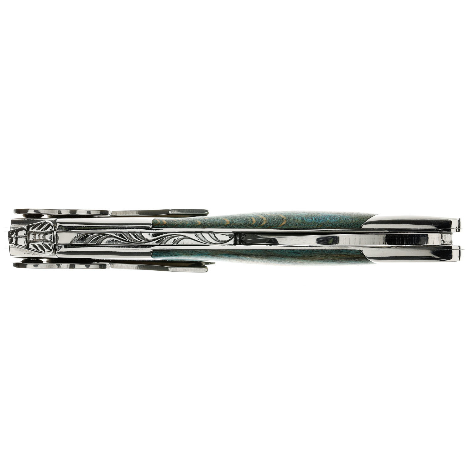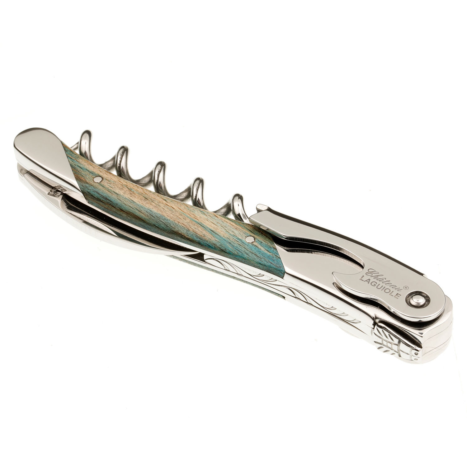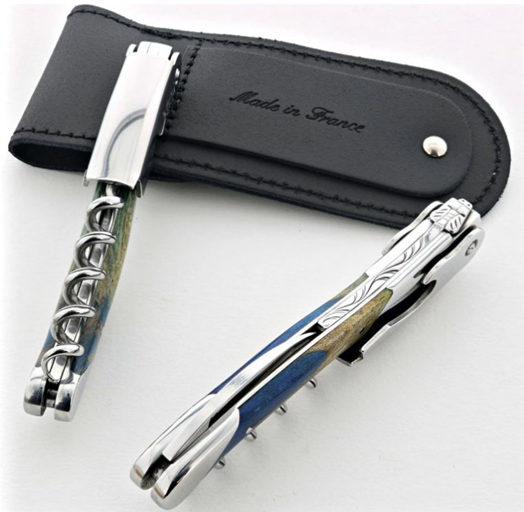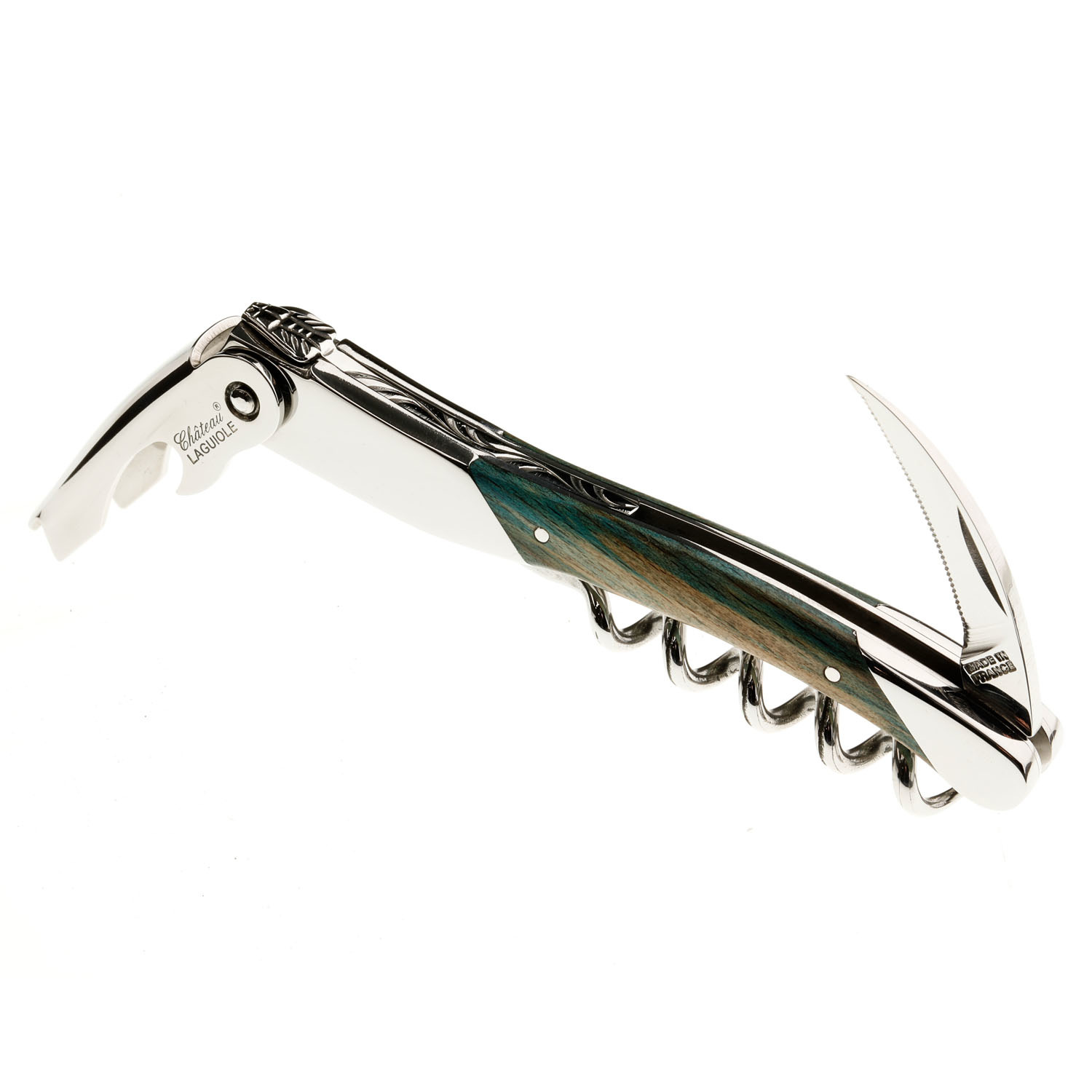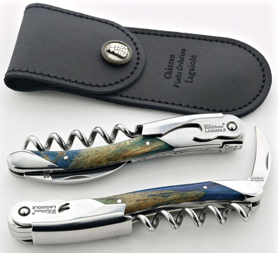 Linia Grand Cru korkociągów Château Laguiole została stworzona po to by dostarczyć światu najbardziej wytrzymałe i stylowe korkociągi. Główne cechy tych korkociągów są takie same jak w przypadku korkociągów z linii Classic. Różnią się jedynie dodatkową szczyptą elegancji oraz zwiększoną odpornością na trudy pracy (ponad 20 butelek dziennie). Aby wpasować się w różne gusta, producent oferuje wybór aż 33 różnych materiałów i kolorów okładzin rękojeści. Prezentowany model posiada okładziny rękojeści wykonane z drewna bukowego barwionego na niebiesko. Wszystkie korkociągi Château Laguiole są wykonane ze stali nierdzewnej 12C27 i ważą około 113g. Długość całkowita wynosi około 4,06cm.