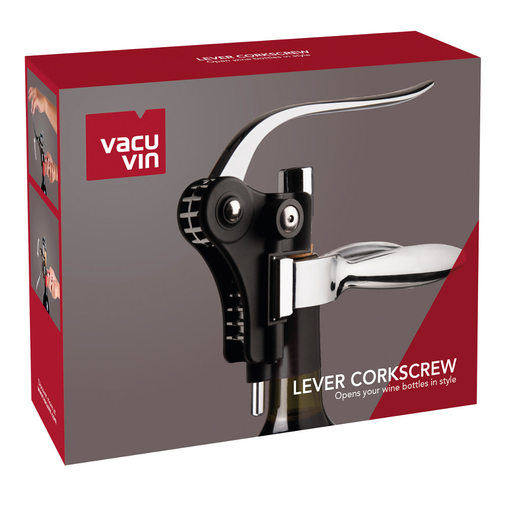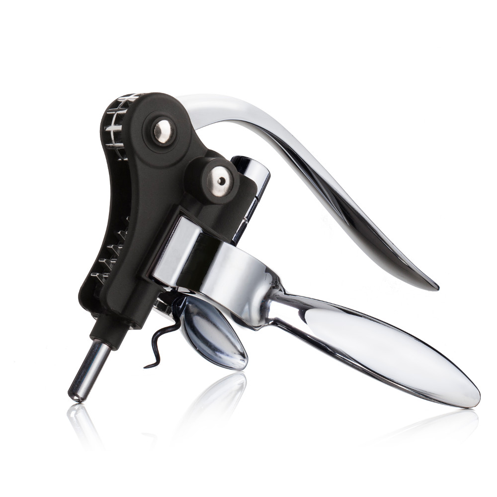 Elegancki korkociąg dźwigniowy zapewniający pewny uchwyt szyjki. Wystarczy ruch dźwigni w dół i w górę aby wyciągnąć korek.