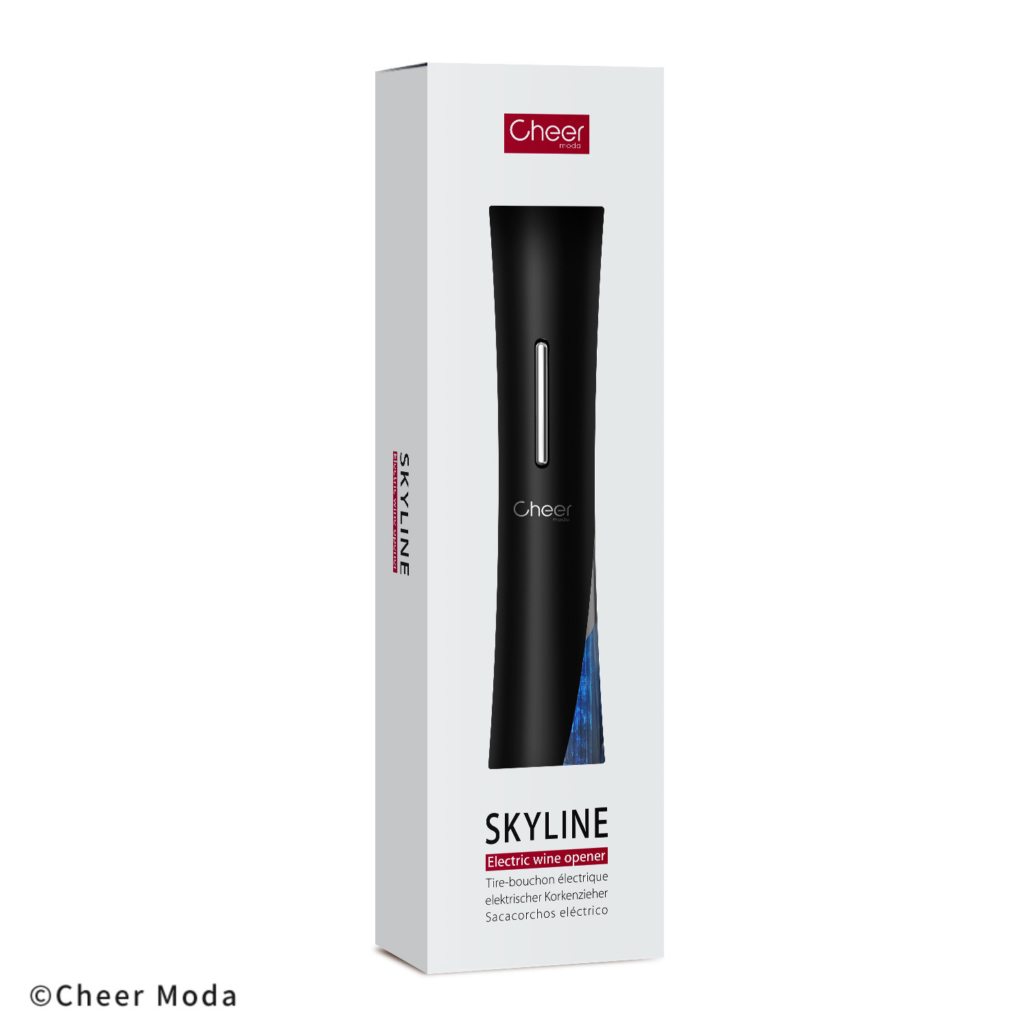 Skyline jest flagowym produktem linii Vitality, zwycięzcą nagrody Good Design Awards z roku 2018, reprezentującym elegancję oraz wygodę. Kształt korkociągu został zainspirowany architekturą budynku Canton Tower w mieście Kanton, super dynamicznym mieście, będącym zarazem miejscem, z którego pochodzi Cheer Moda. Szczególnie efektywny oraz łatwy w użyciu, pozwala na otwarcie butelki wina w mniej niż 5 sekund oraz umożliwiając otwarcie do 120 butelek przy pomocy 4 baterii AA, które nie są dołączone do zestawu. Wraz z korkociągiem w opakowaniu znajduje się również nożyk do folii. Materiał: ABS, PC. Opakowanie: kartonowe pudełko prezentowe.