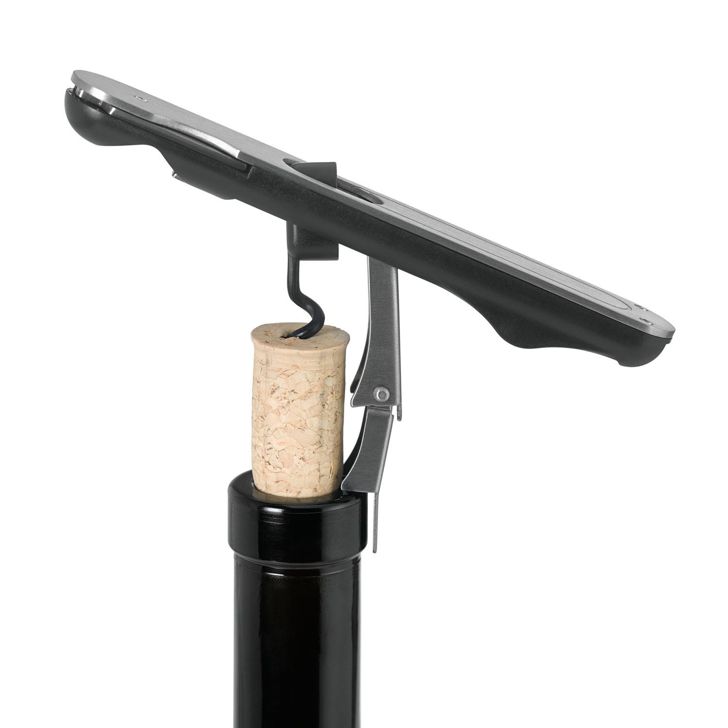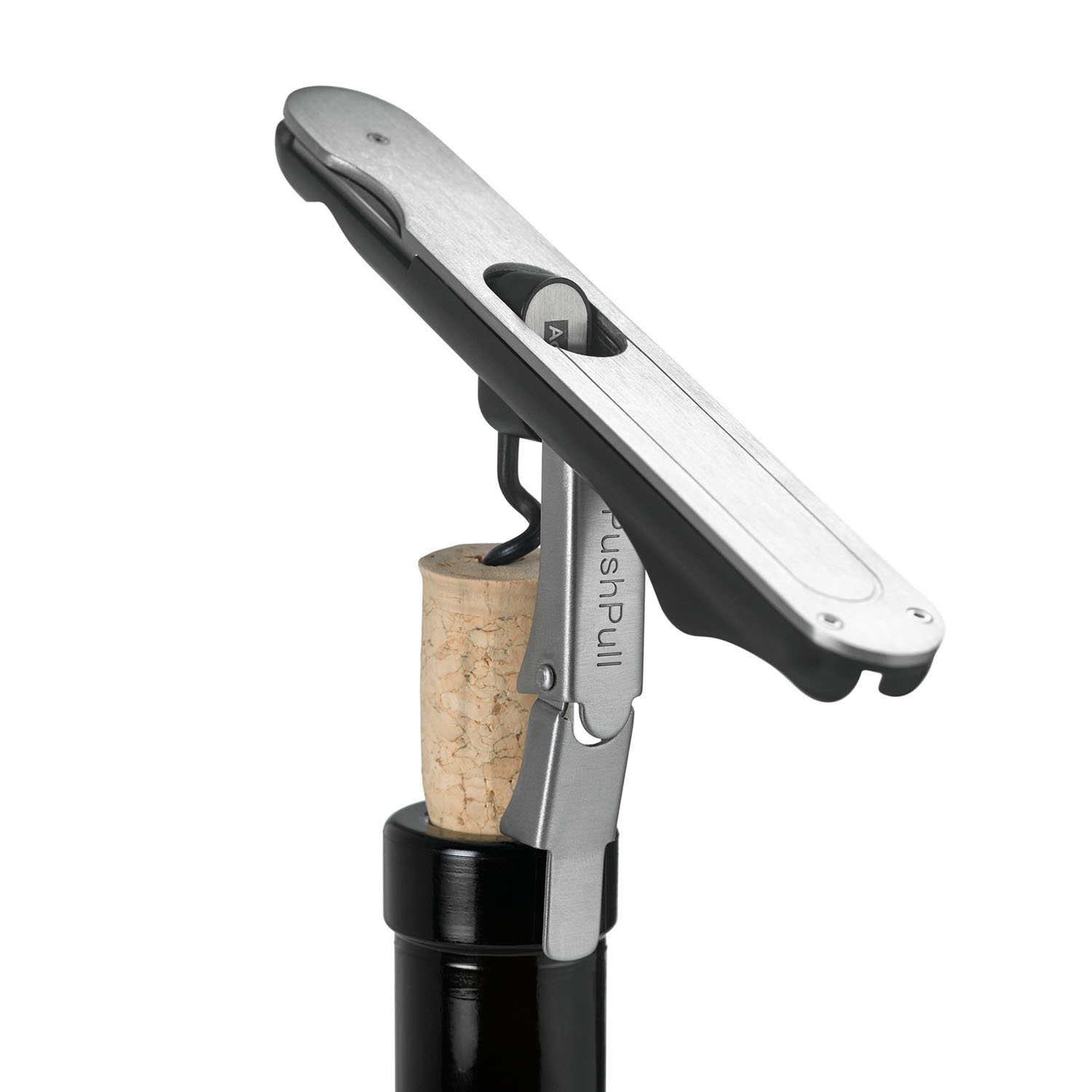 Specjalną cechą tego korkociągu jest odmienne działanie które należy wykonać w celu wyciągnięcia korka. W innych tego typu korkociągach do wyciągnięcia korka niezbędne jest ciągnięcie w górę, natomiast korkociąg PUSHPULL należy nacisnąć i wyciągnąć korek w dwóch krokach. Powlekana spirala zapewnia łatwe i delikatne wkręcanie się w korki naturalne i plastikowe. Korkociąg posiada zintegrowany odcinacz do folii i otwieracz butelek. Wszystko to składa się na zgrabne i kompaktowe narzędzie. Nie należy myć w zmywarce. Produkt został zaprojektowany przez AdHoc Design Team. Materiał: stal nierdzewna, plastik. Wymiary: długość – 15cm, szerokość – 2,1cm, wysokość – 1,6cm.