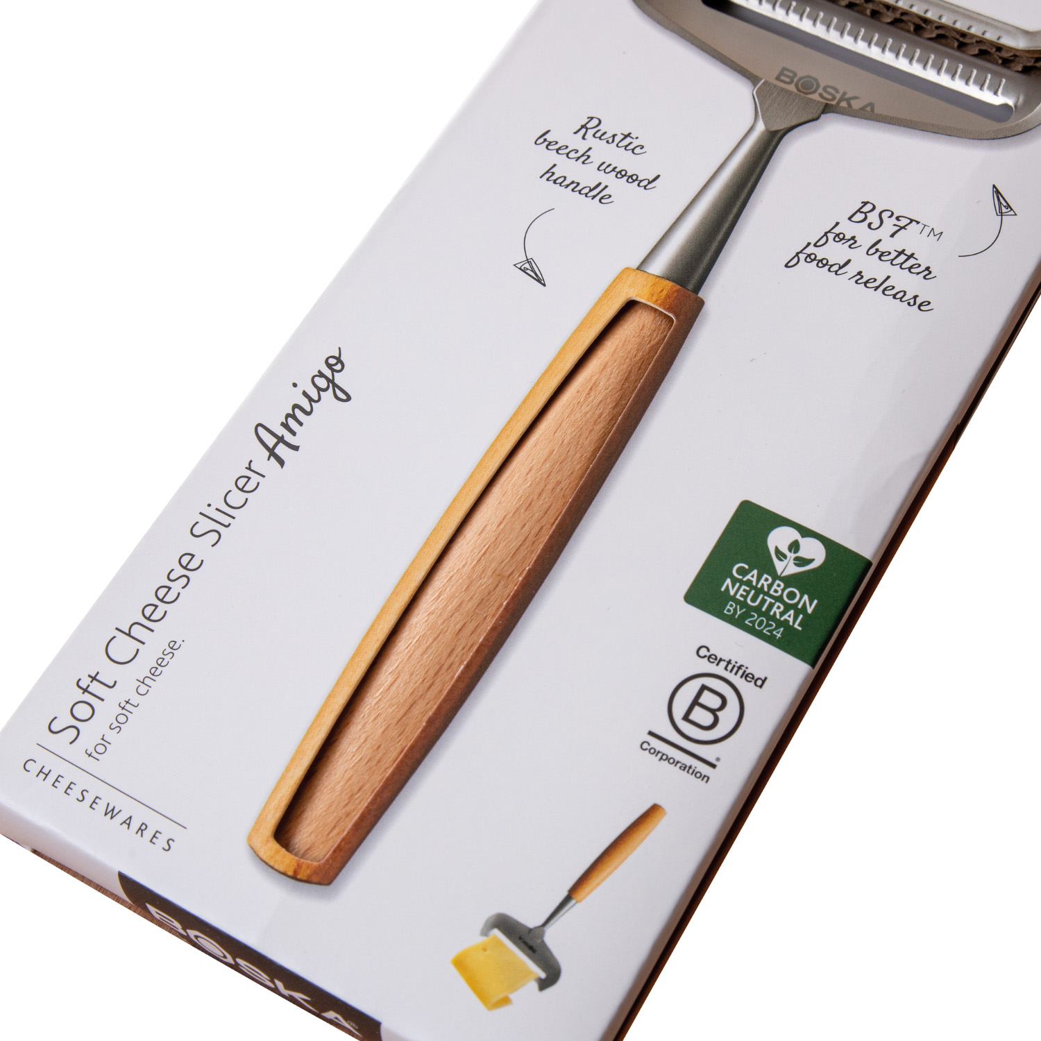 Krajacz do sera miękkiego rączką z drewna bukowego nadaje się do serów miękkich. Zębate ostrze zostało wykonane ze stali nierdzewnej pokrytej powłoką BSF™ co zapobiega przywieraniu sera podczas krojenia. Zaleca się myć ręcznie. Materiał: stal nierdzewna, drewno bukowe. Przybliżone wymiary: długość – 17,5cm, szerokość całkowita – 7,5cm, szerokość ostrza – 5,5cm. Przybliżone wymiary brutto: wysokość – 29cm, długość – 9,2cm, szerokość – 1,5cm. Przybliżona waga brutto: 0,108kg. Opakowanie: kartonowe pudełko prezentowe/ zawieszka z okienkiem.