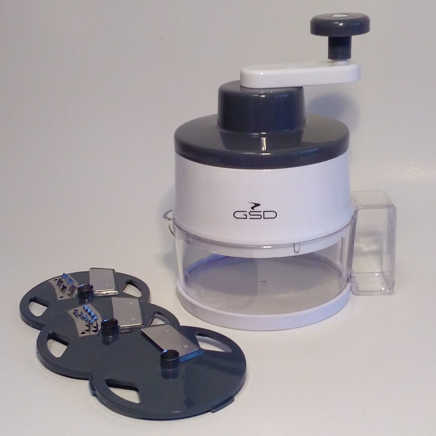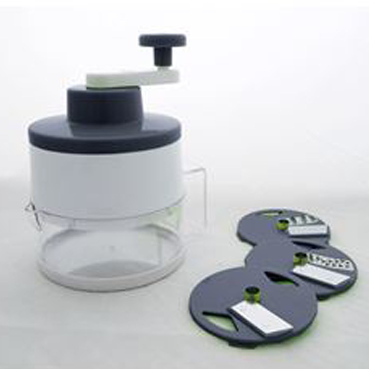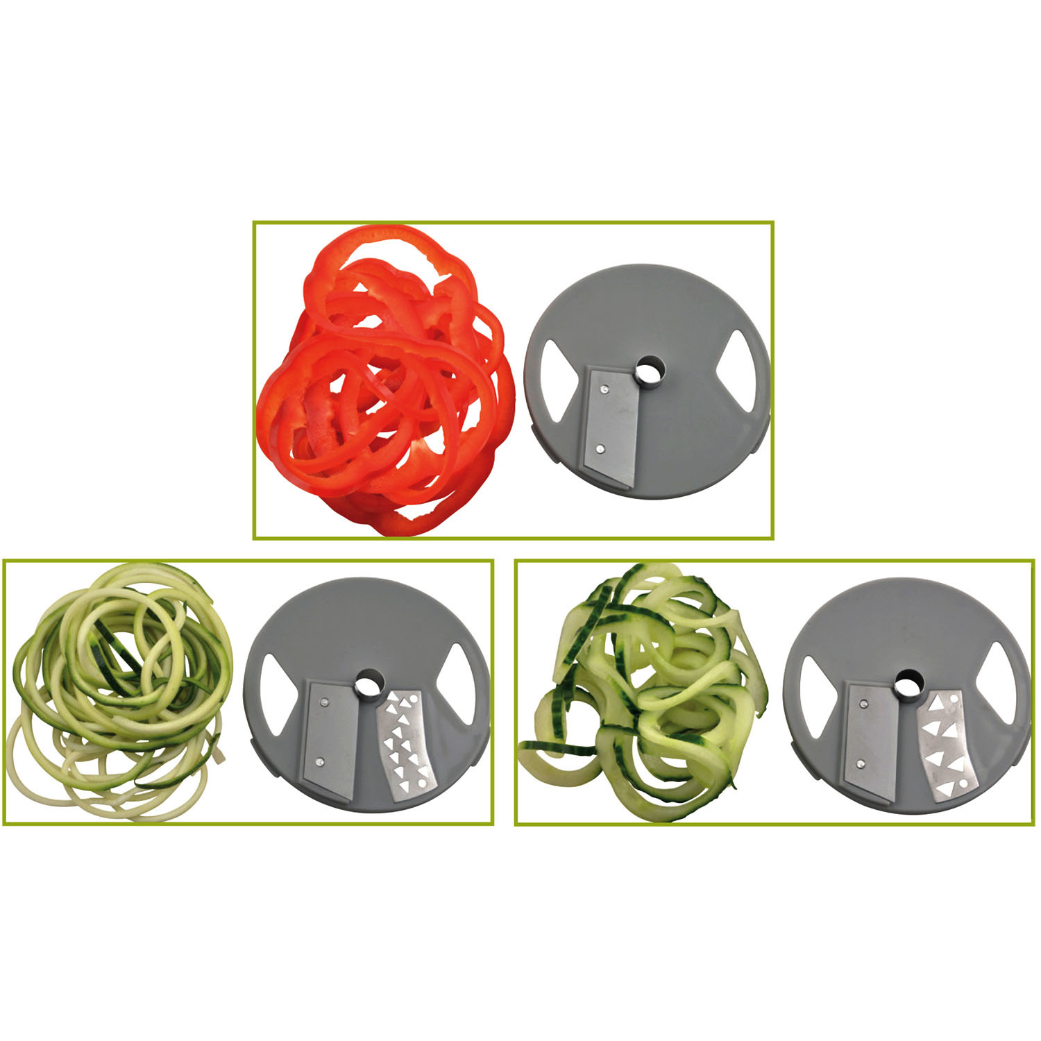 Krajalnica do warzyw z trzema tarczami do przygotowania warzywnego spaghetti. Niezbędna przy tworzeniu azjatyckich potraw. Niezwykle prosta w obsłudze. Wystarczy zdjąć pokrywę razem z korbką, położyć warzywo na tarczy i docisnąć je zakładając pokrywę. Po zakręceniu korbką w pojemniku pojawią się warzywne spirale. Pracę ułatwia gumowy, antypoślizgowy pierścień, który nie pozwala na przesuwanie się krajalnicy po blacie. Pojemnik został wyposażony w ucho ułatwiające jego przenoszenie oraz dziubek pozwalający na odsączenie pokrojonych warzyw. W zestawie znajdują się 3 tarcze krojące. Dwie kroją warzywa w nitki, a jedna pozwala uzyskać szeroką wstążkę. Każda z tarcz ma po przeciwnych stronach wycięcia na palce ułatwiające ich montowanie w krajalnicy. Należy zawsze z nich korzystać w trakcie wykonywania tej czynności, aby uniknąć skaleczenia ostrzami. Zalecane jest mycie ręczne.