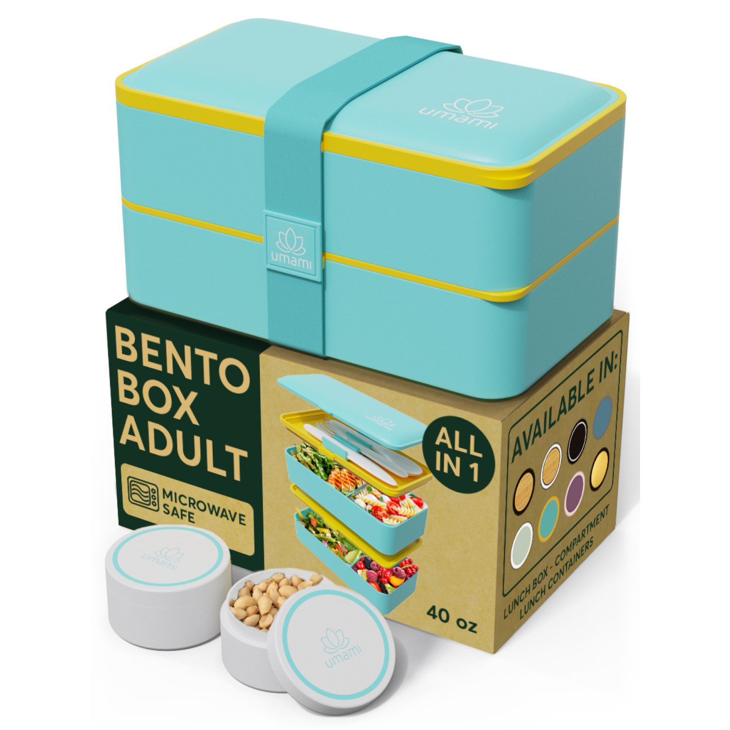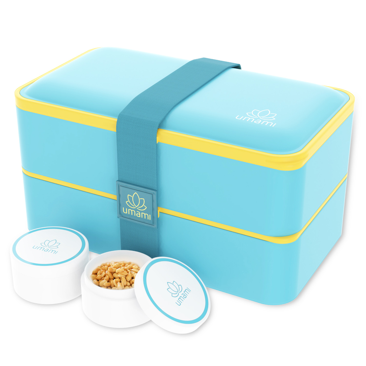 Lunchbox Original – Fresh Turquoise składa się z: 2 pojemników o pojemności 600ml, 2 pojemników na sos o pojemności 30ml, 2 mobilnych przegród, 2 pokryw do pojemników z zaworkiem, pokrywy górnej, gumowej taśmy spinającej, sztućców z tworzywa: widelec, nóż i łyżka. Lunchboxy UMAMI są dopracowane w każdym detalu w trosce o komfort użytkownika. Specjalną uwagę zwraca szczelne zamknięcie pojemników. Wokół pokrywy zamykającej pojemnik umieszczono silikonową uszczelkę a w pokrywie silikonowy zaworek. Bez wysiłku otworzysz i zamkniesz szczelnie pojemnik. Dodatkowe akcesoria: pojemniki na sos, sztućce i mobilne przegrody dostępne w zestawie pozwolą zorganizować funkcjonalnie przestrzeń. Pojemniki zostały wykonane z tworzywa BPA Free przeznaczonego do kontaktu z żywnością. Naczynia ze zestawu można używać: – w zamrażalce do mrożenia, max -20oC, – kuchence mikrofalowej nie dłużej niż przez 3 minuty, max 120oC bez pokrywy górnej, – można myć w zmywarce (bez pokrywy górne) w delikatnych cyklach mycia dedykowanych specjalnie dla tworzyw, co uławia czyszczenie i oszczędza czas. Solidna, gumowa opaska trzyma całość razem dociskając pojemniki do pokrywy górnej pod którą znajdują się sztućce. Instrukcja korzystania z lunchboxa Umami: – przed pierwszym użyciem umyj wszystko dokładnie i osusz, jeśli korzystasz ze zmywarki pamiętaj, aby elementy z tworzywa umyć w cyklu do tworzyw sztucznych – temperatura mycia max 30oC, – elementy gumowe należy czyścić ręcznie bez zanurzania w wodzie, – otwierając pojemnik należy najpierw otworzyć zaworek na pokrywie a następnie chwycić pokrywę za róg i pociągnąć do góry, przytrzymując pojemnik drugą ręką. – zamykając pojemnik, należy najpierw otworzyć zaworek na pokrywie, nałożyć pokrywę na pojemnik dociskając do dołu i zamknąć zaworek. – silikonowe uszczelki pojemnika powinny być zawsze czyste i suche, ponieważ to gwarantuje szczelność pojemników. Zatłuszczone i wilgotne uszczelki mogą być przyczyną przeciekania pojemnika. – na płynną zawartość typu: sosy, dipy przeznaczone są małe zakręcane pojemniczki. W ofercie marki UMAMI są również torby termiczne na lunchboxy. Torba to eleganckie i wygodne rozwiązanie w transporcie pojemników. Przybliżone wymiary pojemnika o pojemności 600ml bez pokrywy: – wysokość: 4,5cm, – długość: 18,5cm, – szerokość: 11cm. Przybliżone wymiary pojemnika o pojemności 600ml z pokrywą: – wysokość: 4,6cm, – długość: 18,6cm, – szerokość: 11cm. Przybliżone wymiary pojemnika na sos: – wysokość: 3cm, – średnica: 4,8cm. Przybliżone wymiary łyżki: – długość: 15cm, – szerokość: 3,6cm. Przybliżone wymiary noża: – długość: 14,6cm, – szerokość: 2cm. Przybliżone wymiary widelca: -długość: 14,6cm, – szerokość: 3cm. Przybliżone wymiary złożonej całości: – wysokość: 10cm, – długość: 19cm, – szerokość: 11cm. Przybliżone wymiary brutto: – wysokość: 11cm, – długość: 19cm, – szerokość: 11cm. Przybliżona waga brutto: 0,511kg. Opakowanie: kartonowe pudełko prezentowe.