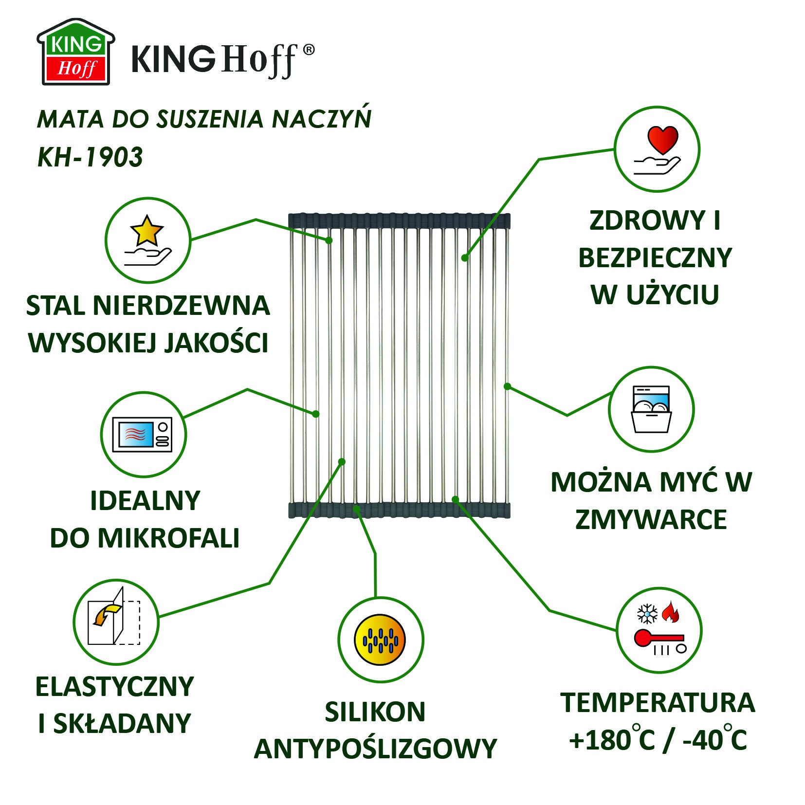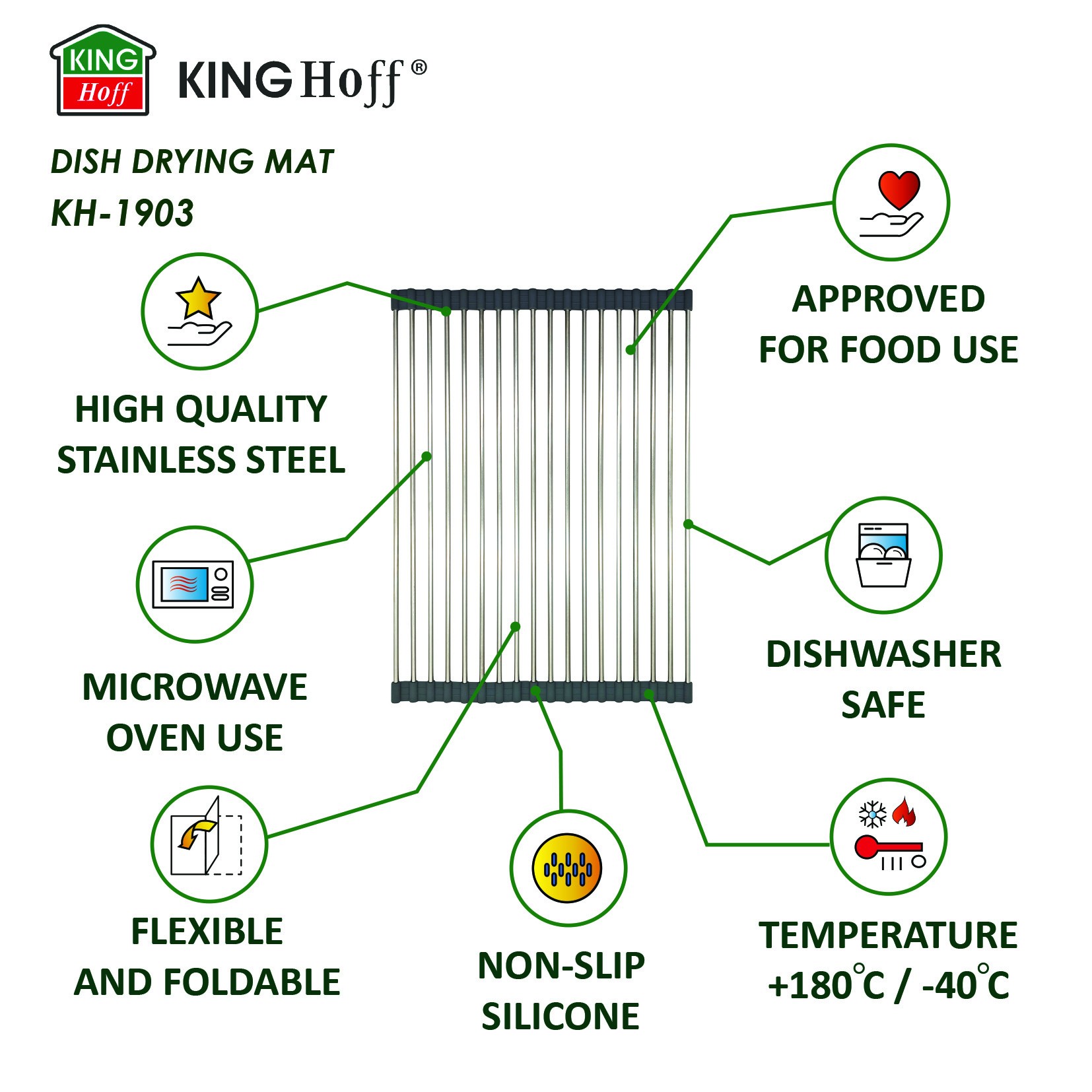 KINGHoff KH-1903 to praktyczna, trwała i estetyczna mata, która usprawni codzienne prace kuchenne. Niezastąpiona, gdy liczy się funkcjonalność i oszczędność przestrzeni!