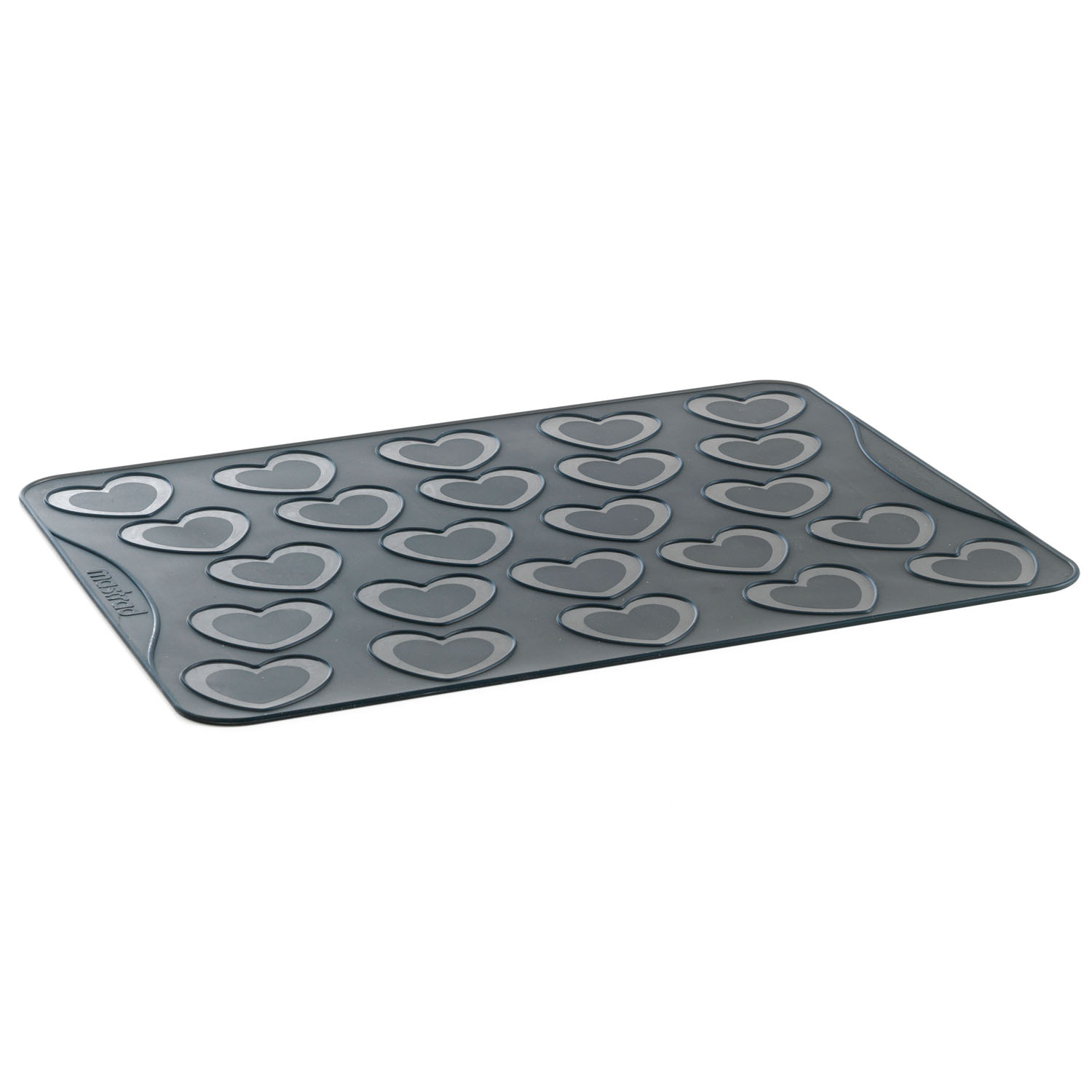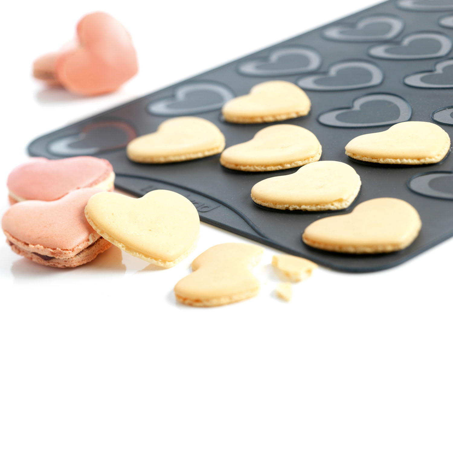Silikonowa mata do makaroników w kształcie serca na 24 ciasteczka! Idealne makaroniki łatwiejsze do upieczenia niż Ci się zdaje. Mata ułatwi precyzyjne nałożenie odpowiednich porcji ciasta, upieczenie, a następnie zdjęcie. Na macie rozrysowane są wyraźne okręgi, dzięki którym łatwo nałożyć ciasto makaronikowe, a lekko uniesione krawędzie zapobiegają rozpłynięciu się masy w trakcie pieczenia. Matę można również używać na gładkiej stronie do pieczenia ciasteczek, bez, ptysi i innych wypieków. Silikon jest wytrzymały na niskie i wysokie temperatury (od -40 do 220 stopni). Można myć w zmywarce.