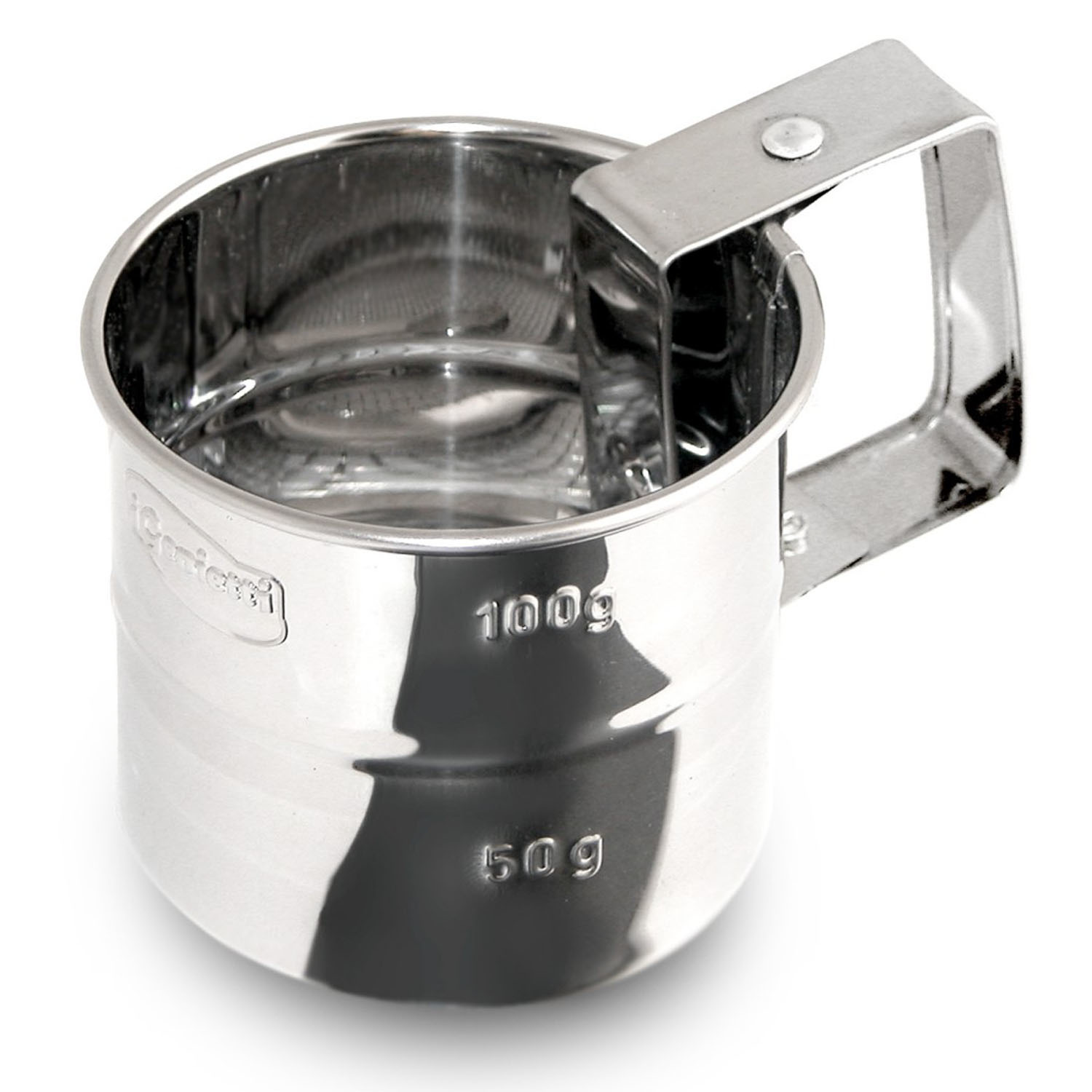 Mini sitko ze stali nierdzewnej do równomiernego rozprowadzania cukru pudru, kakao, przypraw, mąki. Można przy jego pomocy obsypać biszkopty, ciastka, ciasta, lody czy cappuccino. Można myć w zmywarce. Produkt może nosić ślady produkcyjne, które w żaden sposób nie wpływają na jego walory użytkowe. Materiał: stal nierdzewna. Wymiary netto: 7×5,8x10cm. Waga brutto: 0,048kg. Waga netto: 0,046kg.