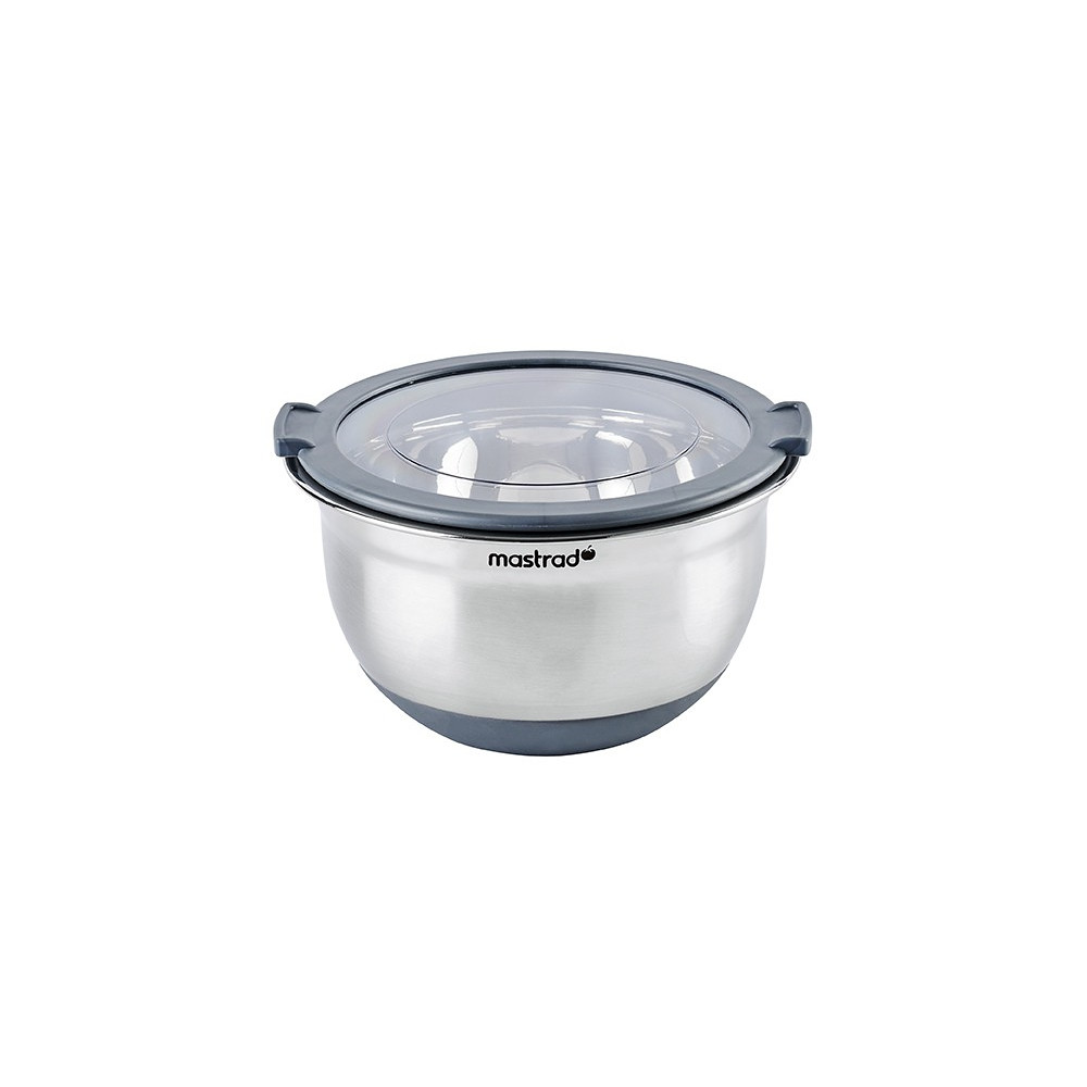 Miska ze stali nierdzewnej z antypoślizgowym dnem zapewnia stabilność w trakcie mieszania, może też zastąpić salaterkę. Przezroczysta pokrywka ułatwia przechowywanie, bez problemu sprawdzisz też jej zawartość. Podziałka wewnątrz umożliwia odmierzanie. Brzeg i uchwyty pokrywki zostały wykonane z silikonu. Materiał: stal nierdzewna, silikon. Pojemność: 1,5L. Opakowanie: opaska, szary karton.