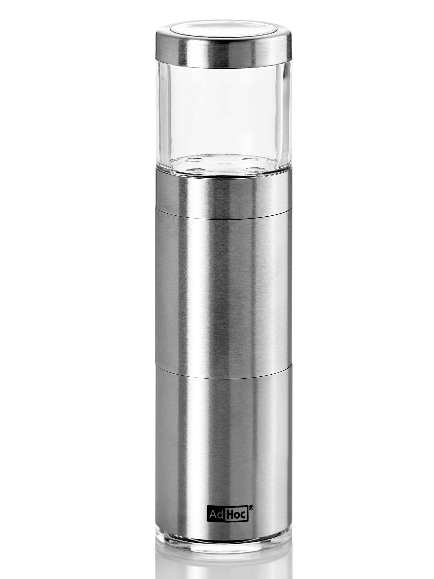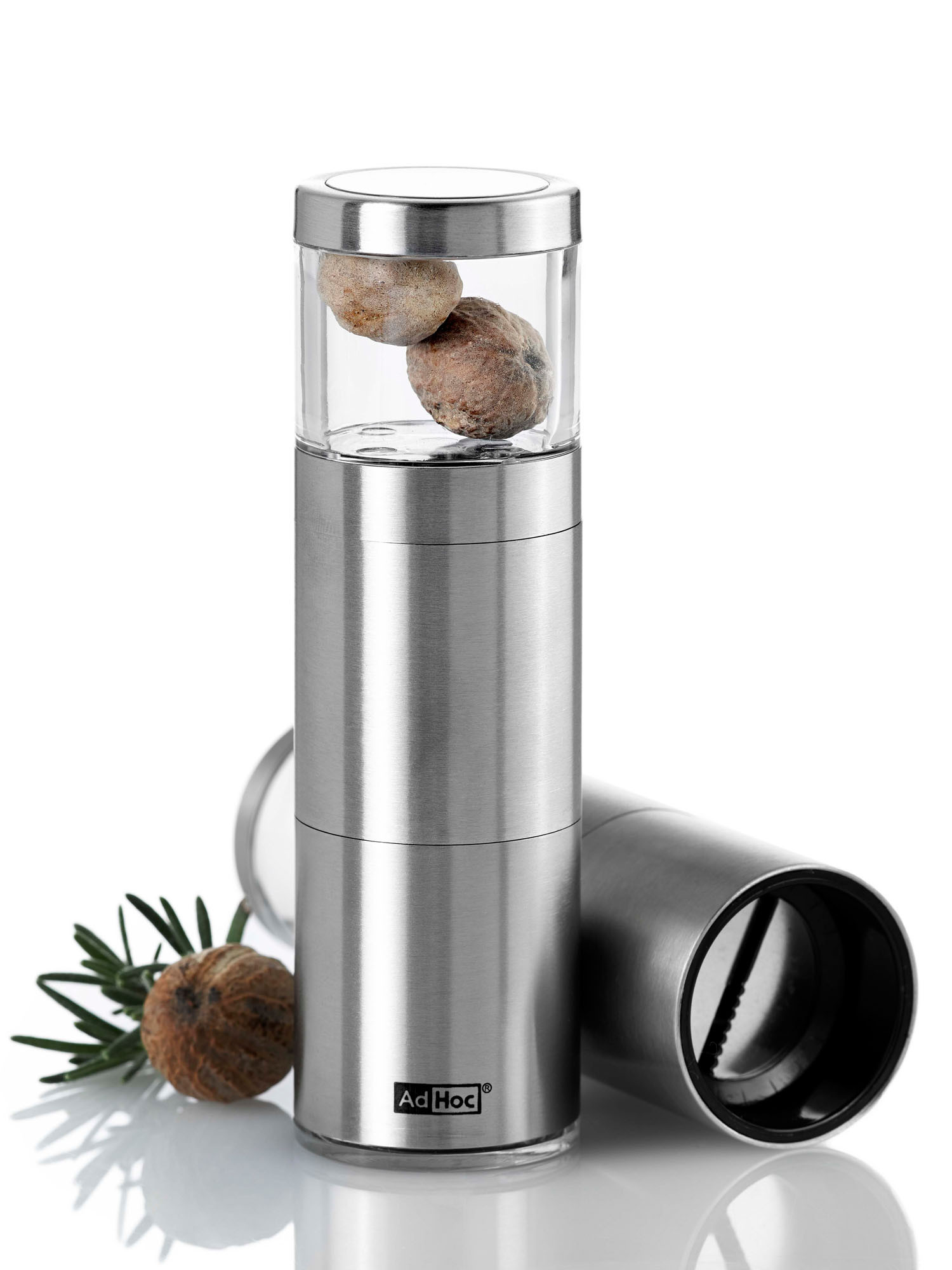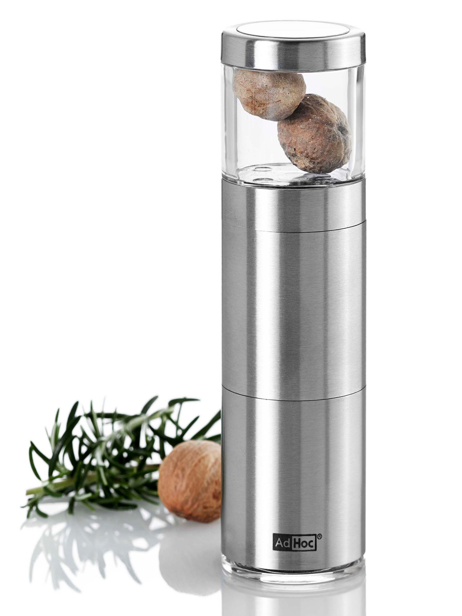 Jest to eleganckie i nowoczesne narzędzie. Wąska sylwetka oszczędza kuchenną przestrzeń. Ostre, fototrawione ostrze z łatwością ścina gałkę muszkatołową. Młynek można bardzo łatwo otworzyć dzięki połączeniu bagnetowemu. Gałka muszkatołowa jest z odpowiednią siłą dociskana przy pomocy sprężynowych wsporników. Kapselek na spodzie młynka zapewnia świeżość gałki muszkatołowej i czystość blatu. MUSKATINO może być czyszczone wyłącznie z zewnątrz przy pomocy wilgotnej ściereczki, a następnie wytarte. Nie należy zanurzać młynka w wodzie lub jakimkolwiek innym płynie. Ostrze może być czyszczone przy użyciu małej szczoteczki. Produkt został zaprojektowany przez AdHoc Design Team. Materiał: Stal nierdzewna/akryl. Wymiary: wysokość – 12,5cm, średnica – 3,8cm.