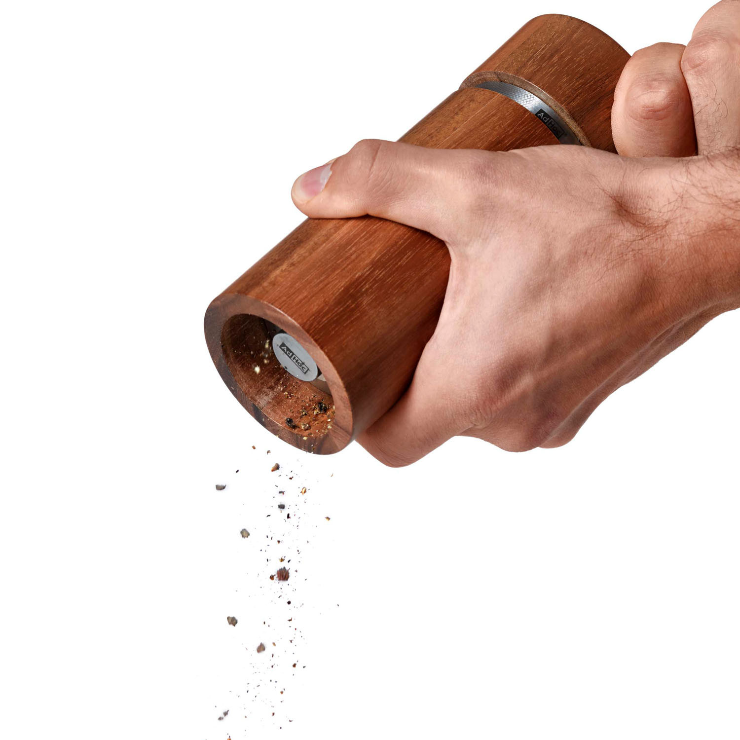 Specjalnie powiększone, odporne na zużycie i korozję ceramiczne żarna CeraCutXL® zapewniają 4 krotnie wyższą efektywność mielenia objawiającą się w większej ilości zmielonego pieprzu lub soli. Młynek umożliwia dostosowanie grubości mielenia za pomocą 8 stopniowej skali zaczynającej się od drobnego proszku do grubszych kawałków. Dzięki dużym żarnom możliwe jest mielenie dużych ziaren pieprzu o średnicy 5mm. Młynek można bardzo łatwo napełnić zdejmują pokrętło. Produkt został zaprojektowany przez AdHoc Design Team. Materiał: Drewno akacjowe/stal nierdzewna/ceramiczne żarna CeraCutXL®. Wymiary: wysokość – 19cm, średnica – 6,5cm.